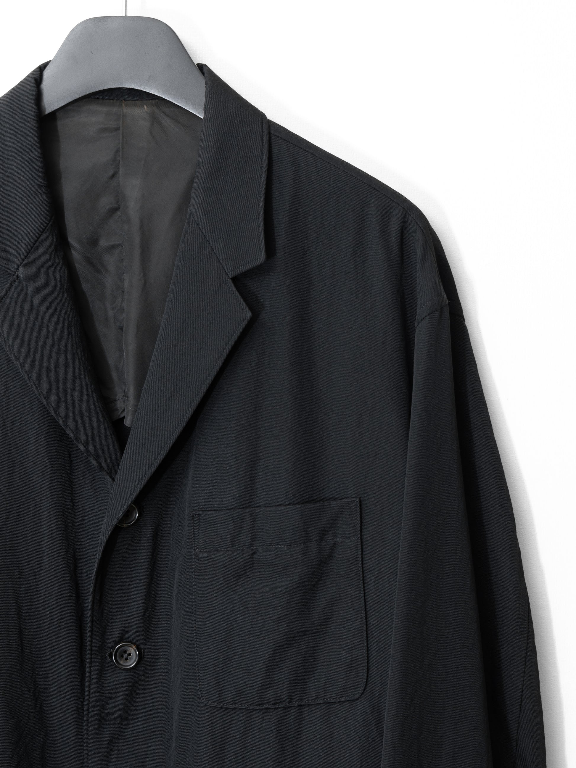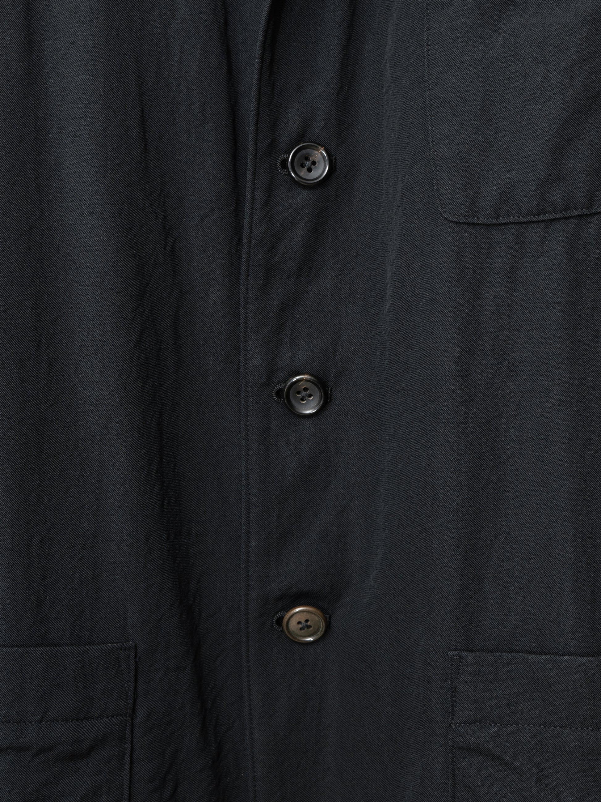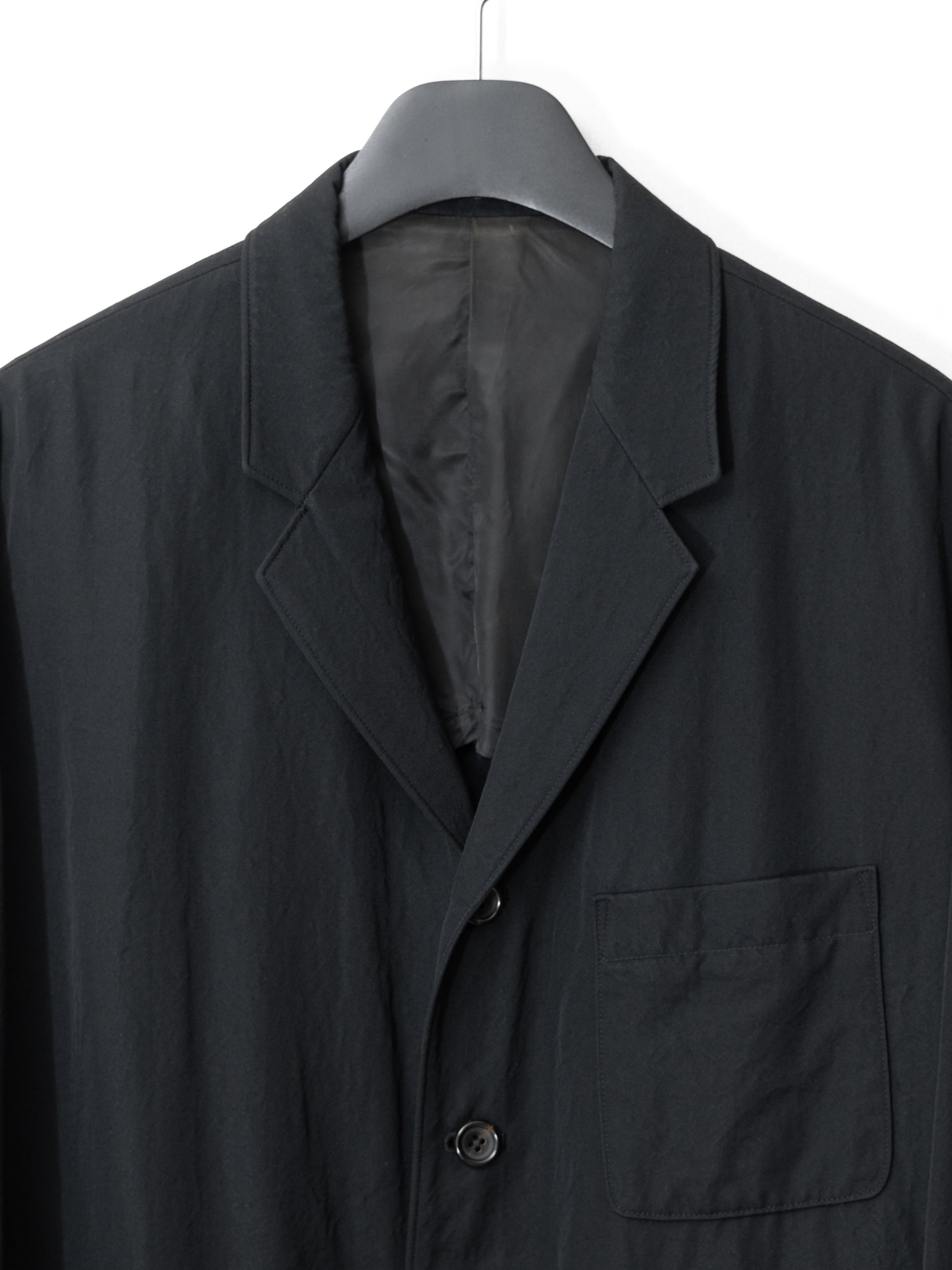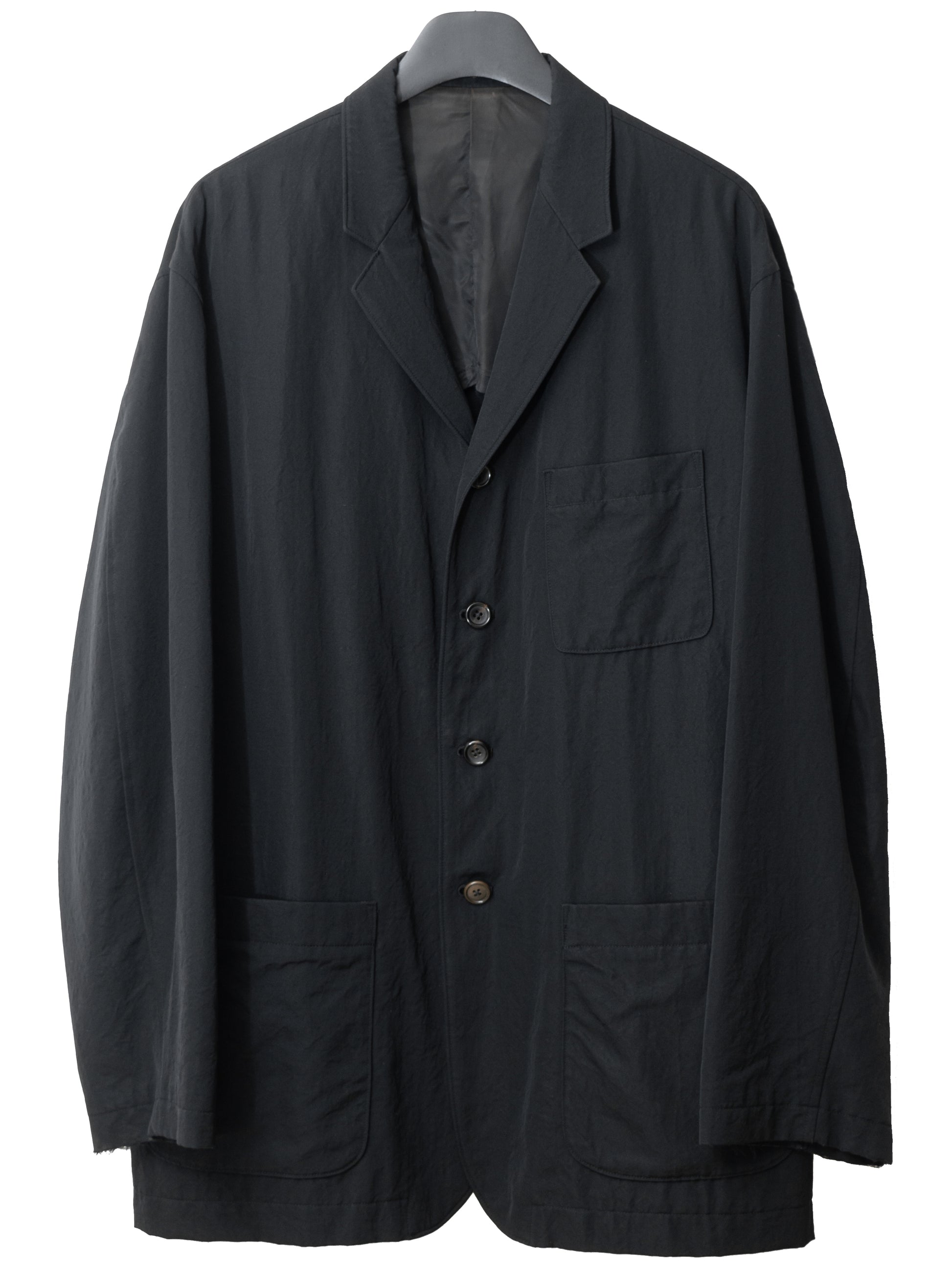 relaxed cut tailored jacket in mediumweight wool gabardine. features dropped shoulders, notch lapels, rounded patch pockets, and a ventless back. finished with horn buttons and partial interior lining in silky rayon.
