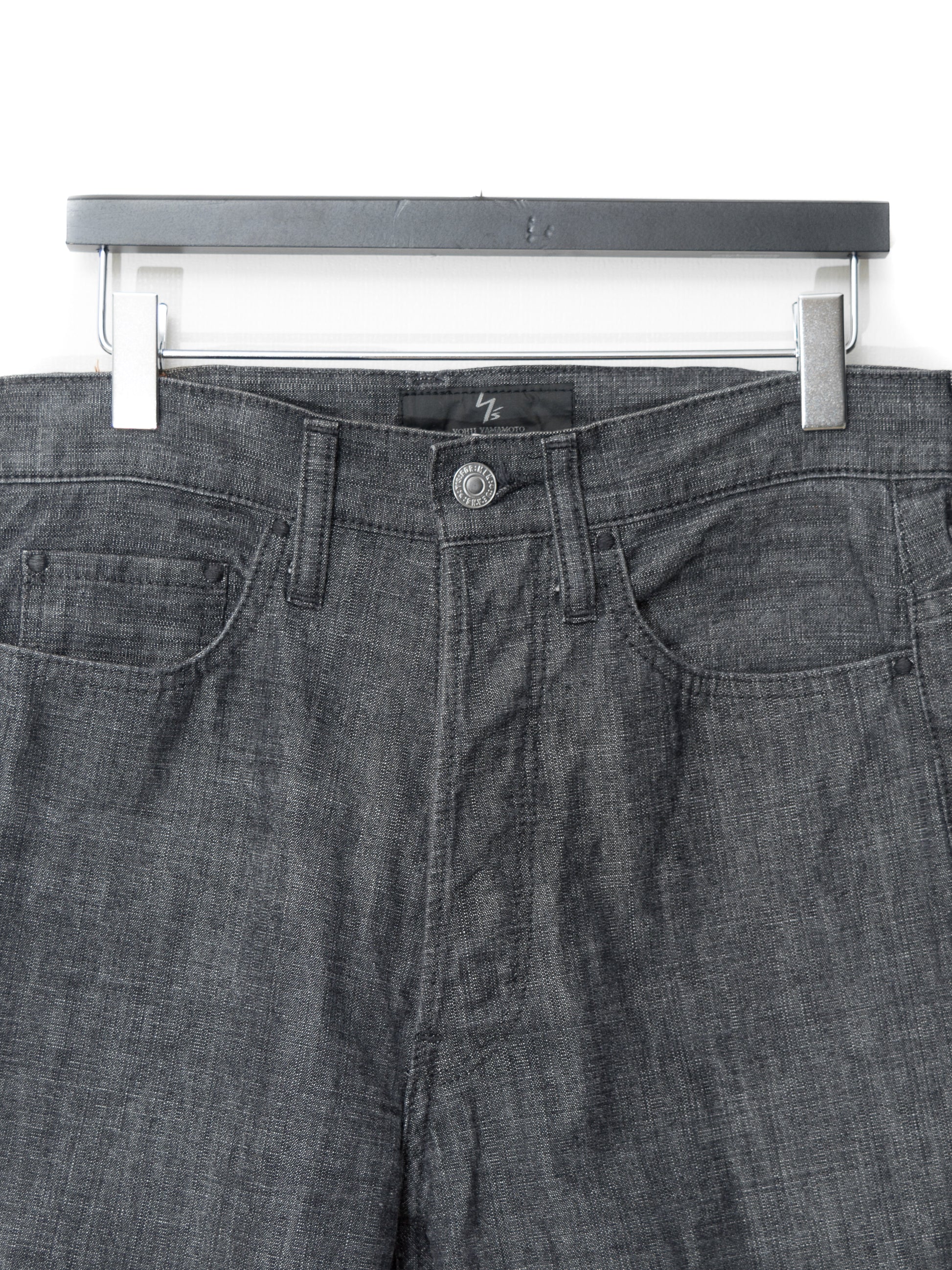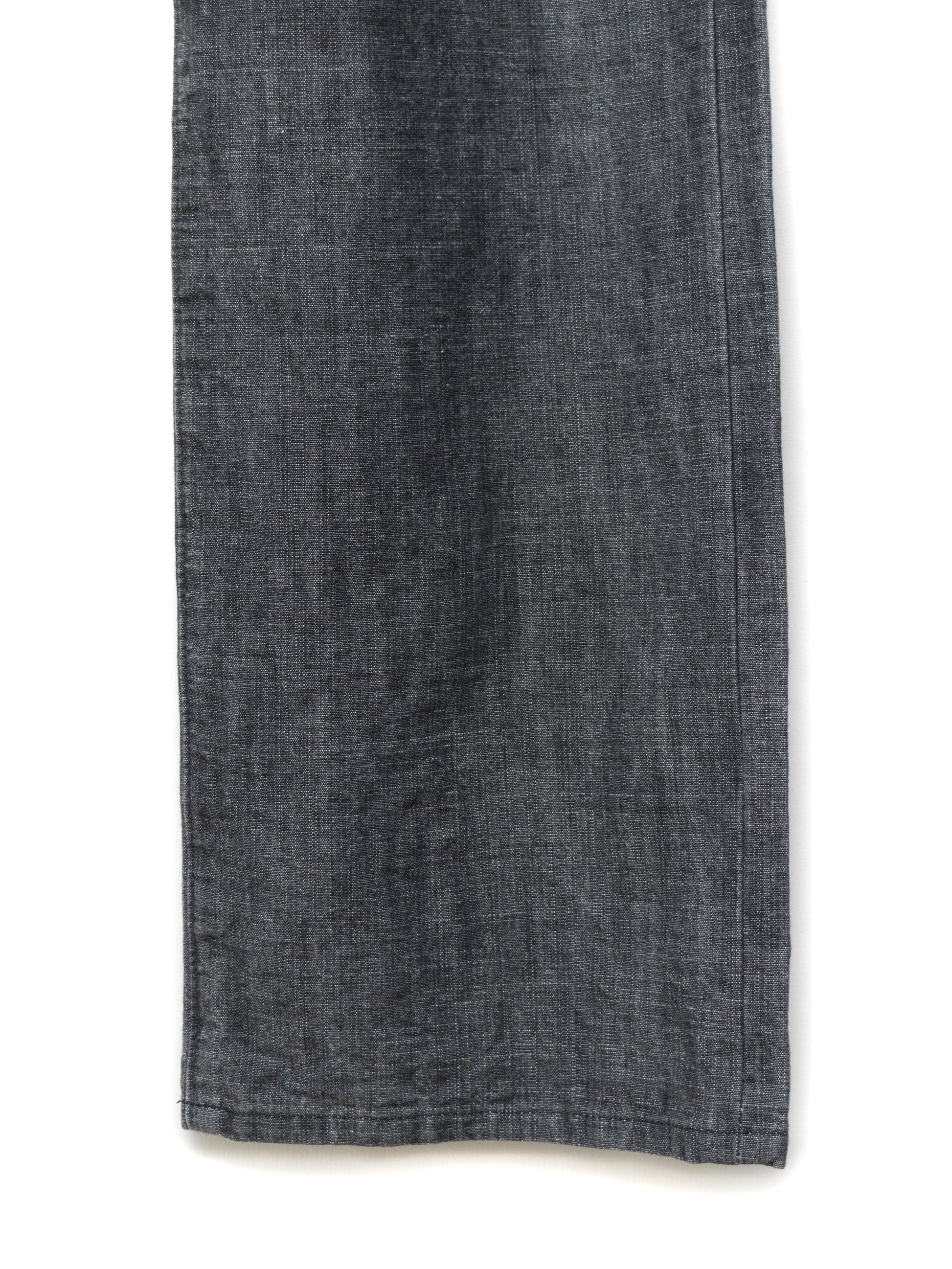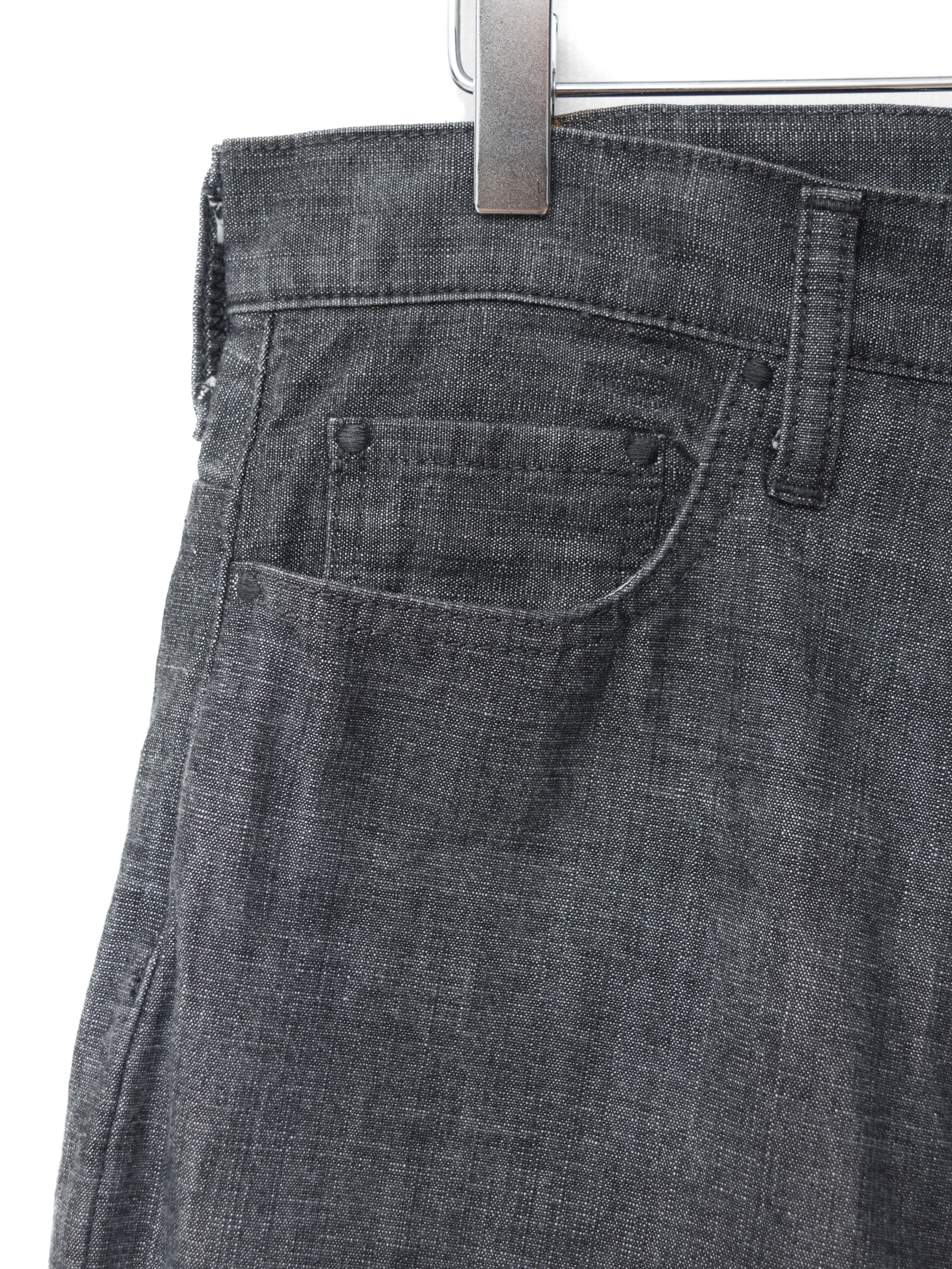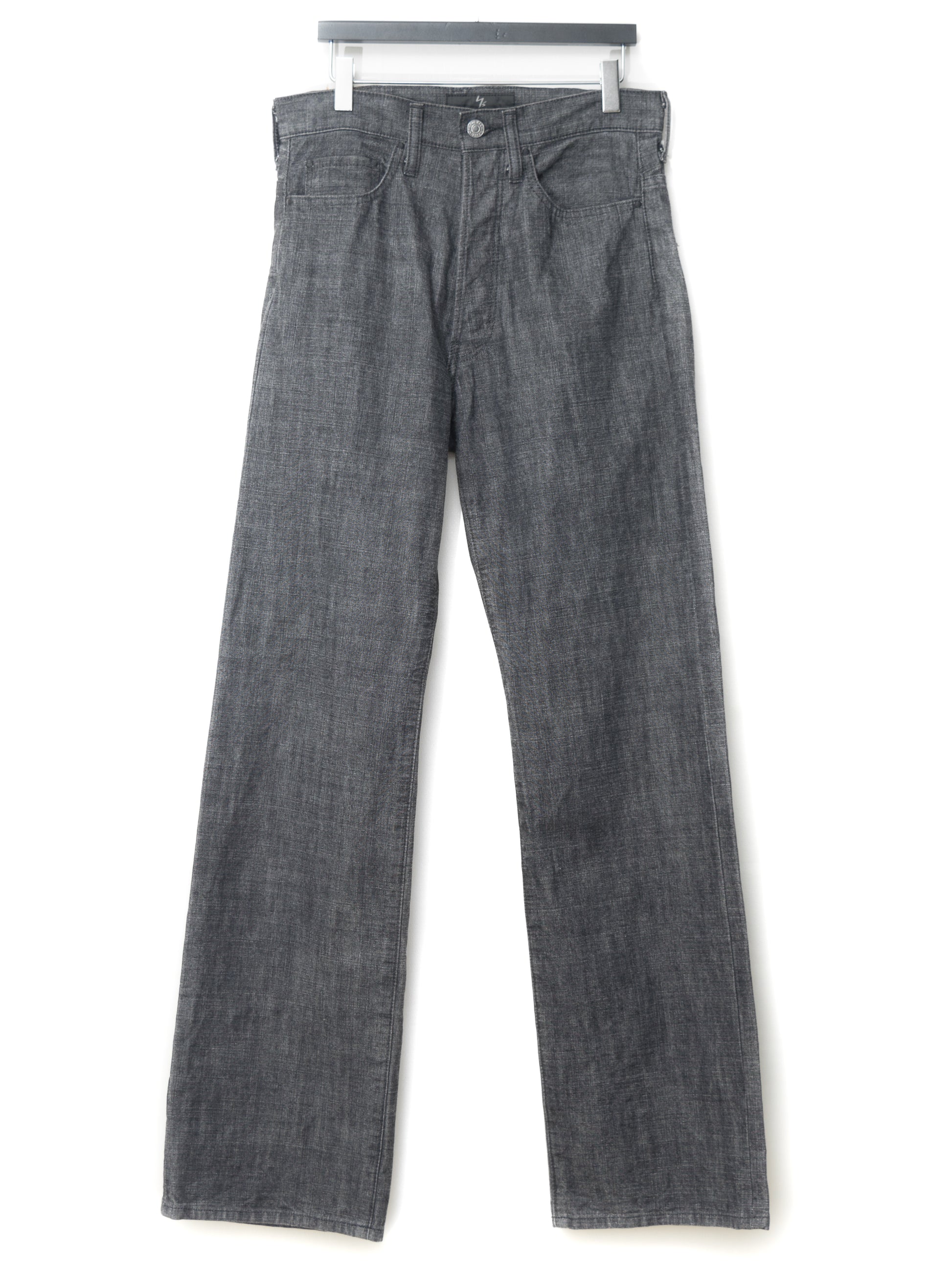 slim fit 5 pocket jeans in mediumweight cotton. dense plain weave with an irregular texture and denim-like toughness. high waisted cut with a fitted hip and a straight, full length tube leg. features a 5 button fly, right coin pocket, embroidered rivets, and a patinated back leather patch. with collection label logo. tagged a size 3 (medium) and waist 30 but fits on the smaller side. recommended for slim builds with a 28-29 waist. understated everyday essential with a sleek cut.