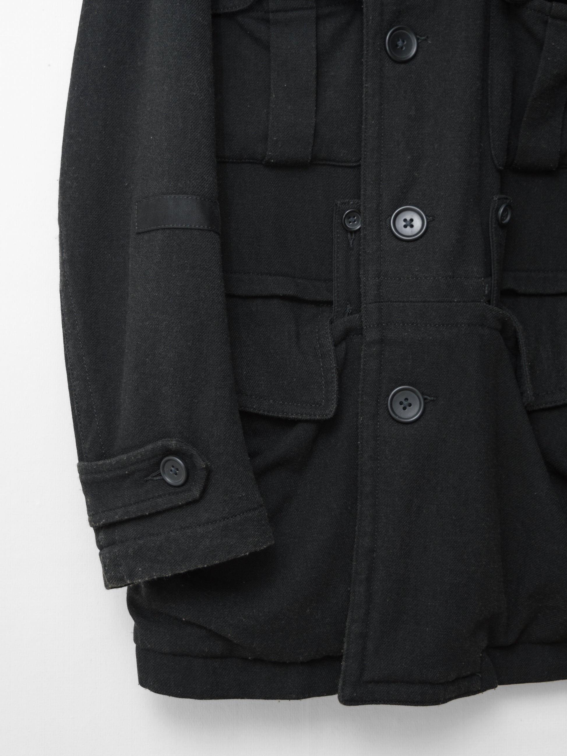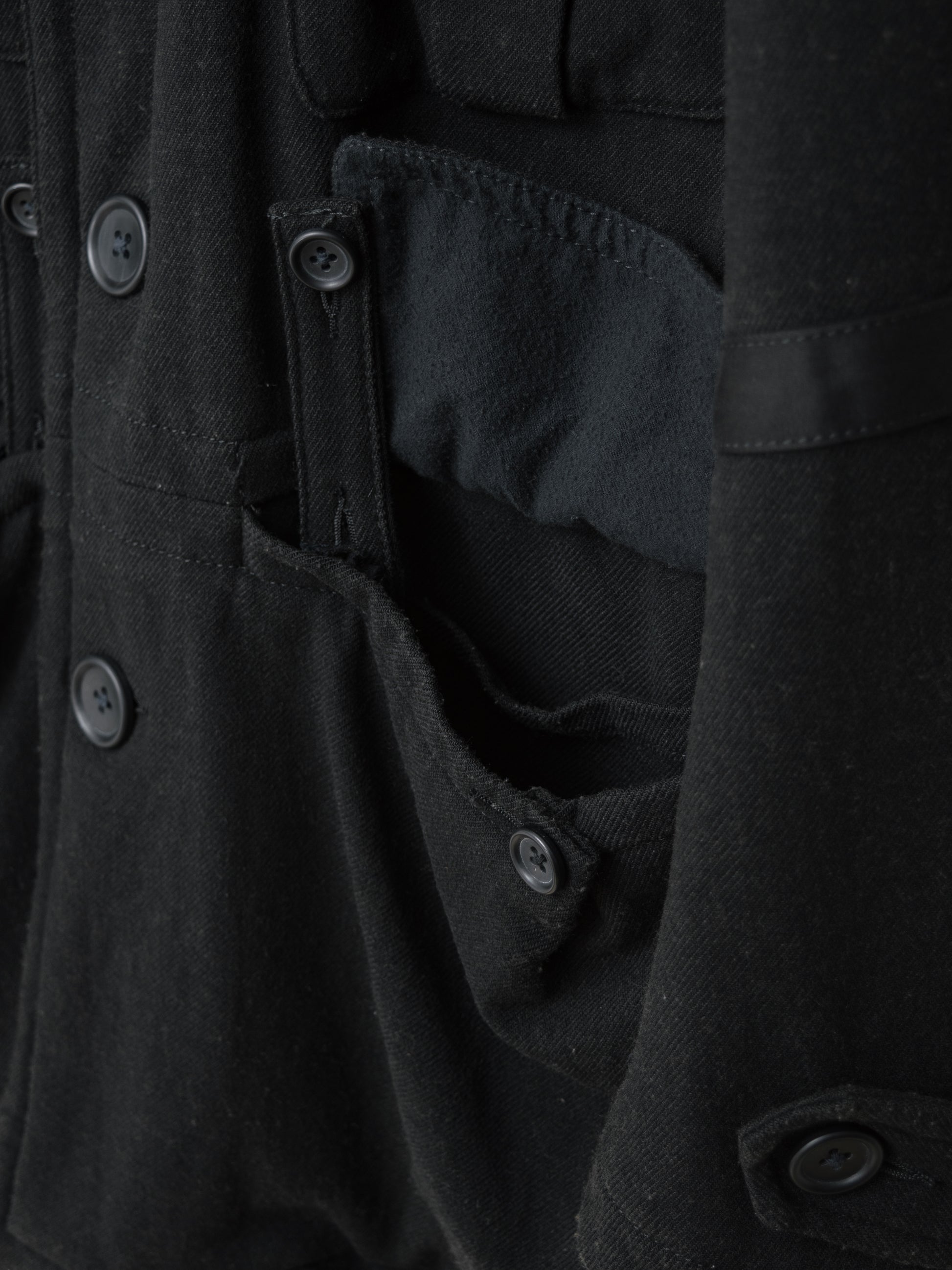 relaxed cut half coat in heavyweight wool nylon. features a convertible reefer collar, removable storm guard, removable belt and beltloops, single back vent, cargo pockets at chest and sides, inner chest and utility pockets. finished with full interior lining in poly rayon fleece (body) and cupro poly (sleeves).