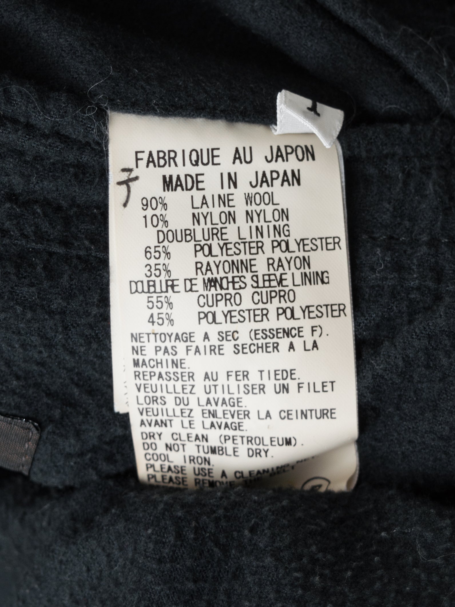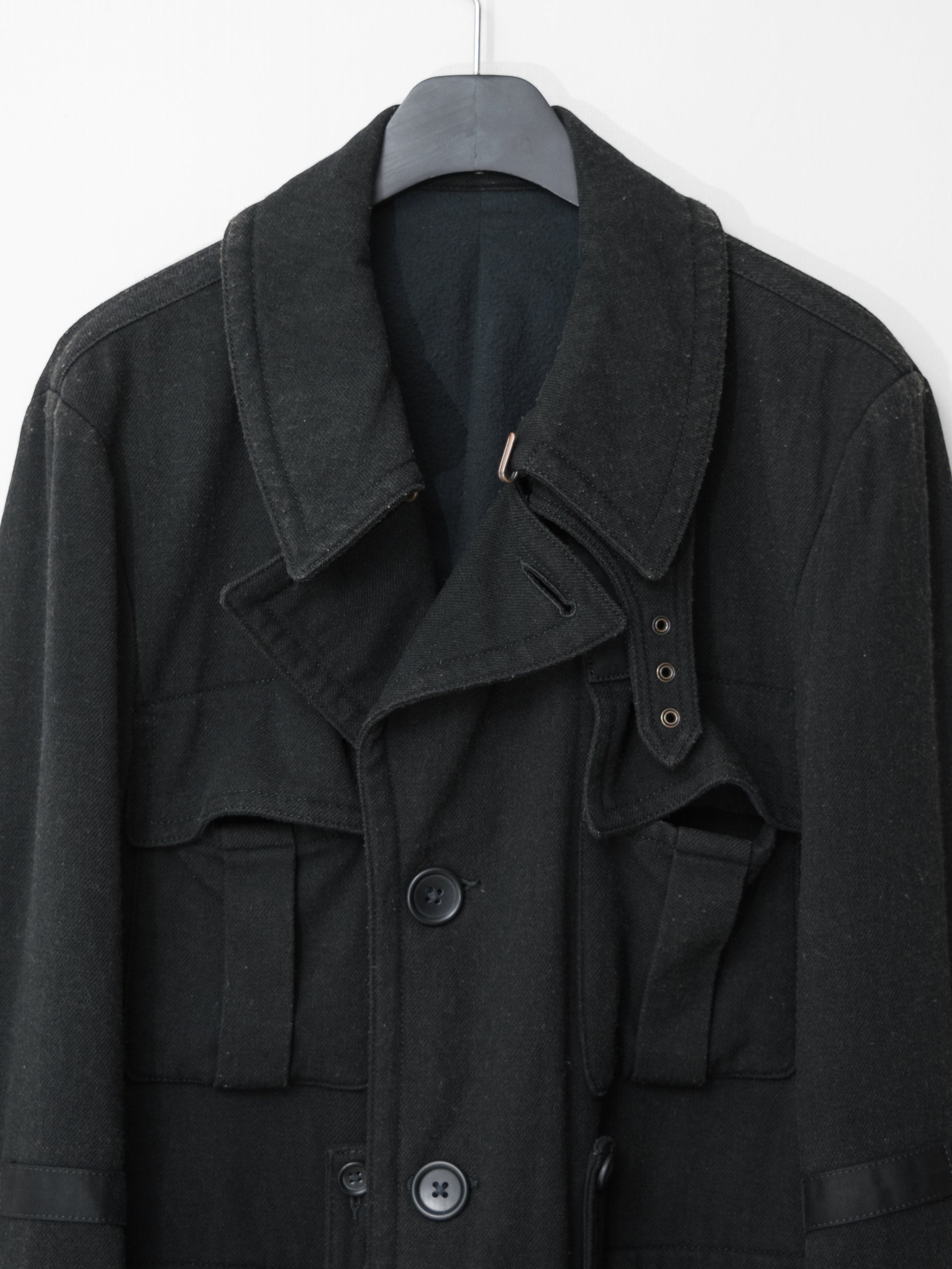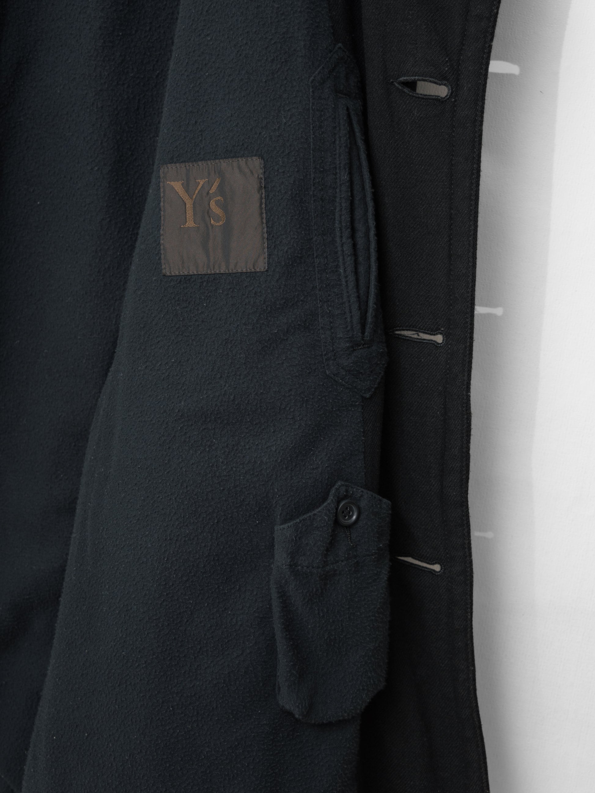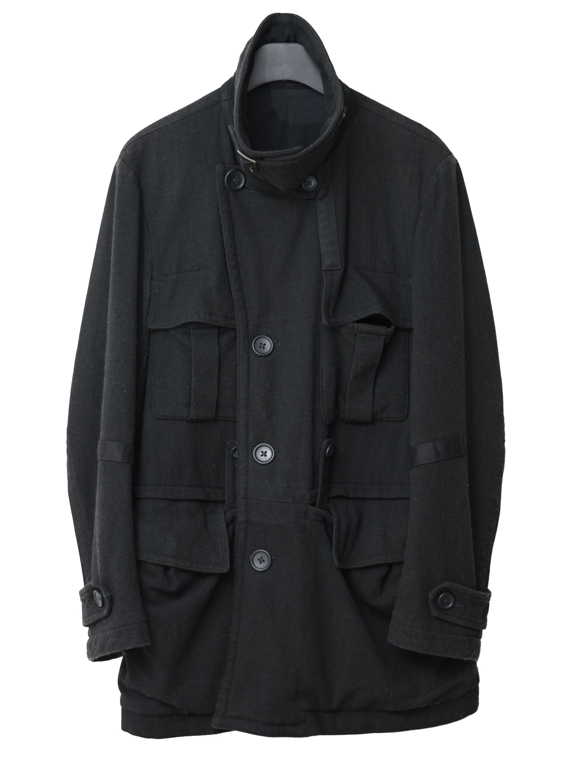 standout piece of fall outerwear from the final era of y's for men. every possible aspect of the construction has been considered and designed without compromise, which is something you simply will not find in the mainstream fashion market today. its stern military appearance is subdued by the soft fabric which drapes with ease for an exceptional, lived in sensibility. outstanding cut that is defined by the collar, then follows the slightly structured shoulder line to drop down into a perfectly articulated sleeve. the convertible reefer collar allows for many ways to style, anchored by a large hook clasp and complete with beautiful reinforcement stitching at the stand and facing. the removable storm guard is complete with a metal buckle and eyelets to frame the neck and head in dramatic fashion. the flaps of the cargo pockets and chest and sides are cut at an angle which add dimension and an off kilter sensibility, and their facings are cut from the same fleece material as the inner lining. very complex construction happening around the waist, with removable buttoned beltloops (the side beltloops are slightly longer and feature 2-tier buttonholes for varying adjustment lengths, all keyhole buttonholes), pocket flaps sewn underneath the double welt to protrude out from the inside (flaps can be tucked away for a subdued look), double compartments (pocket-in-pocket), and a bagged out construction with a button adjustable, two-tier 'darted' shape. the interior features a full fleece lining which hugs the body and gently supports the outer structure of the garment, and the sleeves are finished in the classic silky smooth cupro with unmatched quality. other finishing details include wide set topstitching at the seamlines across the shoulder, back, and sleeve seams, which in particular are lined up perfectly with the scalpular back darts reinforced by a high density satin-like strip of fabric also seen at the inner sleeve and front neck darts. beautiful patination of the metal hardware throughout. they simply don't make clothes like this anymore. tagged size 1 (extra small - a rare size for yohji menswear), but fits like a regular small. also recommended for slim mediums.