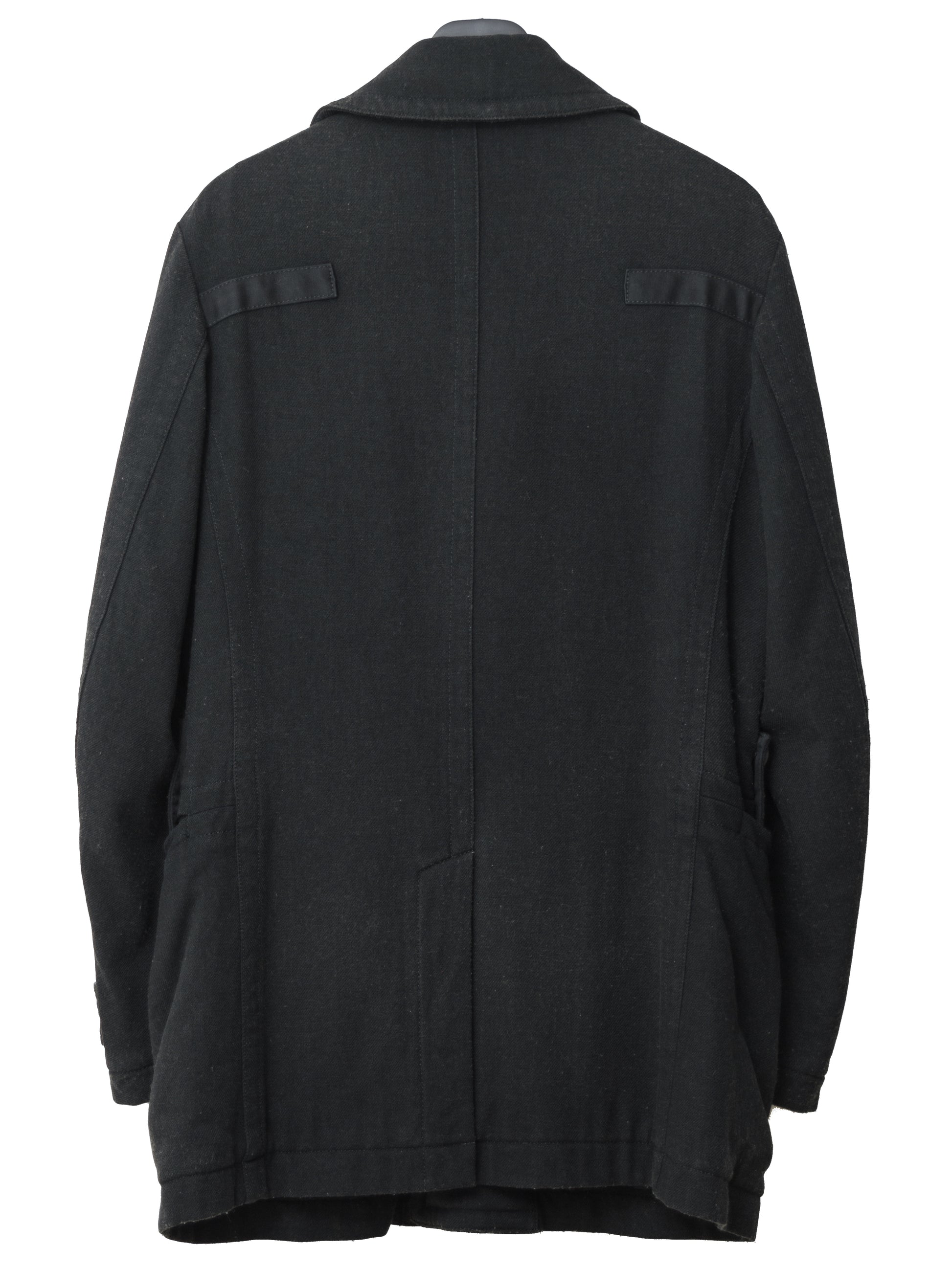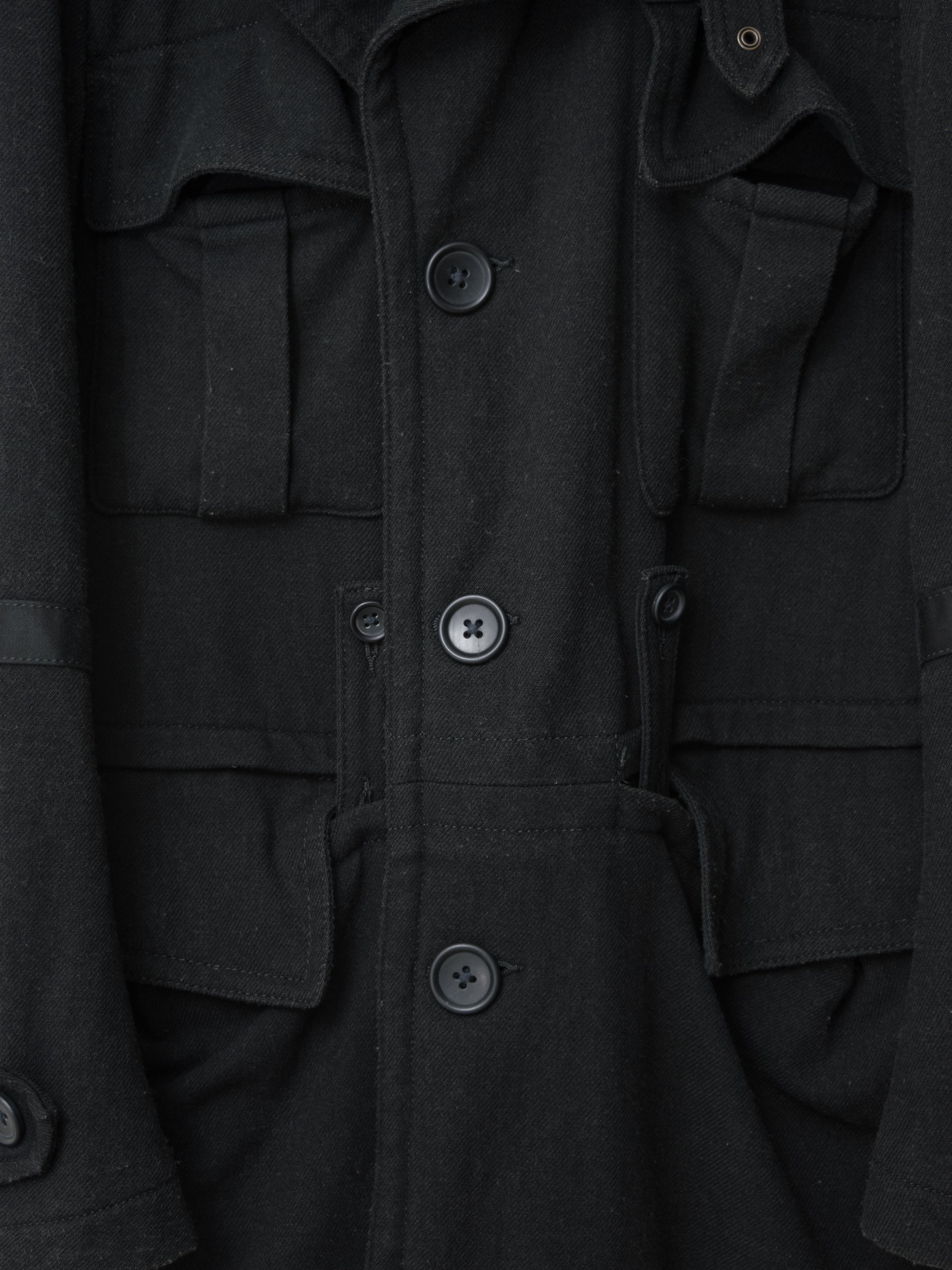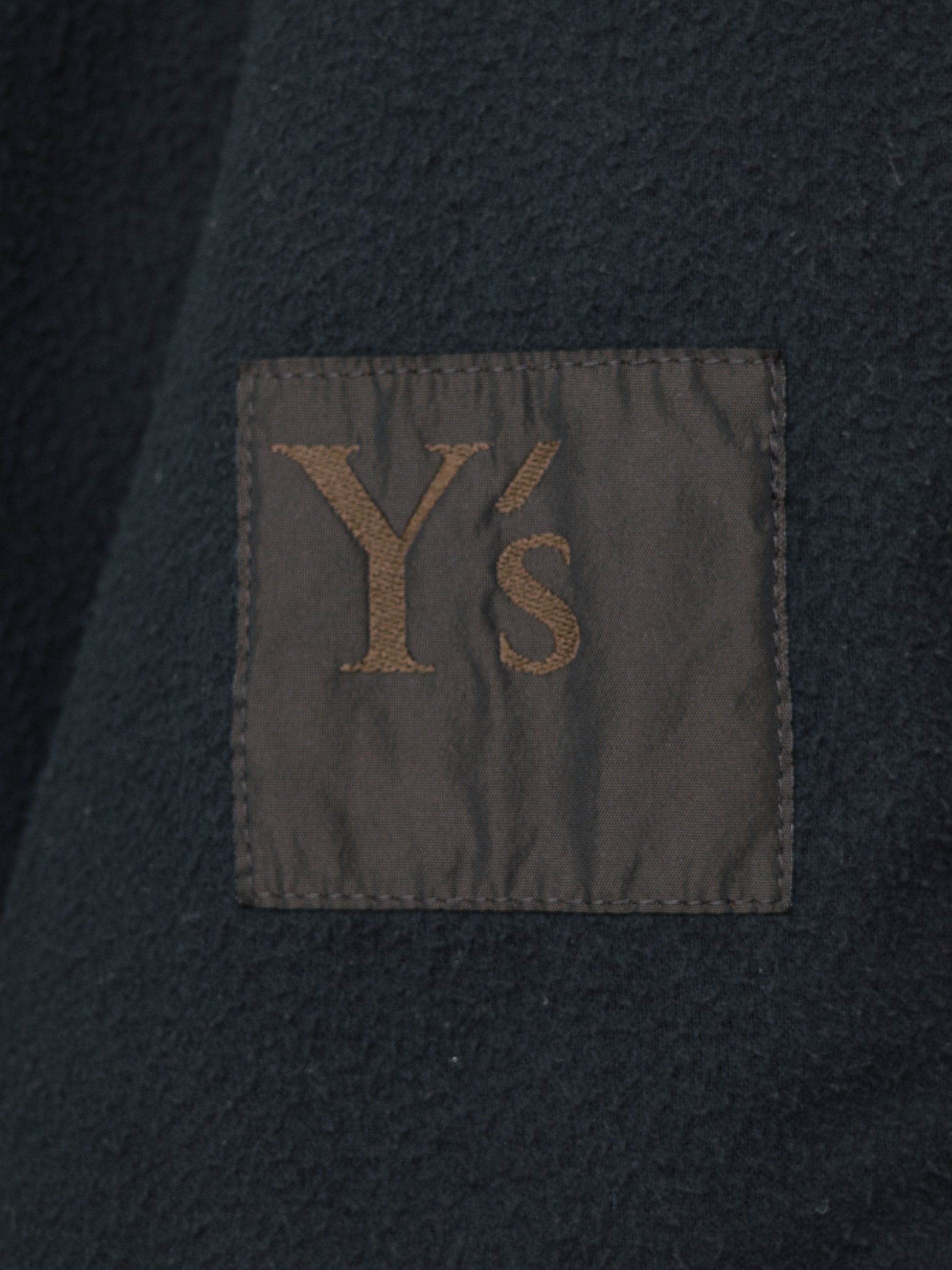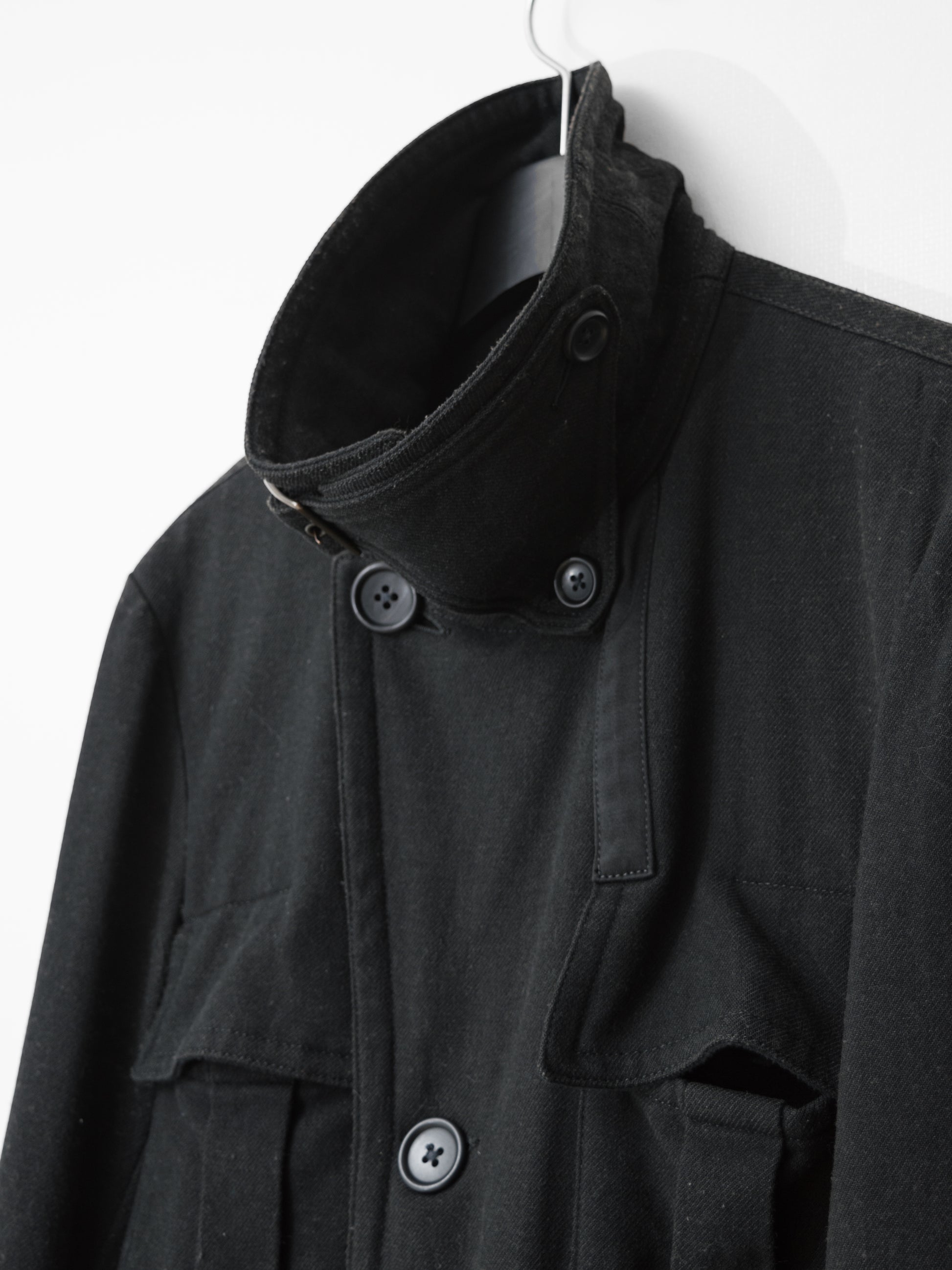 standout piece of fall outerwear from the final era of y's for men. every possible aspect of the construction has been considered and designed without compromise, which is something you simply will not find in the mainstream fashion market today. its stern military appearance is subdued by the soft fabric which drapes with ease for an exceptional, lived in sensibility. outstanding cut that is defined by the collar, then follows the slightly structured shoulder line to drop down into a perfectly articulated sleeve. the convertible reefer collar allows for many ways to style, anchored by a large hook clasp and complete with beautiful reinforcement stitching at the stand and facing. the removable storm guard is complete with a metal buckle and eyelets to frame the neck and head in dramatic fashion. the flaps of the cargo pockets and chest and sides are cut at an angle which add dimension and an off kilter sensibility, and their facings are cut from the same fleece material as the inner lining. very complex construction happening around the waist, with removable buttoned beltloops (the side beltloops are slightly longer and feature 2-tier buttonholes for varying adjustment lengths, all keyhole buttonholes), pocket flaps sewn underneath the double welt to protrude out from the inside (flaps can be tucked away for a subdued look), double compartments (pocket-in-pocket), and a bagged out construction with a button adjustable, two-tier 'darted' shape. the interior features a full fleece lining which hugs the body and gently supports the outer structure of the garment, and the sleeves are finished in the classic silky smooth cupro with unmatched quality. other finishing details include wide set topstitching at the seamlines across the shoulder, back, and sleeve seams, which in particular are lined up perfectly with the scalpular back darts reinforced by a high density satin-like strip of fabric also seen at the inner sleeve and front neck darts. beautiful patination of the metal hardware throughout. they simply don't make clothes like this anymore. tagged size 1 (extra small - a rare size for yohji menswear), but fits like a regular small. also recommended for slim mediums.