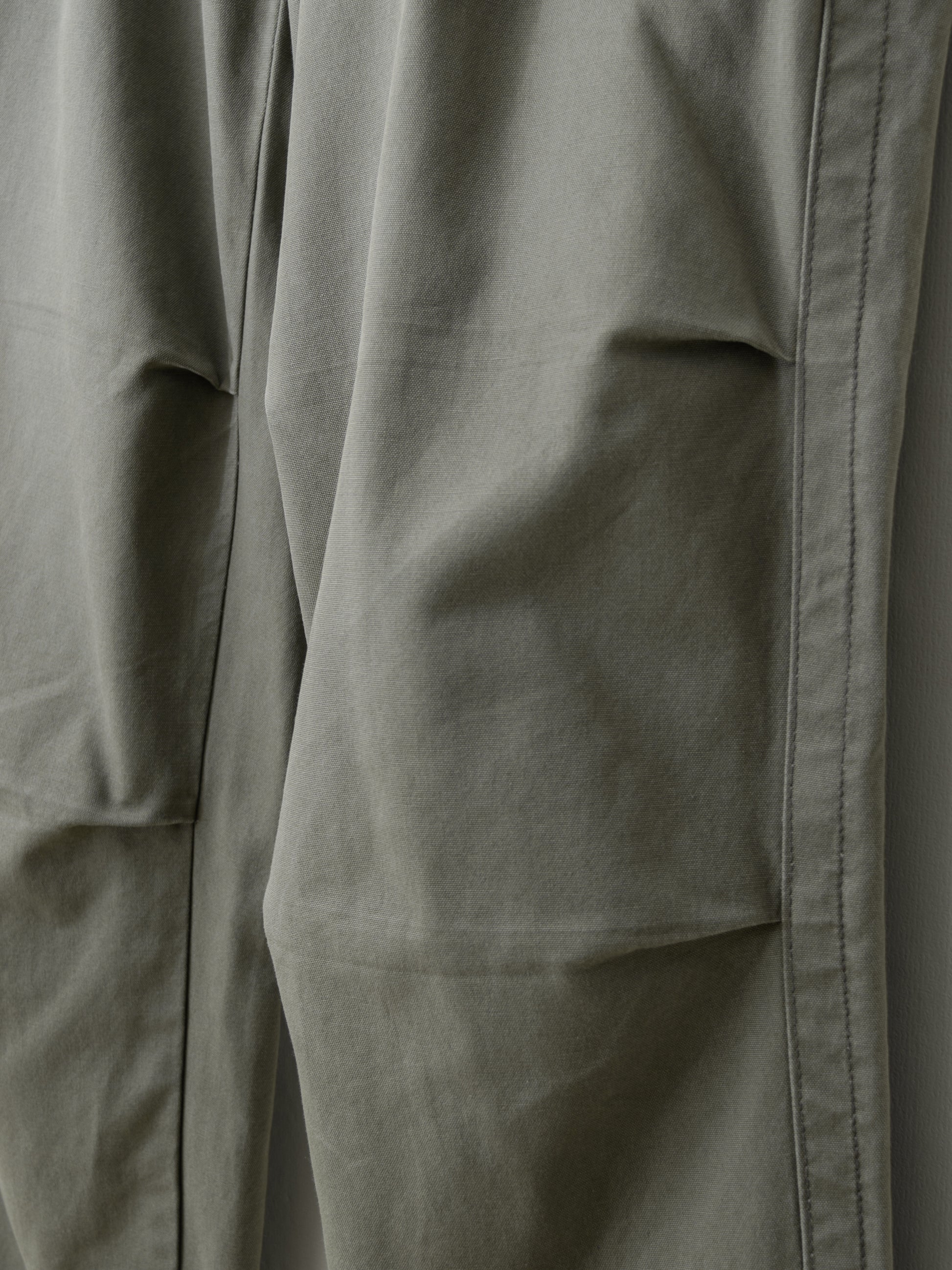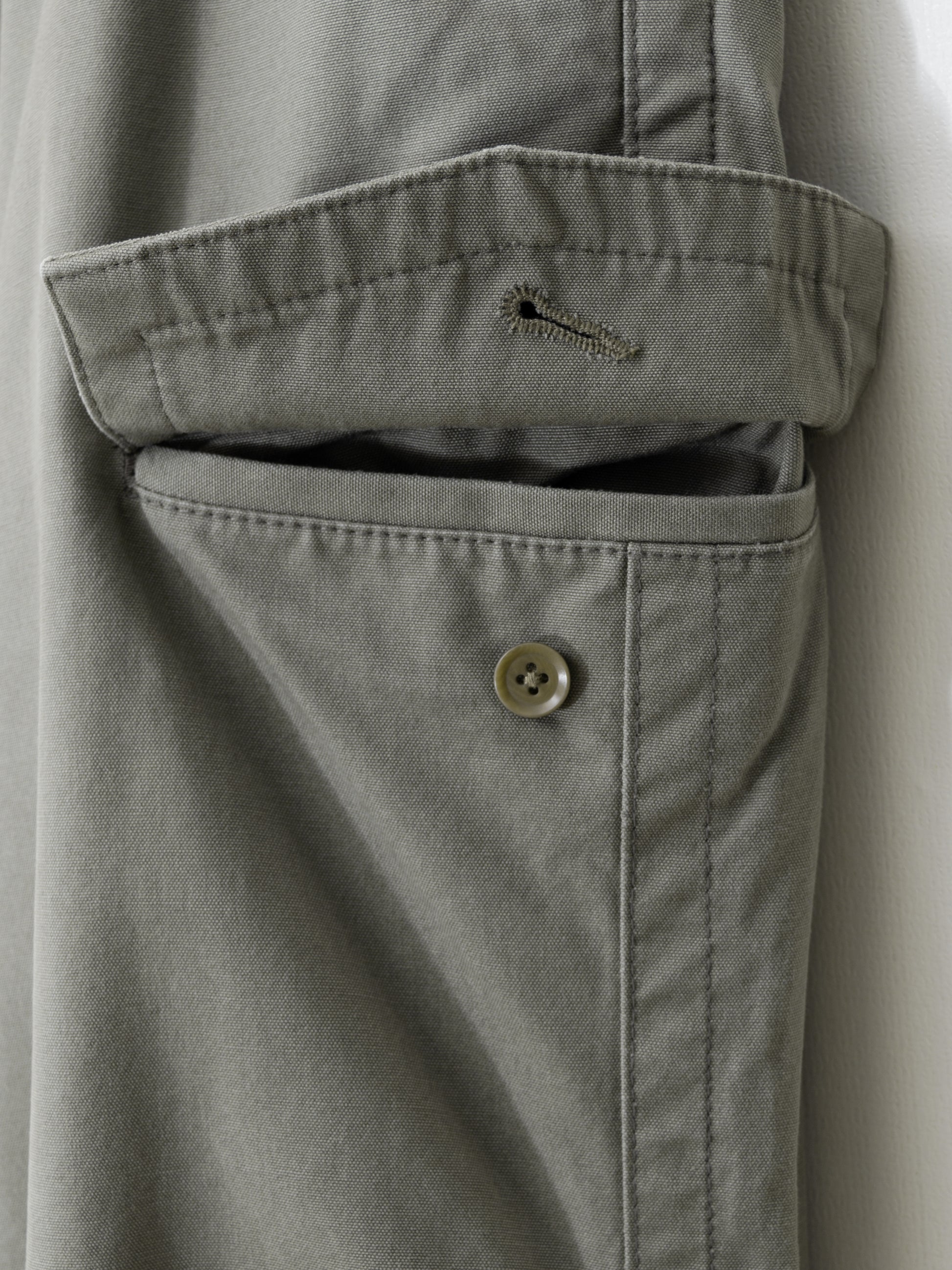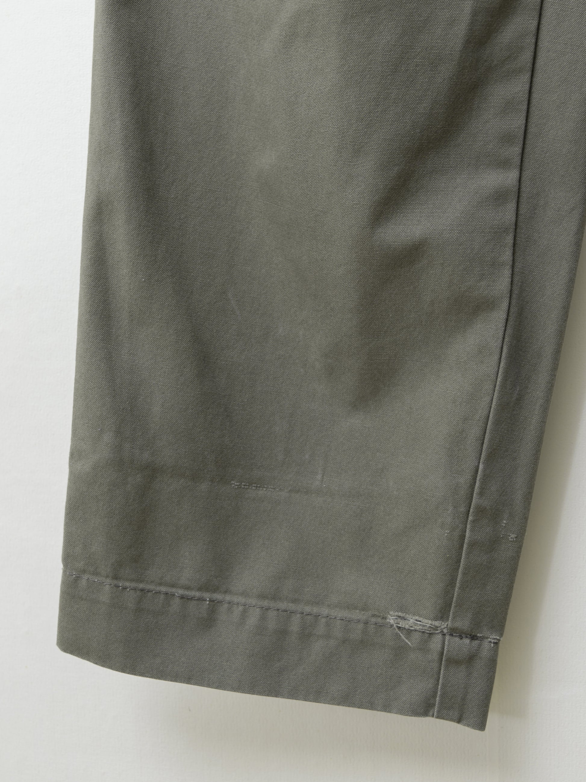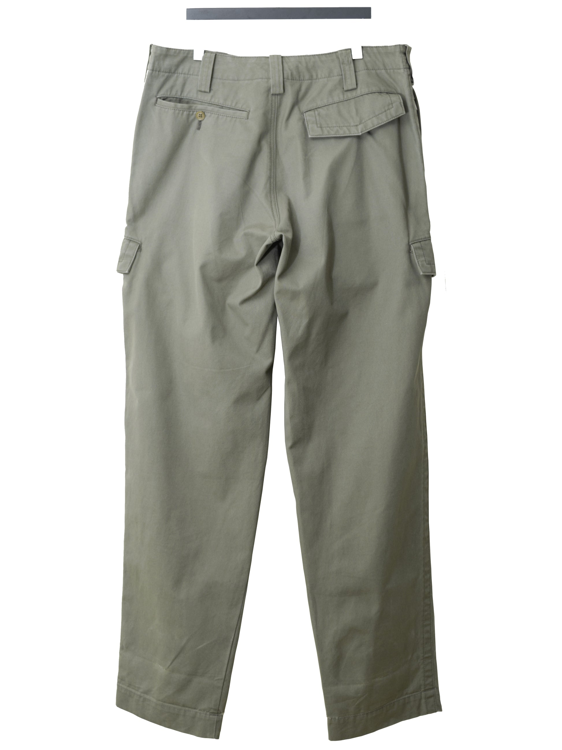 a standard model pant from y's for men throughout the mid - late '00s. classic iteration in a robust yet well worn in olive drab cotton with a slight sage green tint that pairs universally with a variety of colors. classic yohji cut that separates it from the rest, with a slouchy silhouette that falls effortlessly off the waist. the long rise allows it to be worn higher or lower on the body as preferred for a variety of looks. the double darted knees provide slight dimensional shaping of the lower leg. exquisite quality of sewing and construction, with robust yet discrete details such as the diagonally angled buttonholes and wide set topstitching at the side seams and pocket flaps. quite free sized in terms of waist, can accommodate anywhere between 30-34. the length is moreso what you should be looking at for sizing reference.