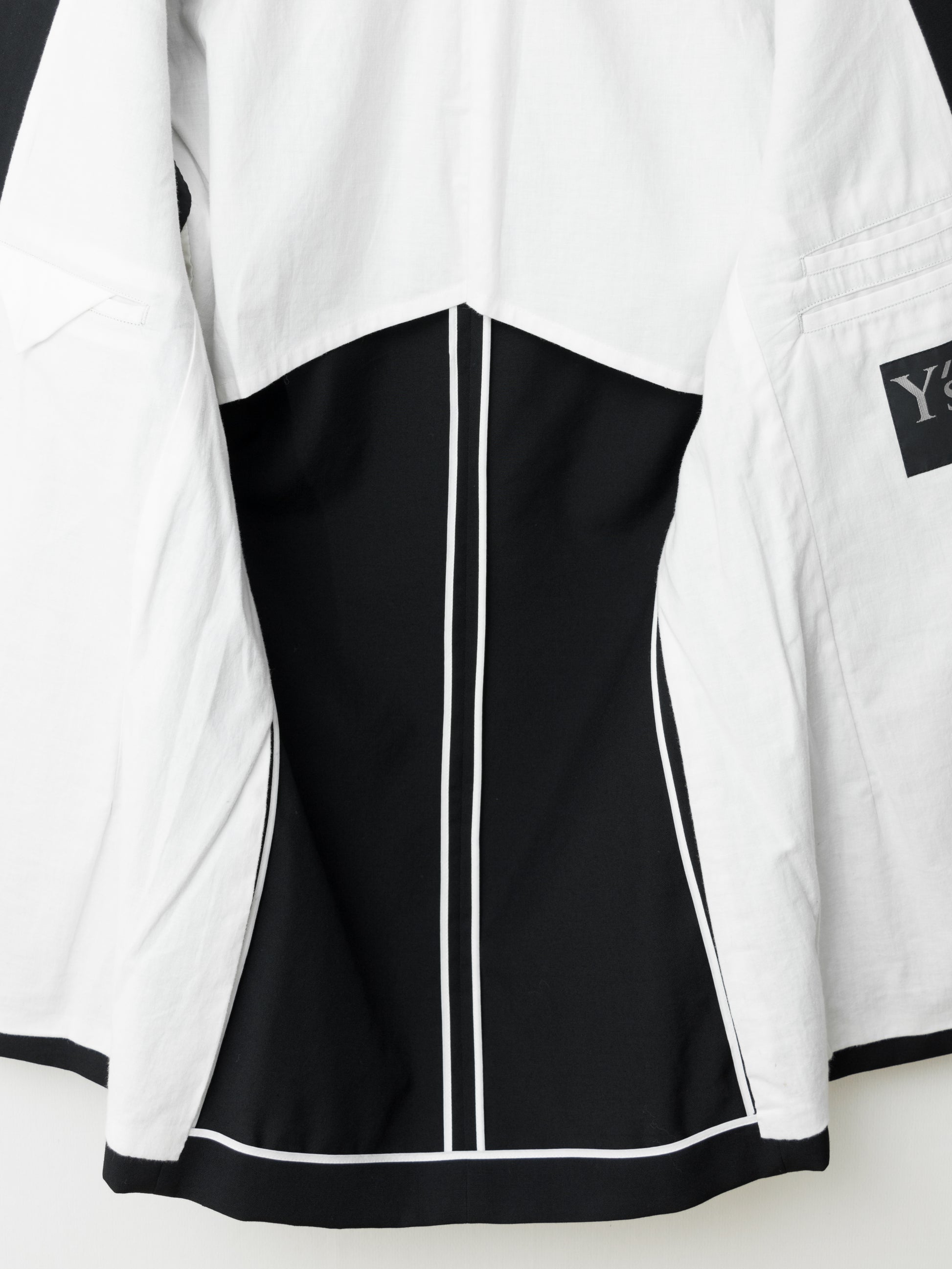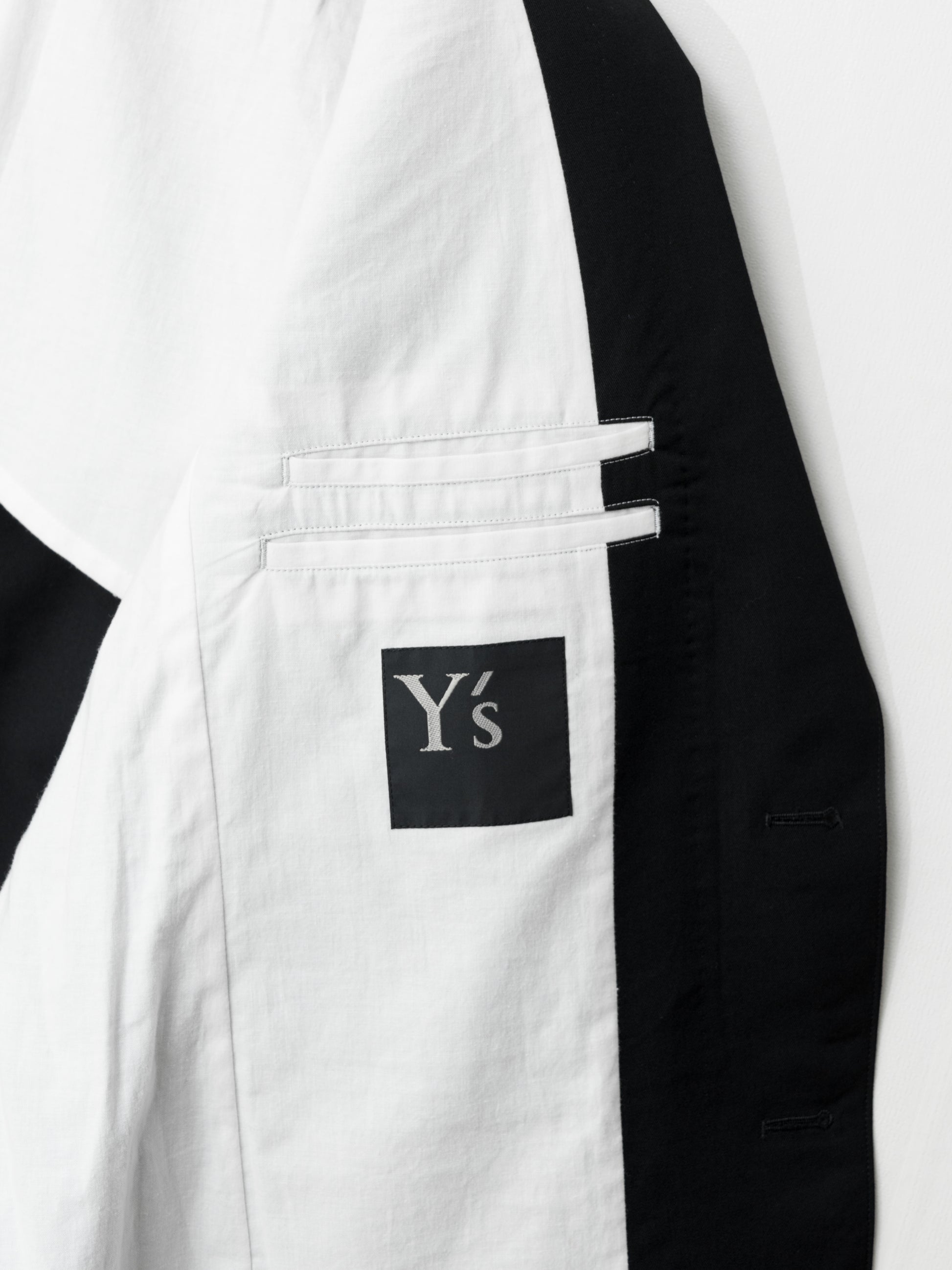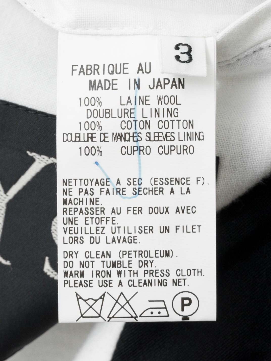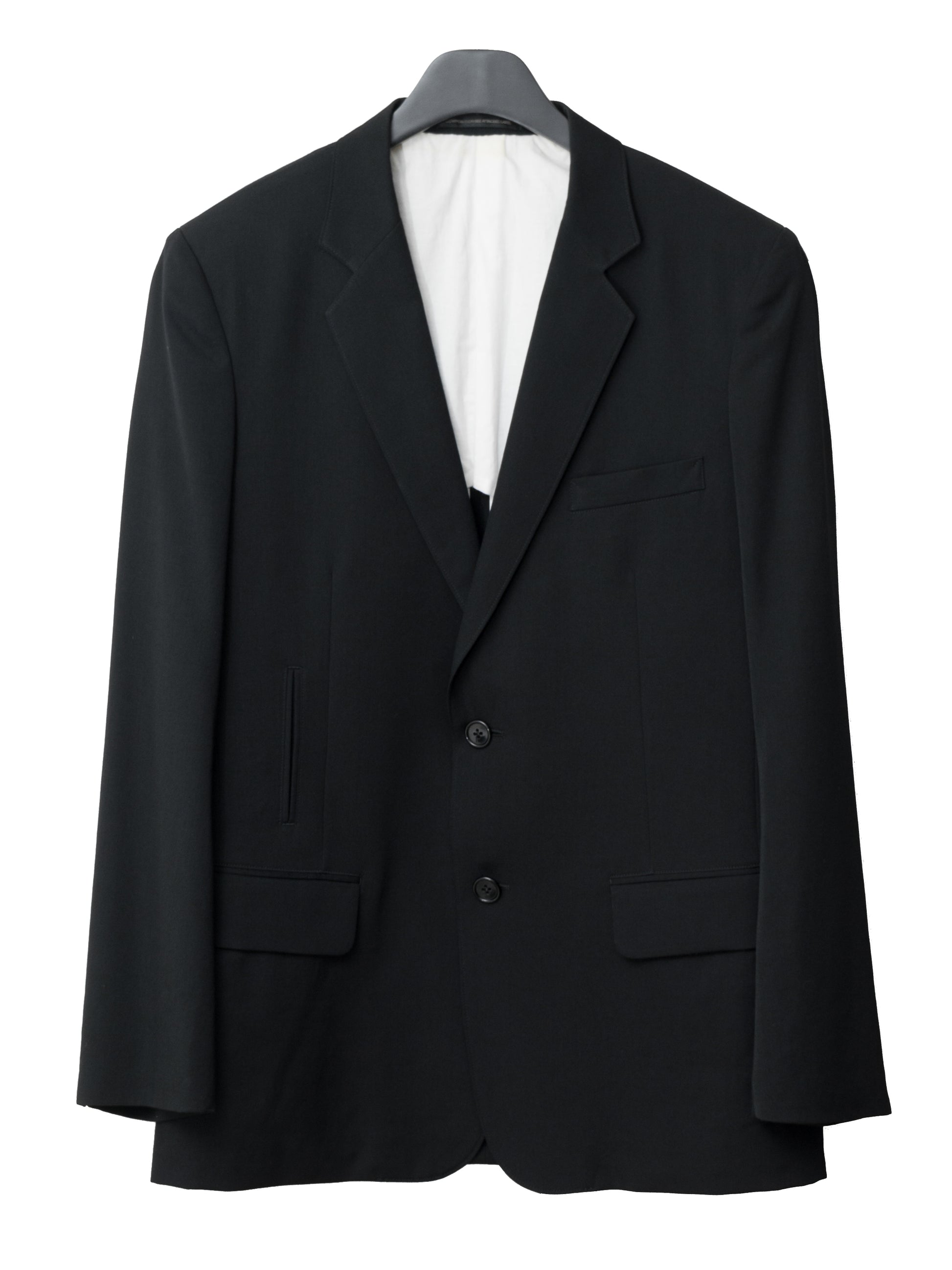from the very last collection of y's for men prior to its discontinuation. timeless piece of luxurious tailoring that represents the cut of the 2000s. the shoulders are sharply tailored with moderate padding for a structured look that is not bulky or dated, as can be in the case of items from the 80s or 90s. the body is cut with a slight boxy sensibility offering ease and comfort, while the sleeves are gently articulated for a sleek look. opting for a more contemporary 2 buttoned front with notch lapels front that feature a bone-colored felted facing at the collar stand, which is echoed by the gauzy white cotton lining that finishes the interior. the sleeves are finished with silky cupro in black for optimal comfort. the subtle interior glimpses of white during movement are particularly charming, also seen in the back facing of the outer flap pockets as well. the right side features a discrete double welt pocket for a bit of wit, allowing for extra storage or an attractive stance when the hand is placed inside. recommended for size medium.