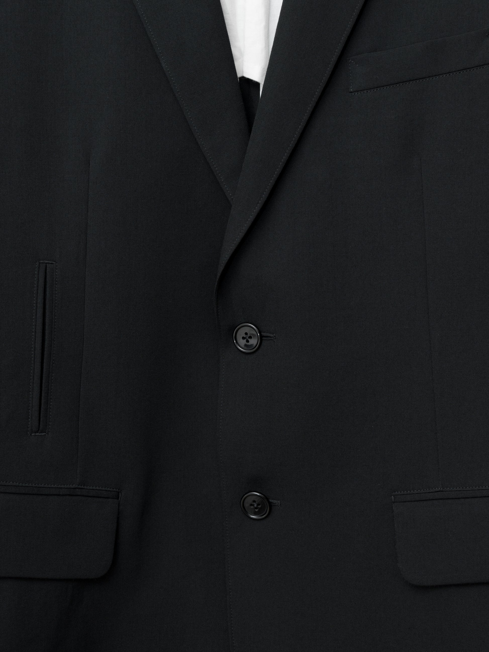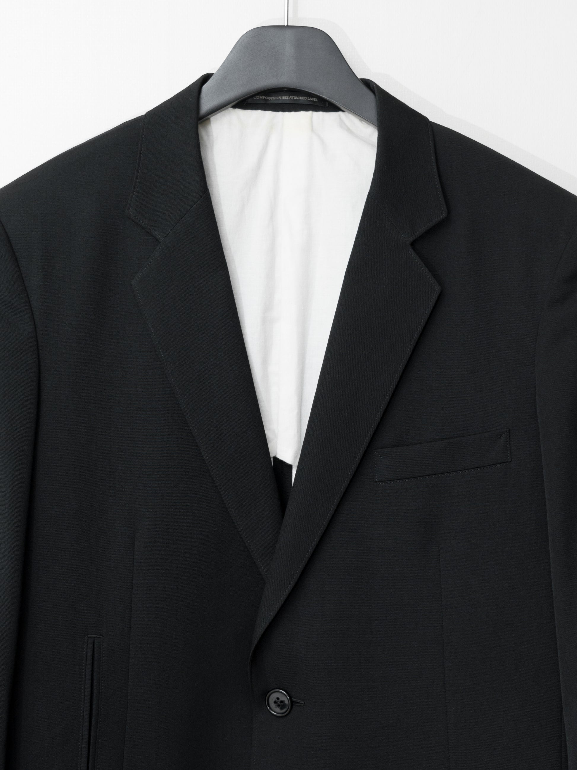 relaxed cut tailored jacket in mediumweight wool gabardine. features structured shoulders, notch lapels, welted flap pockets, double welt side pocket at left, faux cuffs, ventless back, and inner chest pockets. finished with fully bias bound interior seams and partial lining in cotton and cupro.
