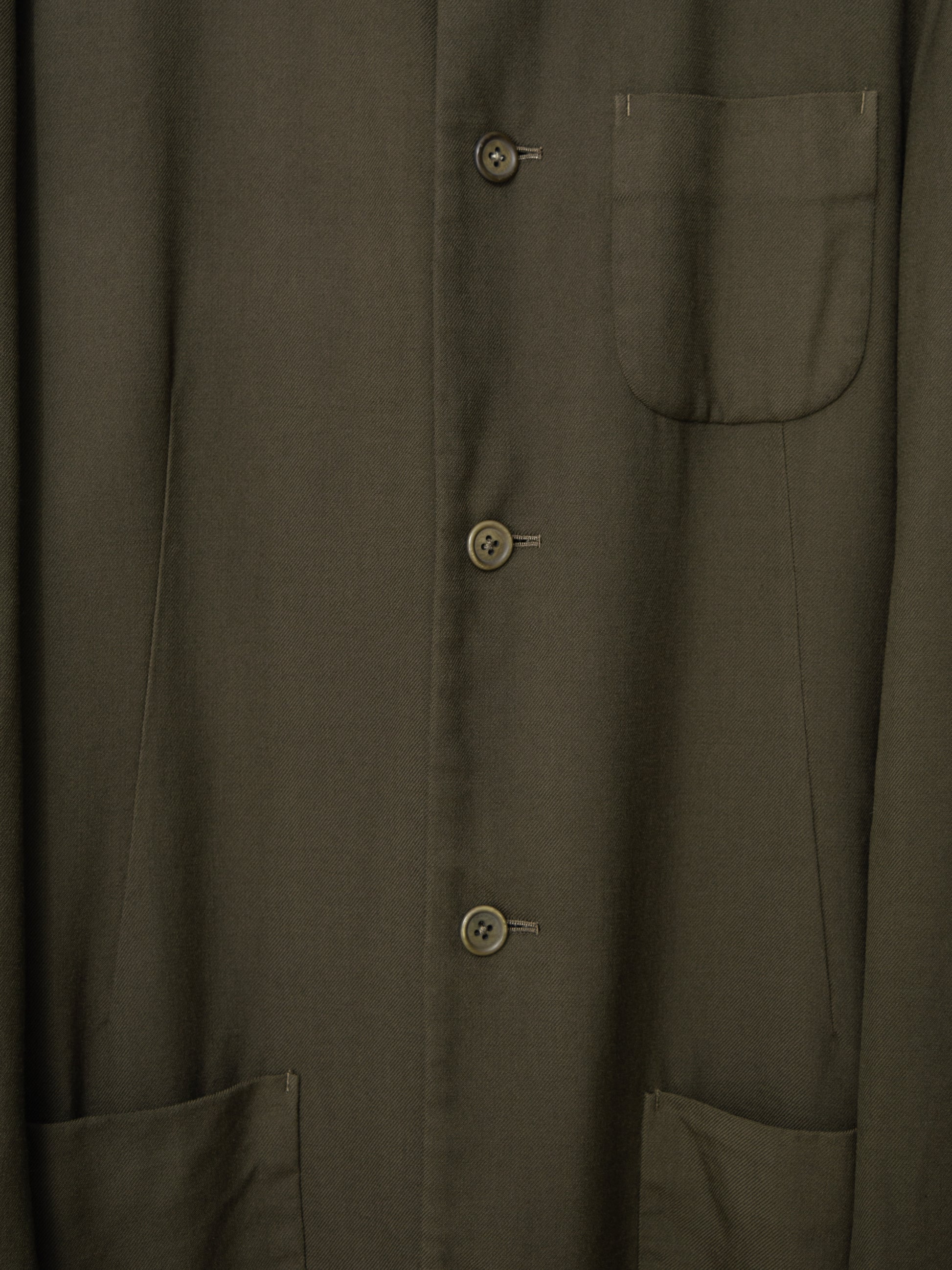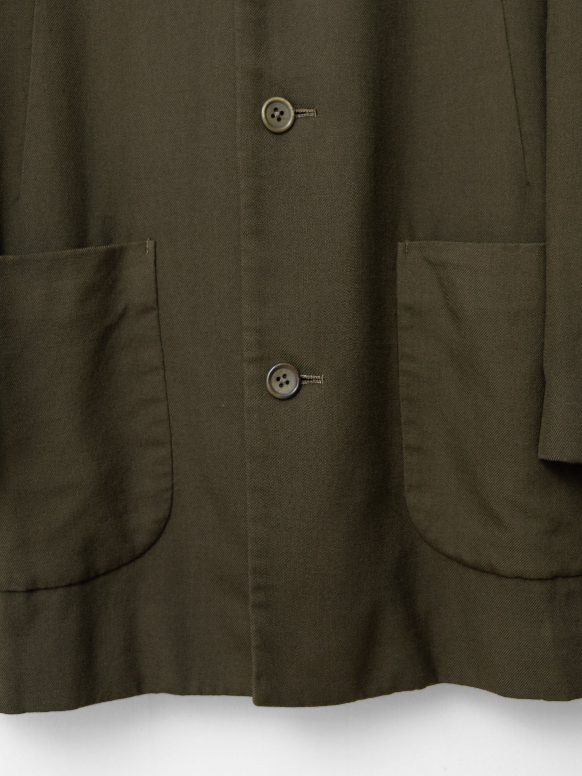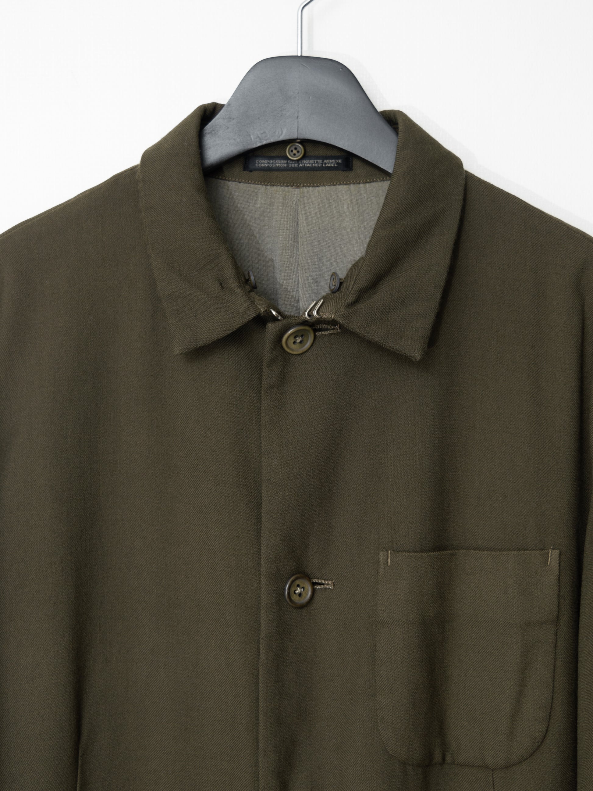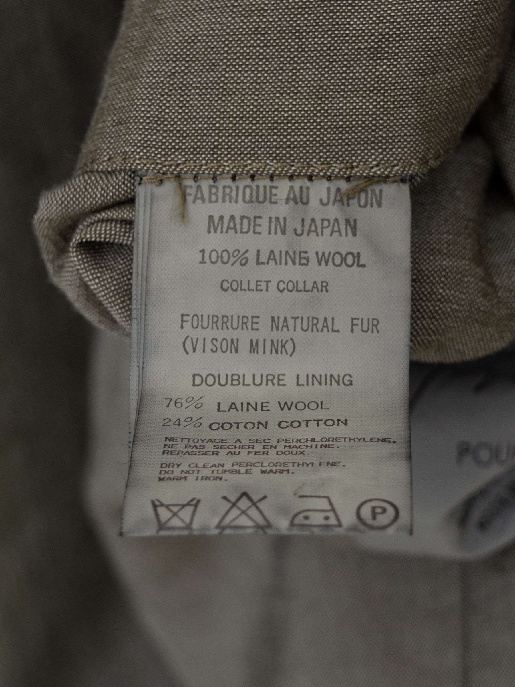 absolutely outstanding level of quality that you simply cannot see today. the body is a heavyweight wool gabardine, slightly softened by the garment dye treatment and aged to perfection. deep tonality with a living, breathing sensibility that can be expected to change slowly with time. the genuine mink collar is so soft that it's almost imperceptible to the fingertips - the hairs are so light it feels like touching air. impeccable, straightforward cut with oversized proportions - a rounded drop shoulder and straight, boxy lines with a sweeping sense of ease. the lining is cut from a slightly iridescent cotton wool of such fine quality that it could be used for outer garments. it's slightly scratchy with a beautiful organic texture that elevates the luxurious feel of the garment even further. the horn buttons are particularly beautiful with slight warping and varying expressions of colors from the garment dye treatment. fits slightly big, recommended for size medium or large.