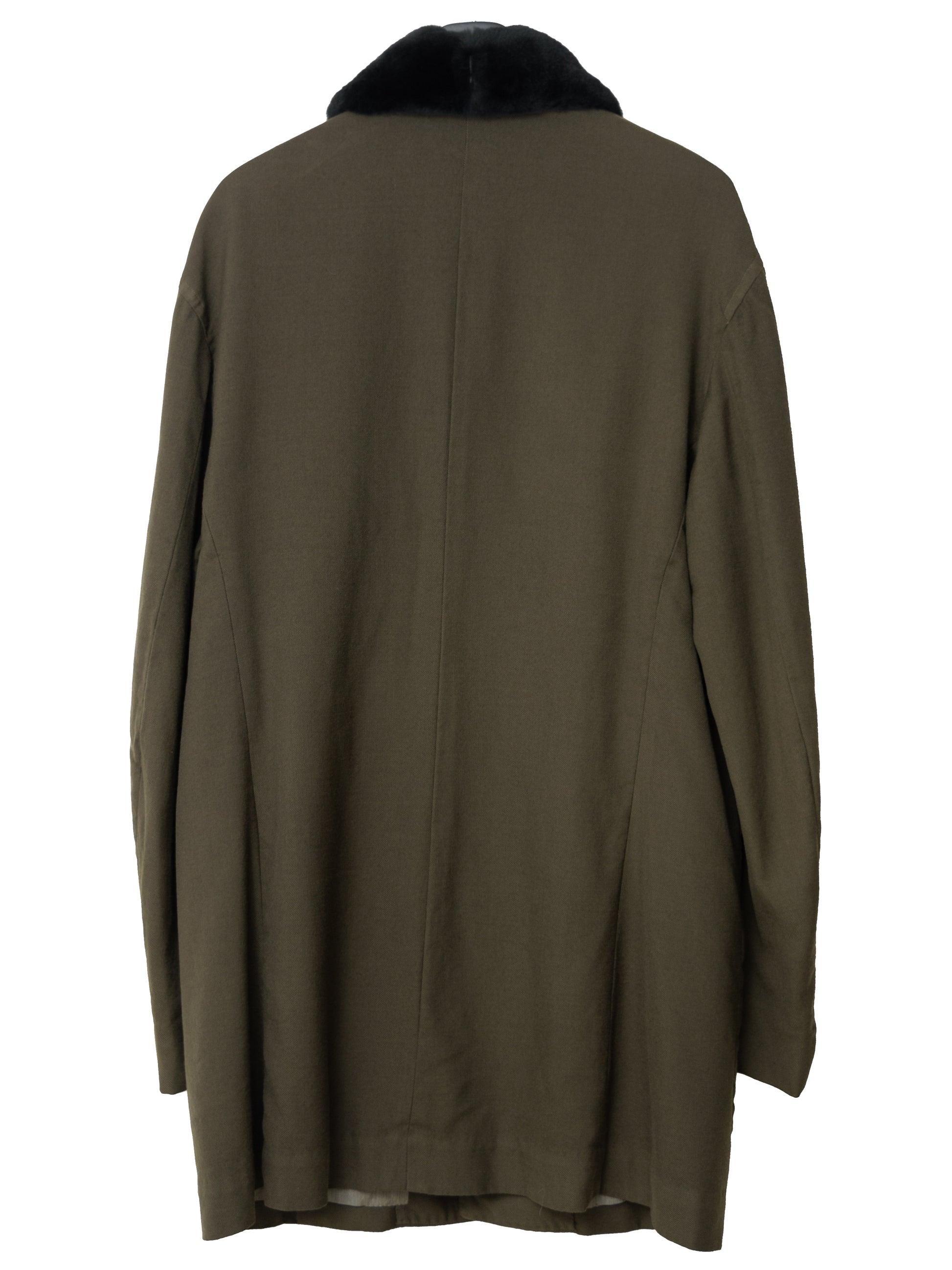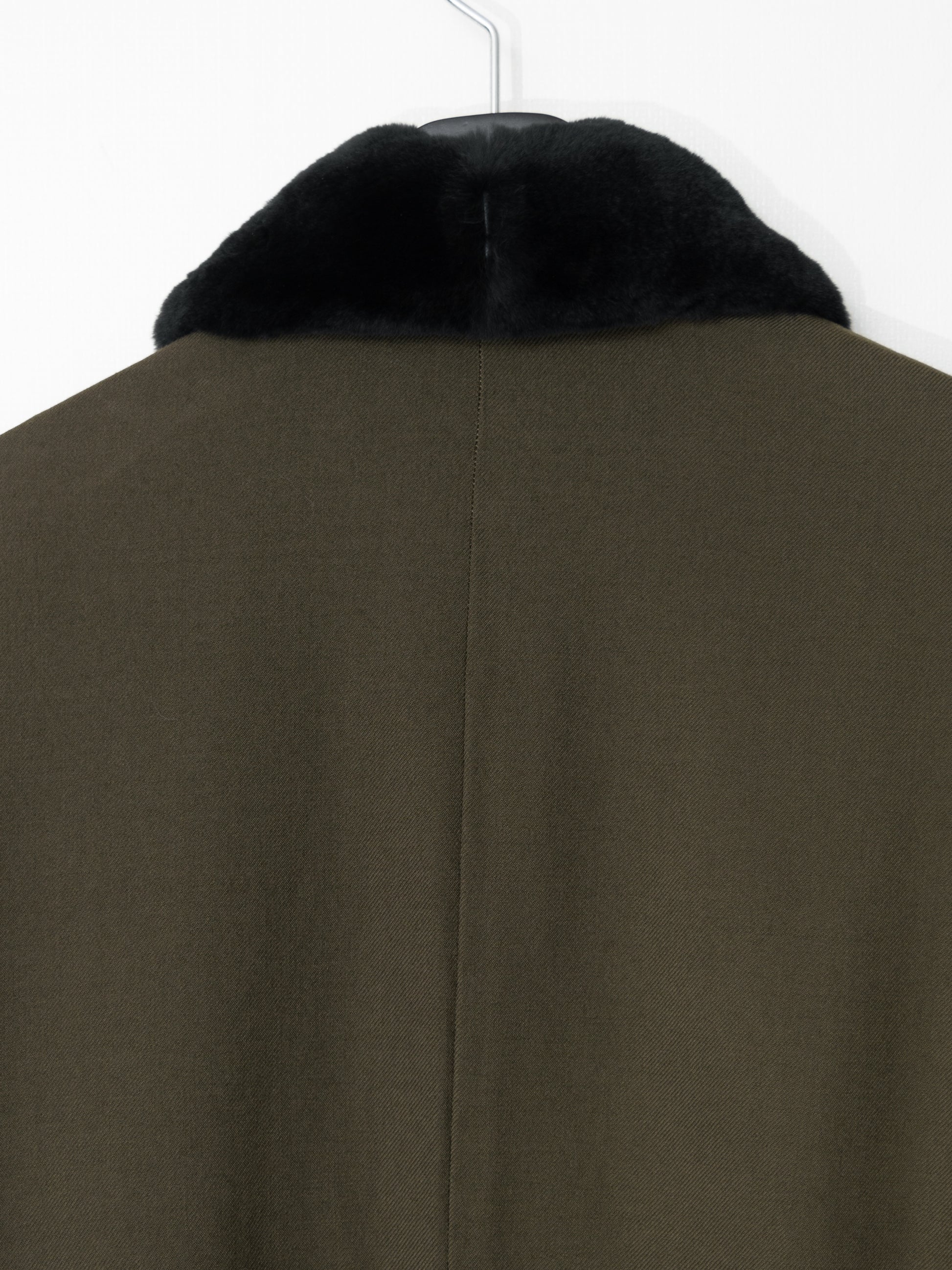 garment dyed half coat in heavyweight wool gabardine. features a detachable mink collar, double hook neck closures, rounded patch pockets, and inner chest pockets. fully lined in iridescent wool cotton.