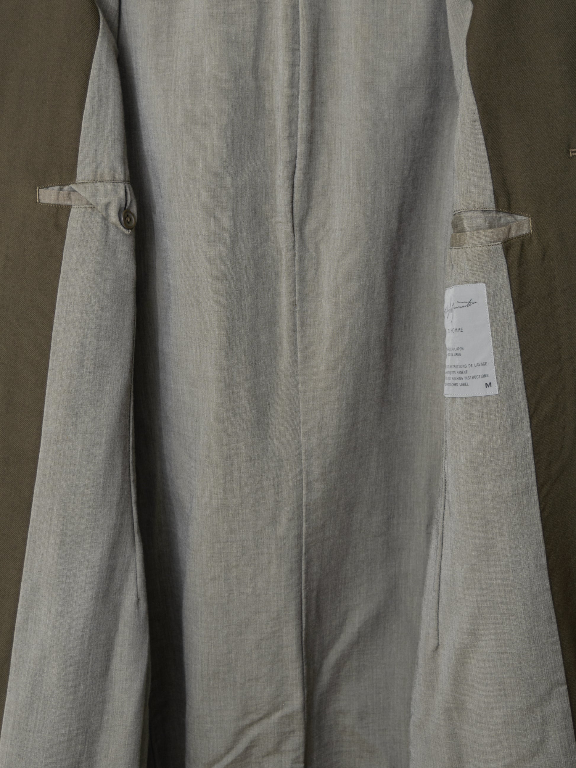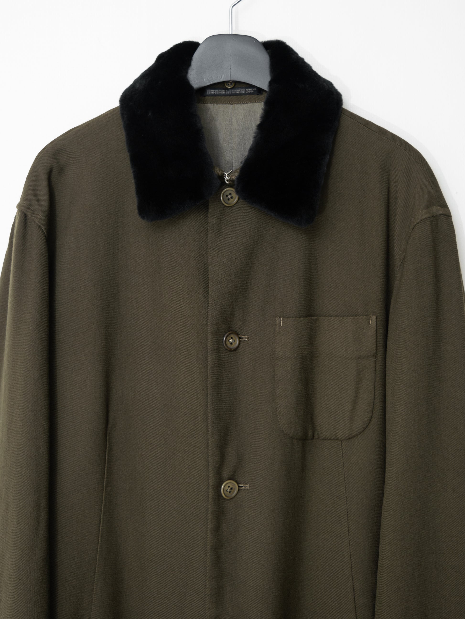 a standout piece from yohji yamamoto pour homme autumn / winter 1998 which featured an all-female cast of models including vivienne westwood and charlotte rampling. regarded as one of yohji's best collections for menswear, the collection is marked by luscious woolen fabrics in deep earth tones accentuated with dramatic use of fur.