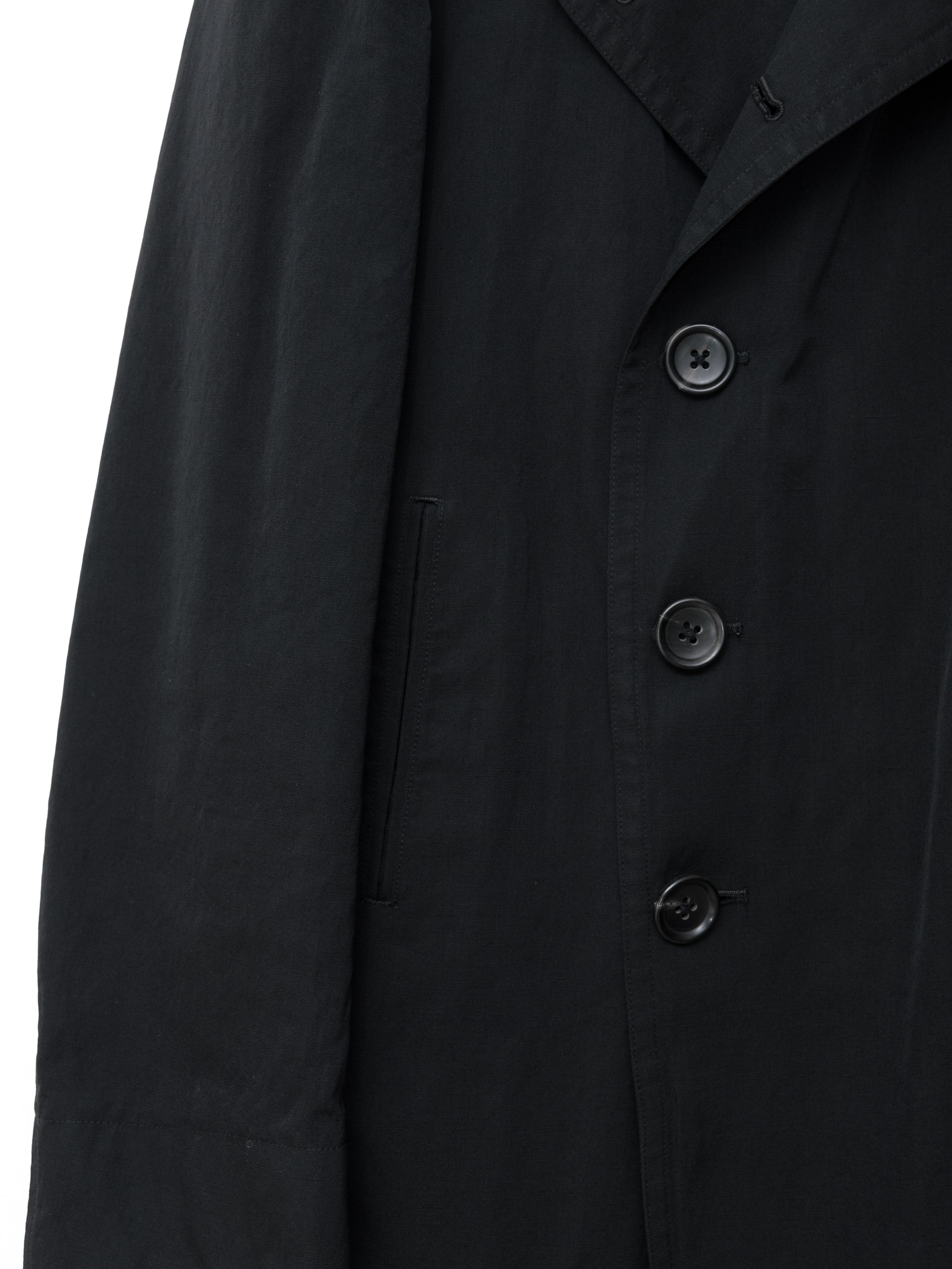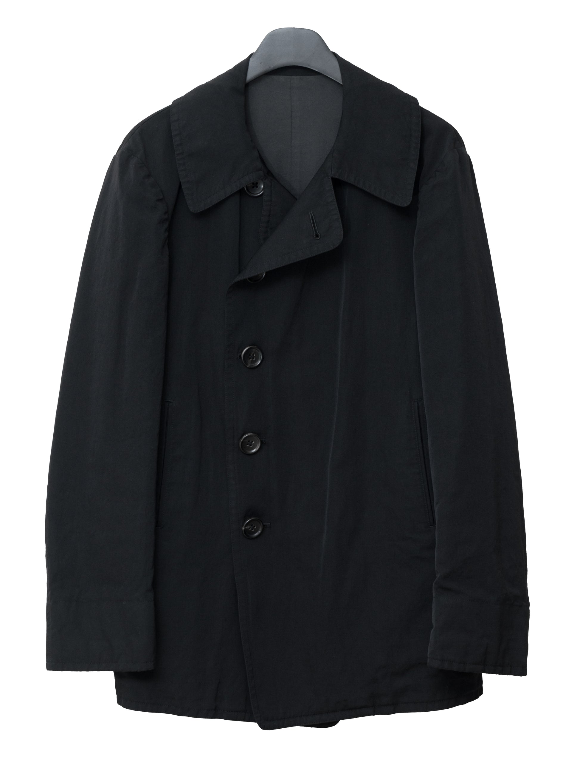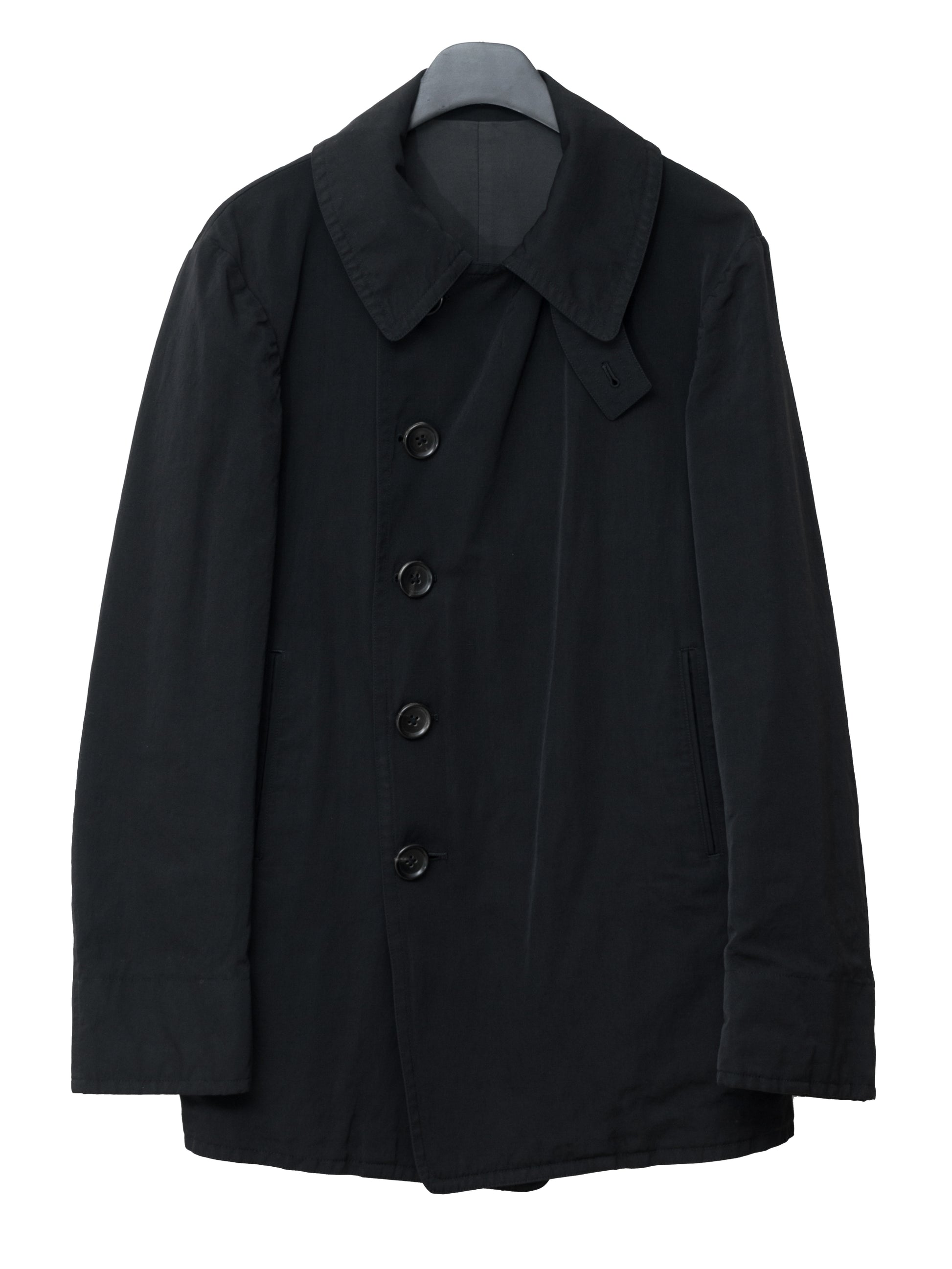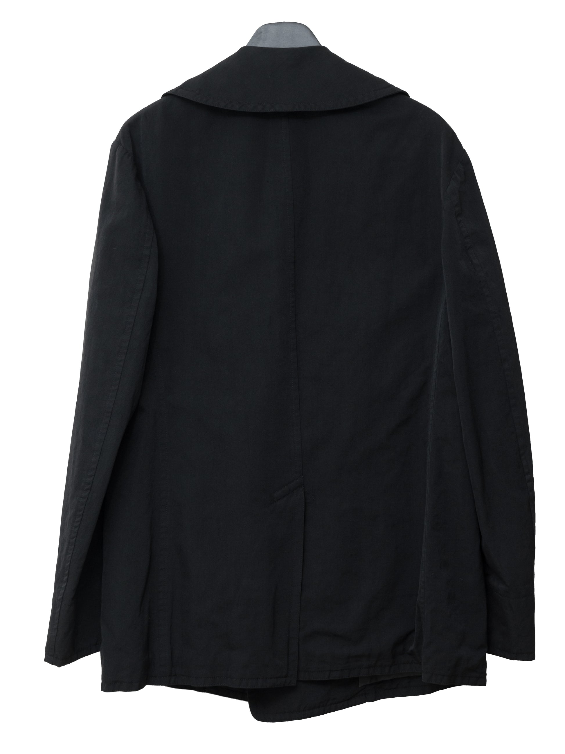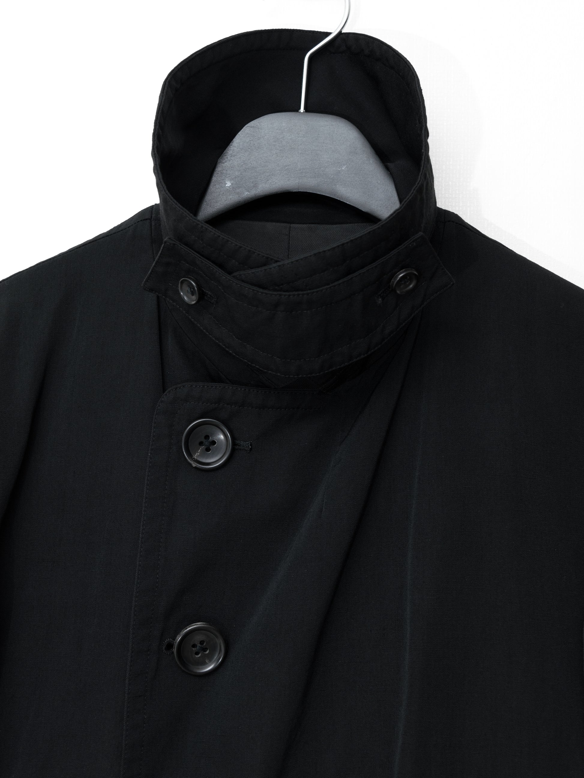 relaxed cut military jacket in heavyweight wool linen. features double breasted front with inner jigger button, convertible collar with detachable chin guard, single back vent, welt side pockets, inner chest and storage pockets. finished luxurious horn buttons and full interior lining in fine cotton twill.
