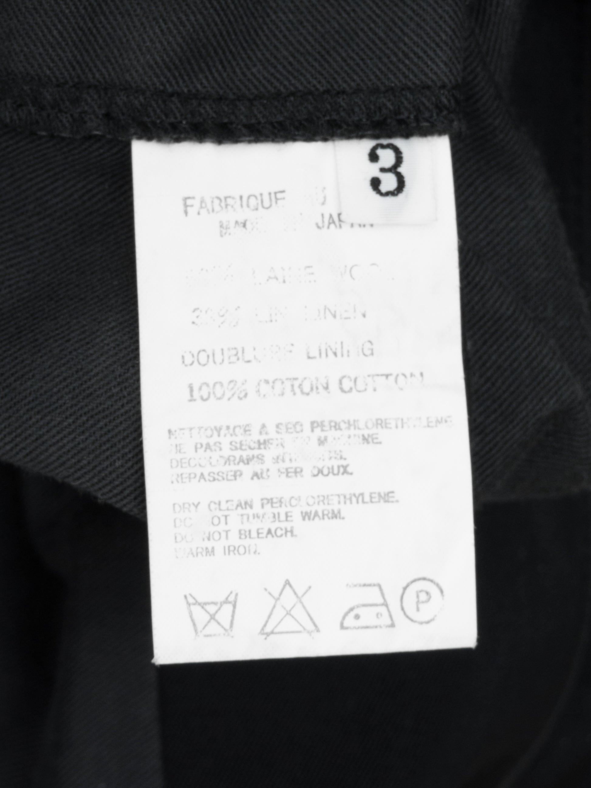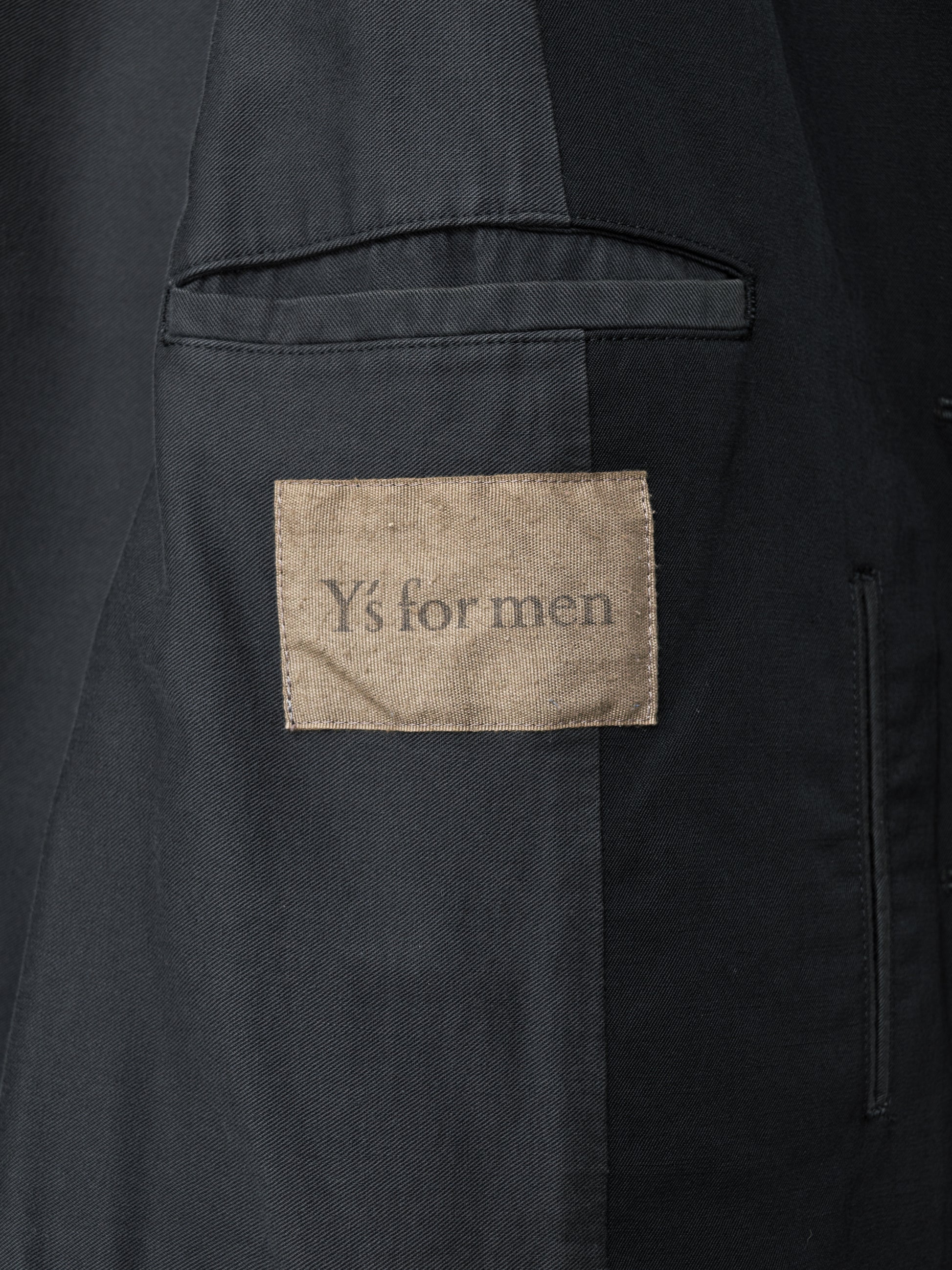 military masterpiece from early 00s y's for men with exceptional cut and proportion. very sturdy fabric with appearance of wool gabardine imbued with  the organic sensibility of linen for a slightly wrinkled texture that molds to the body. the high density twill woven cotton lining helps to provide both structure and comfort as it has a soft, washed feel. tons of storage with 2 exterior and 5 interior pockets. dress up or down. robust and elegant, refined and rough. classic yohji at it's finest. recommended for size medium or tall smalls.