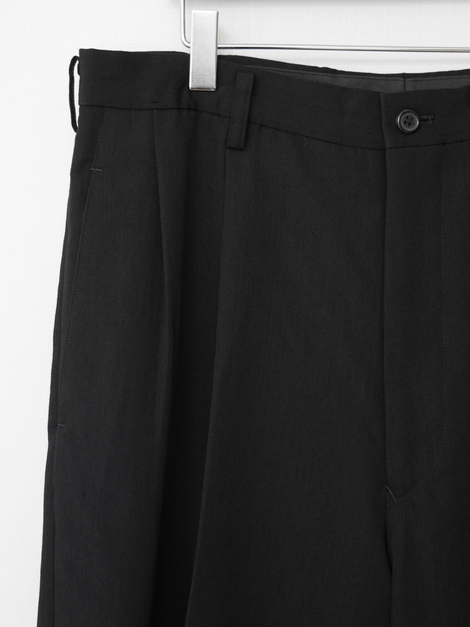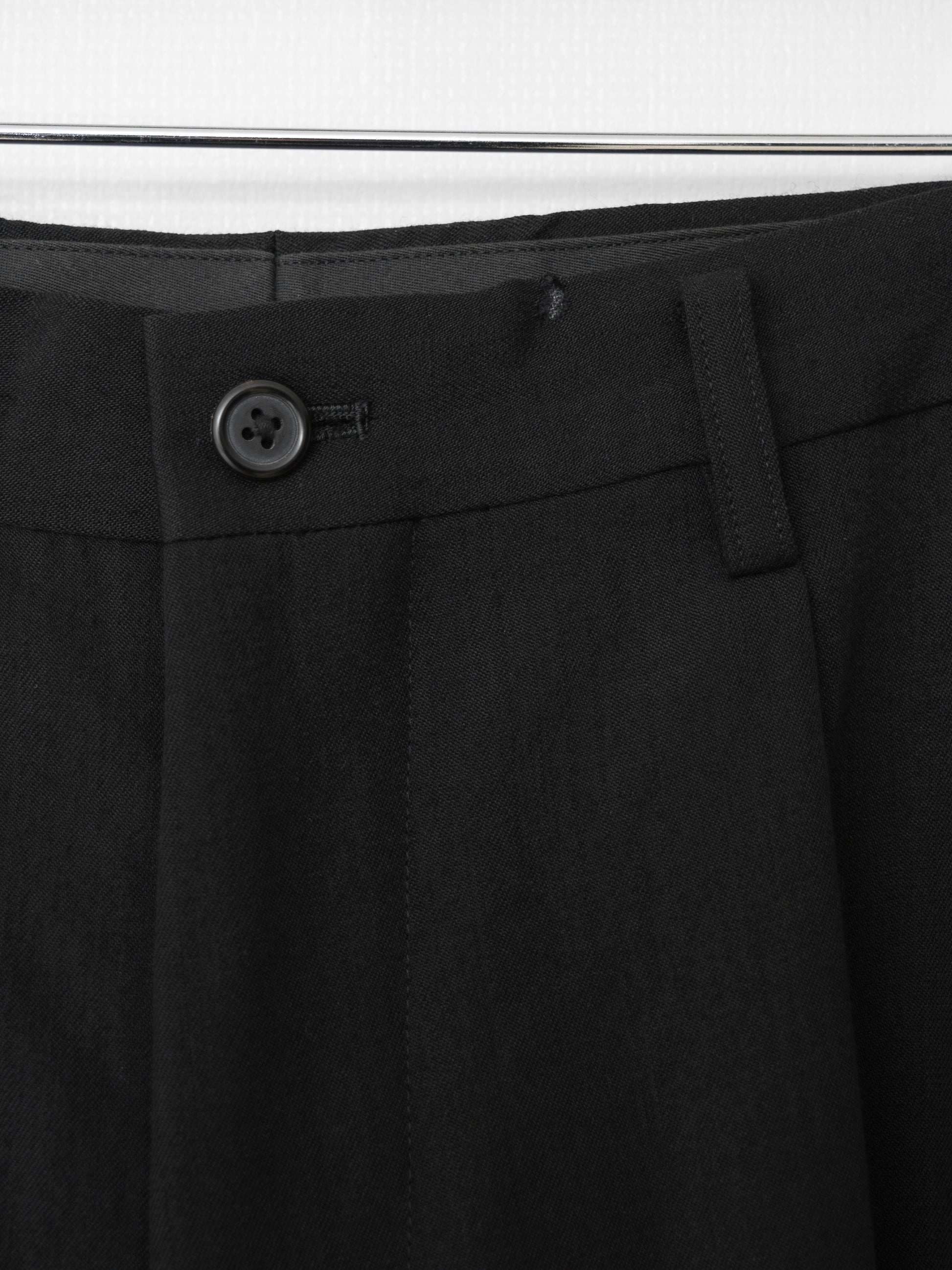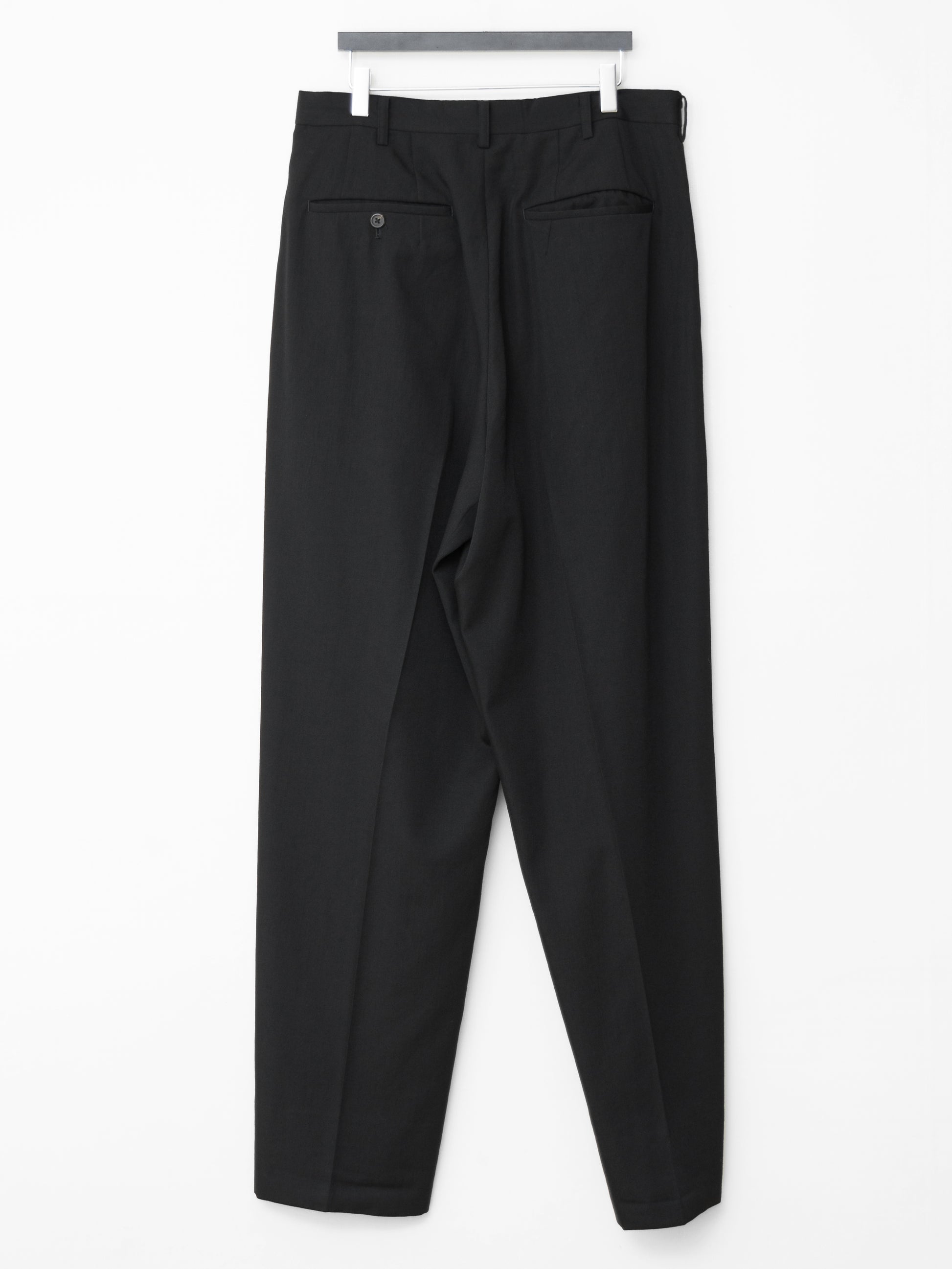 relaxed cut trousers in mediumweight wool gabardine. double pleated front, high rise, full length leg, slant side pockets, welt back pockets, darted back waist. finished with a fully faced inner waist and partial lining in smooth rayon. horn buttons throughout.