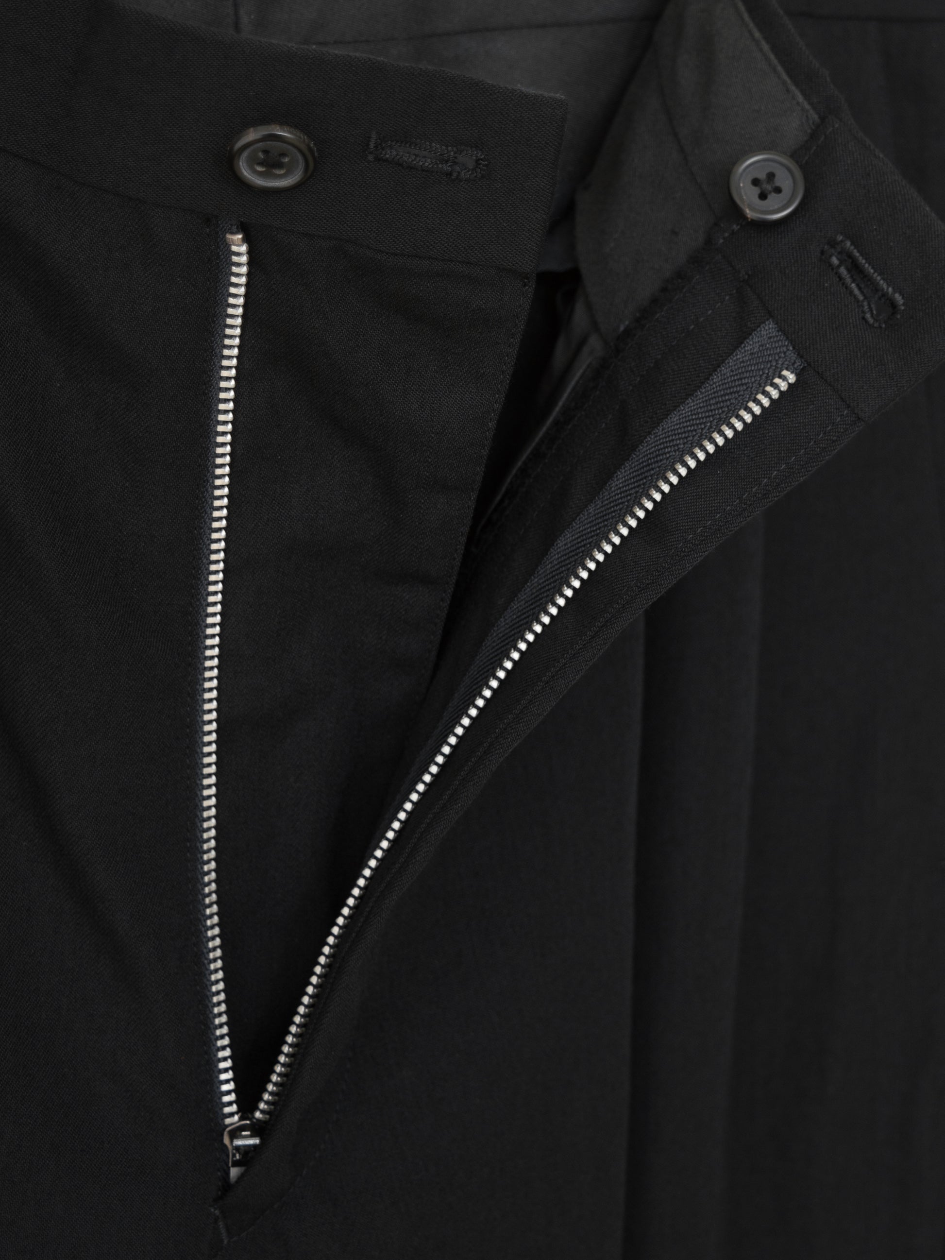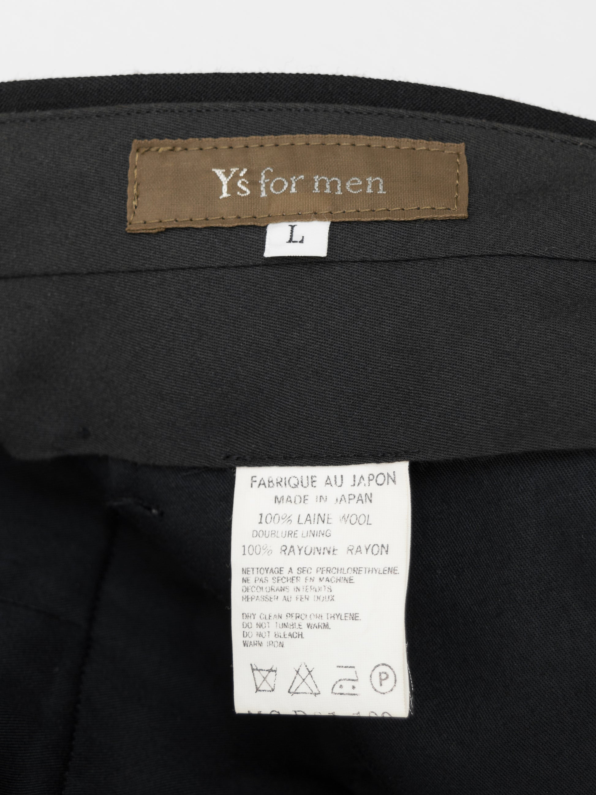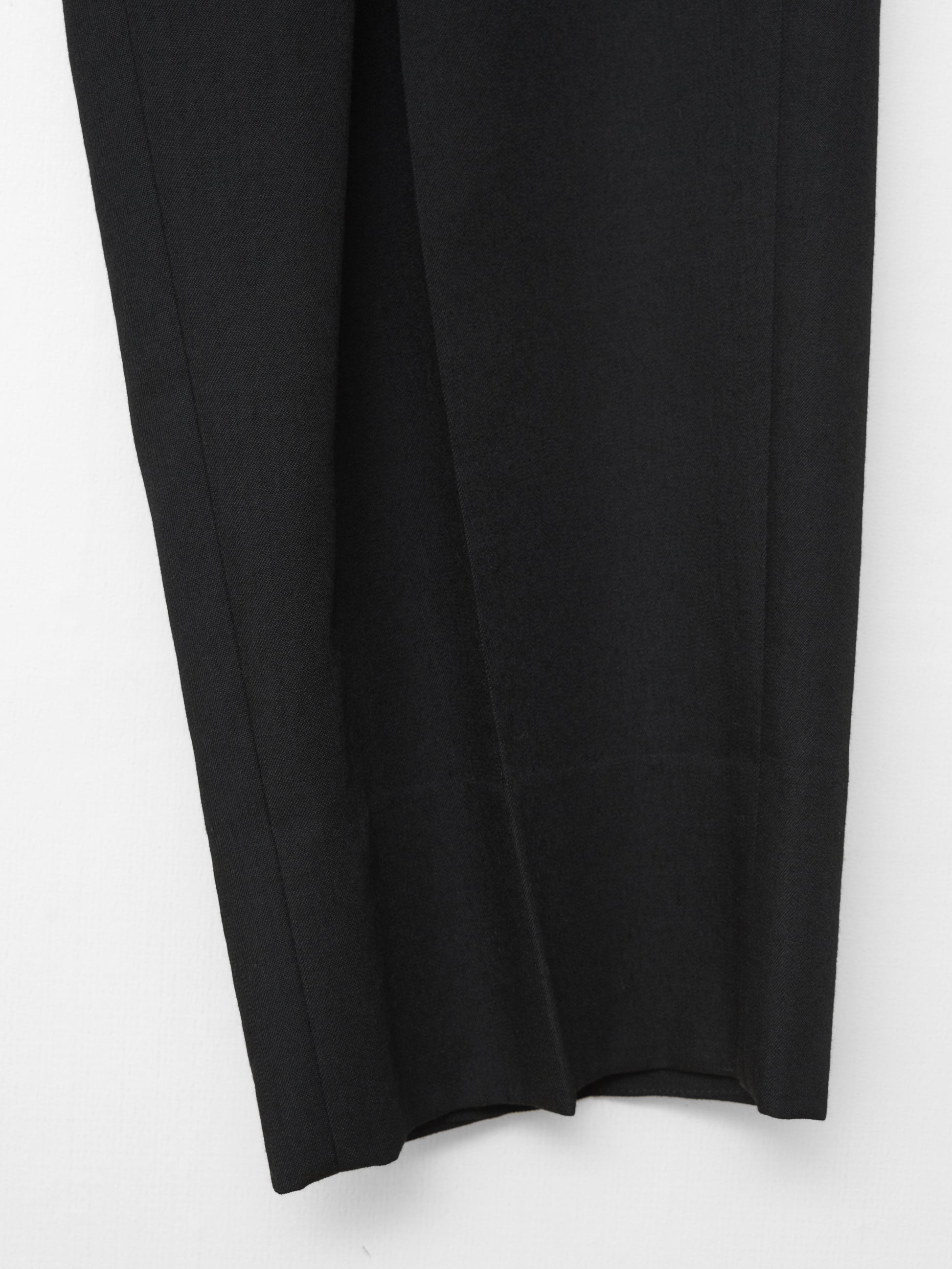 full volume trousers with an unmistakable yohji sensibility - these are not your ordinary wide trousers. people commonly like to wear high rise pants quite high up over the abdomen, but i feel that the more advanced way to wear them is lower on the waist, allowing the leg to break dramatically over the shoe for a signature yohji look evocative of a disheveled gentleman. this particular wool gabardine fabric feels much more supple and luxurious than others of its kind and you would have difficulty finding something of this quality in the market today. the inseam has an extra 10 cm or 4 inches to let out for a longer length, if desired. matching jacket available.