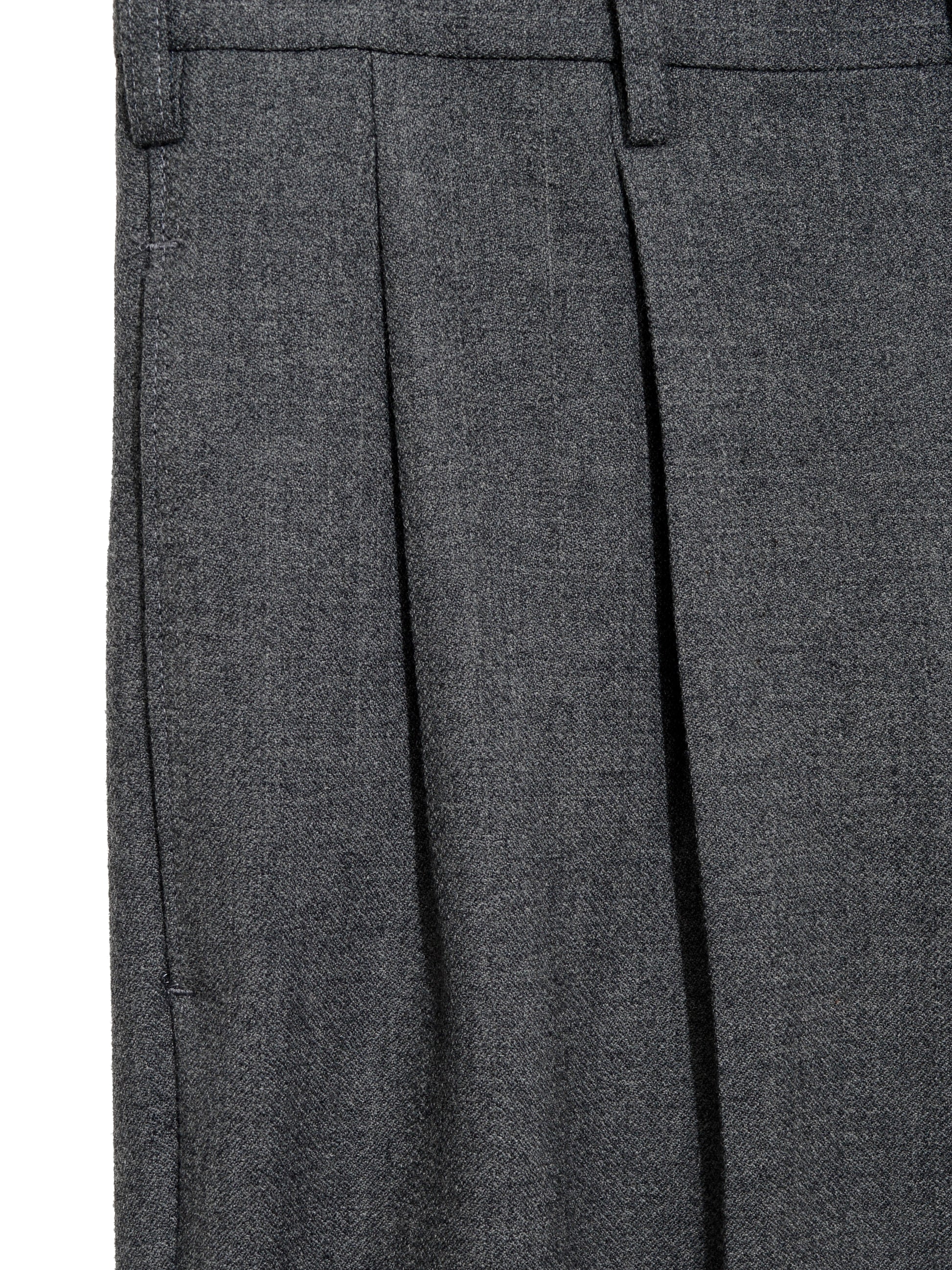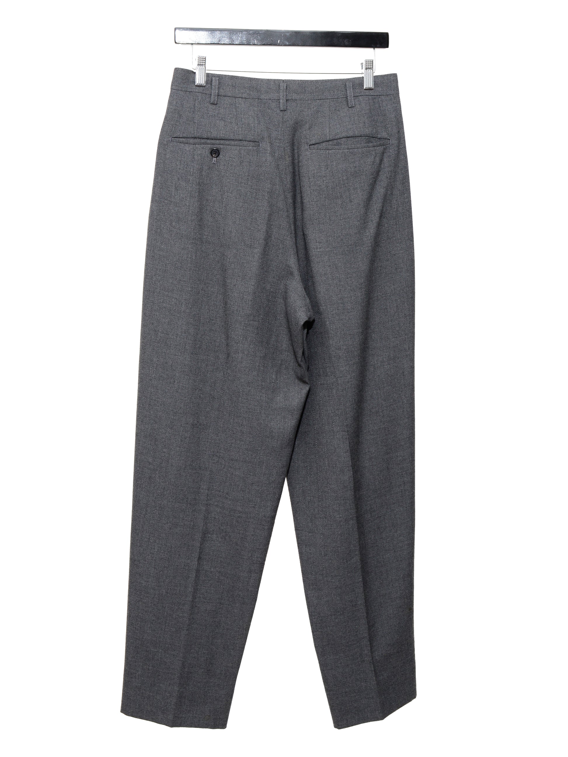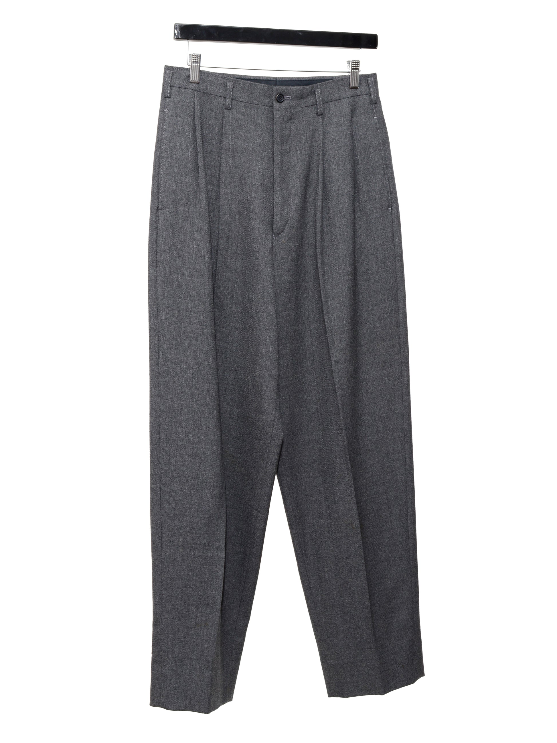 a relaxed pair of tapered trousers in medium weight wool polyester. constructed with a high rise, zip fly, double pleat front, side pockets, back welt pockets, darted back waist, voluminous tapered leg with a full length. partially lined with cupra. a timeless pair of trousers with a modest neatness in fine wool aged to (im)perfection.