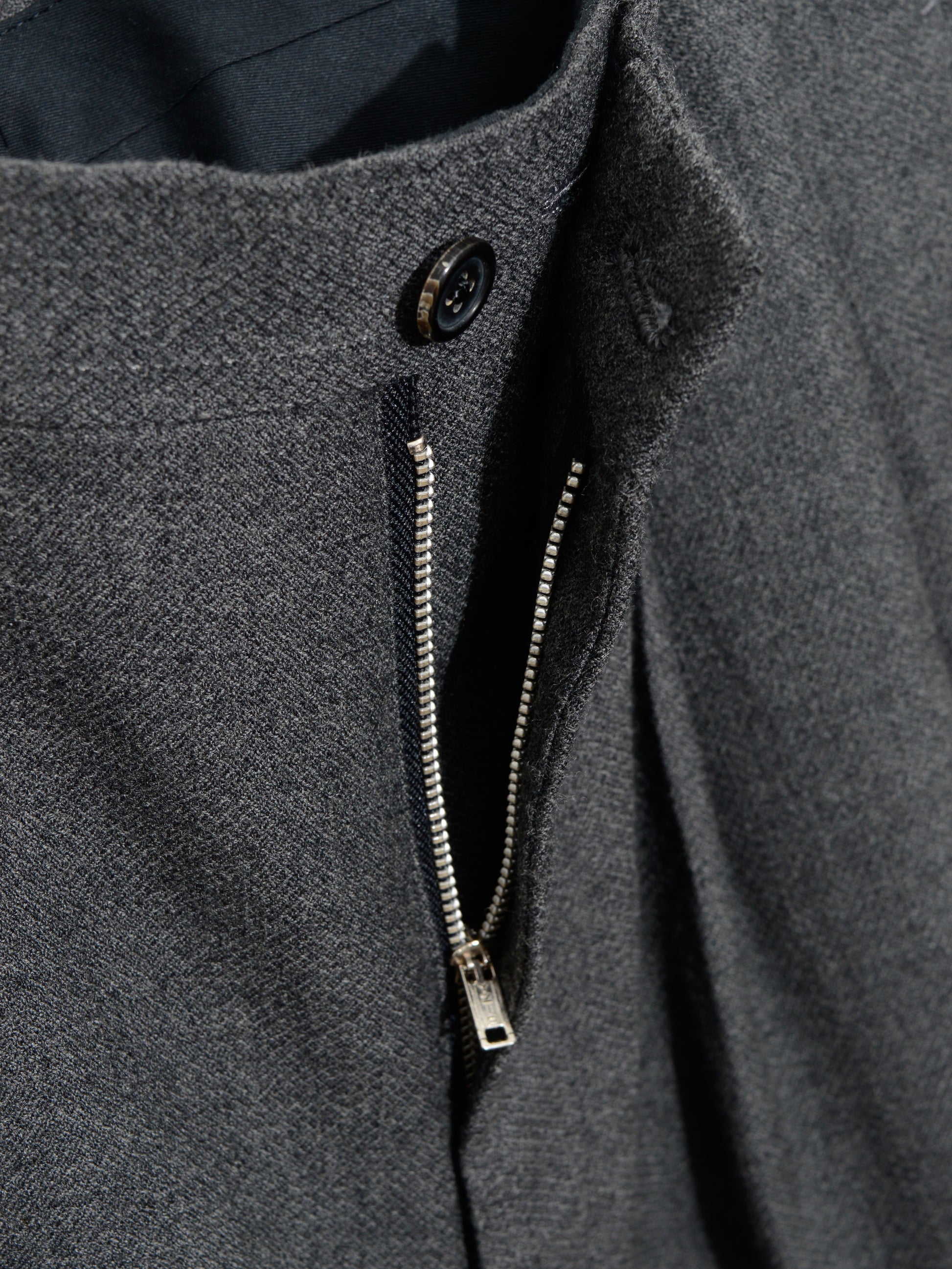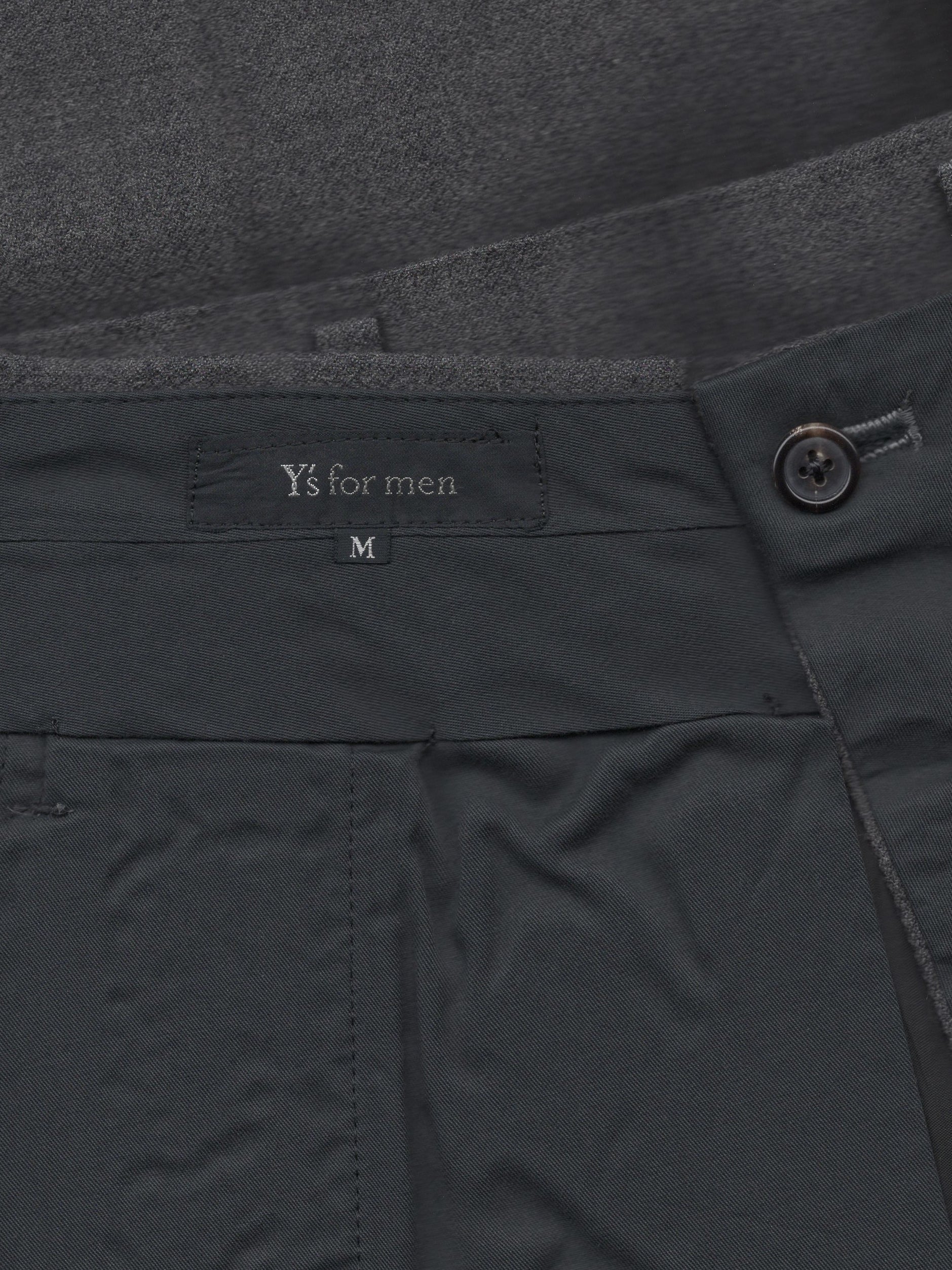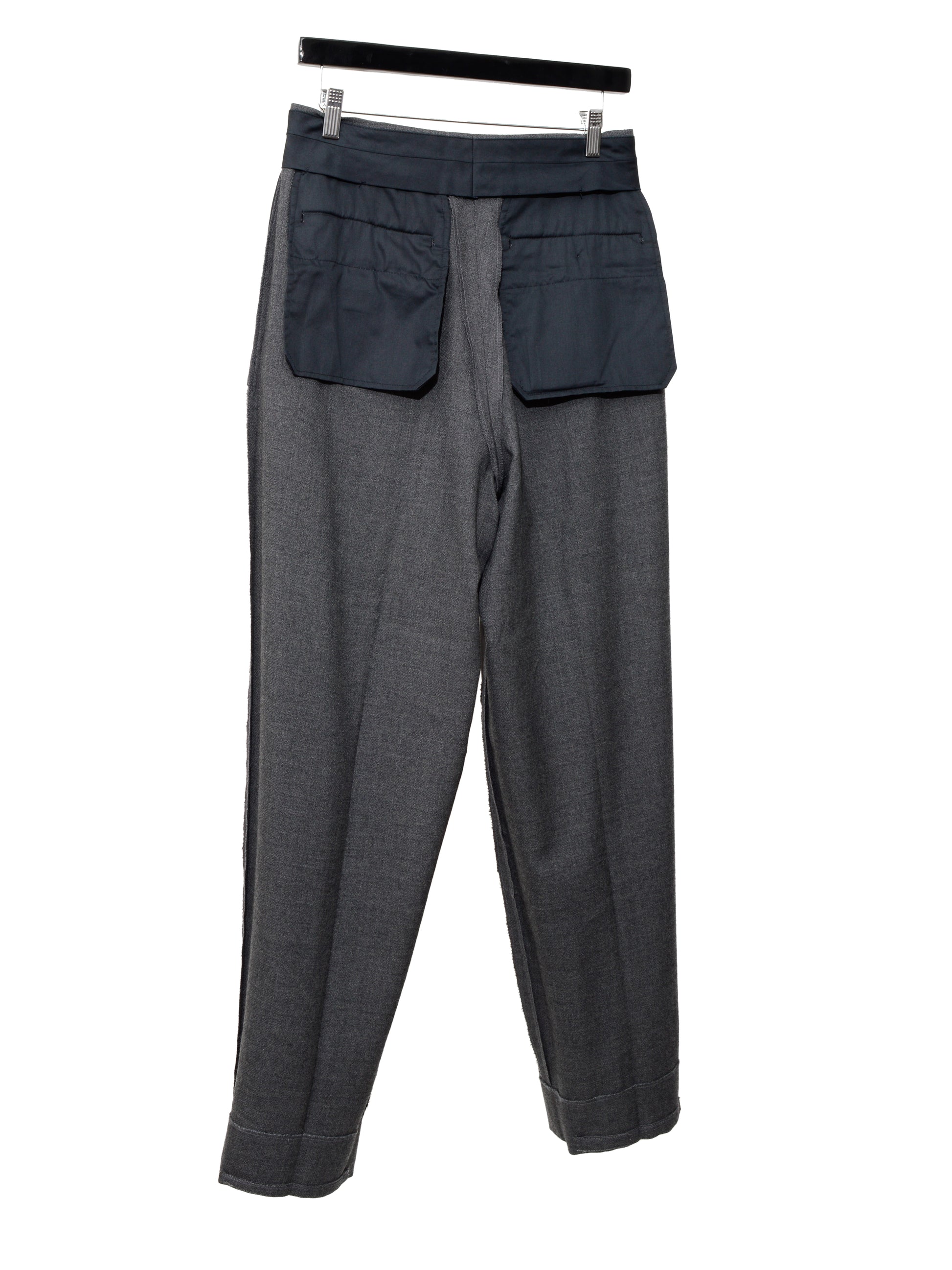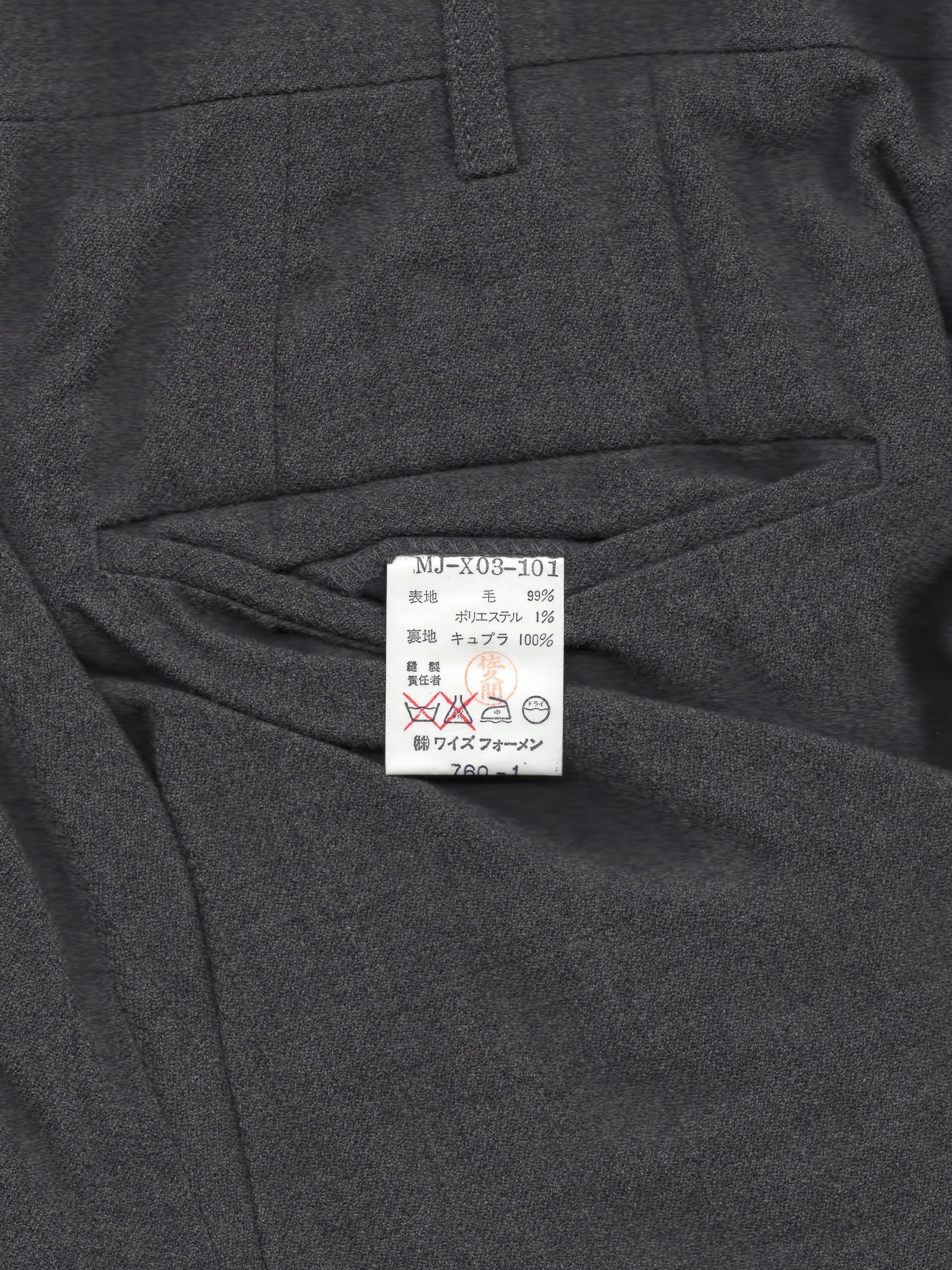 a relaxed pair of tapered trousers in medium weight wool polyester. constructed with a high rise, zip fly, double pleat front, side pockets, back welt pockets, darted back waist, voluminous tapered leg with a full length. partially lined with cupra. a timeless pair of trousers with a modest neatness in fine wool aged to (im)perfection.