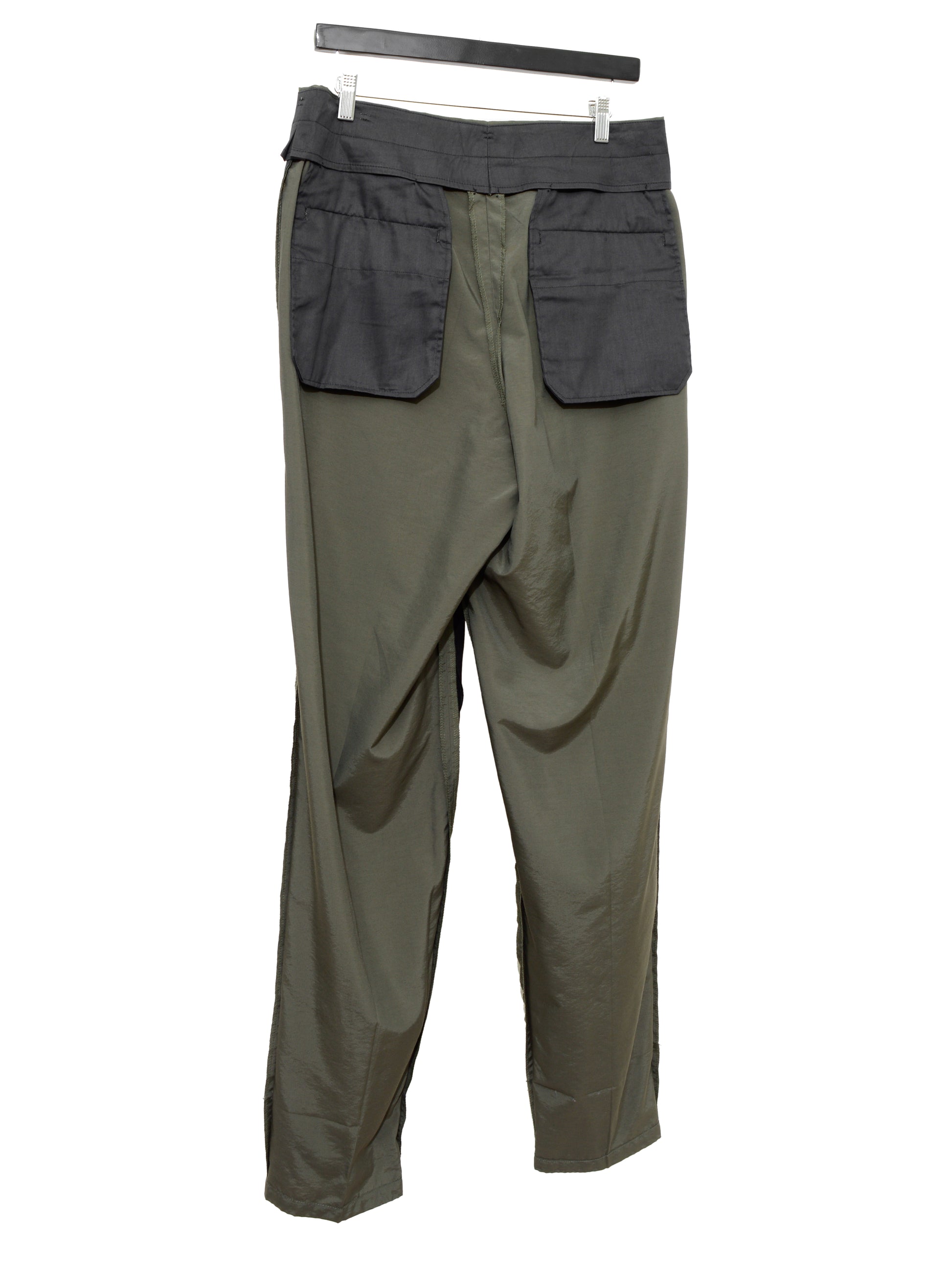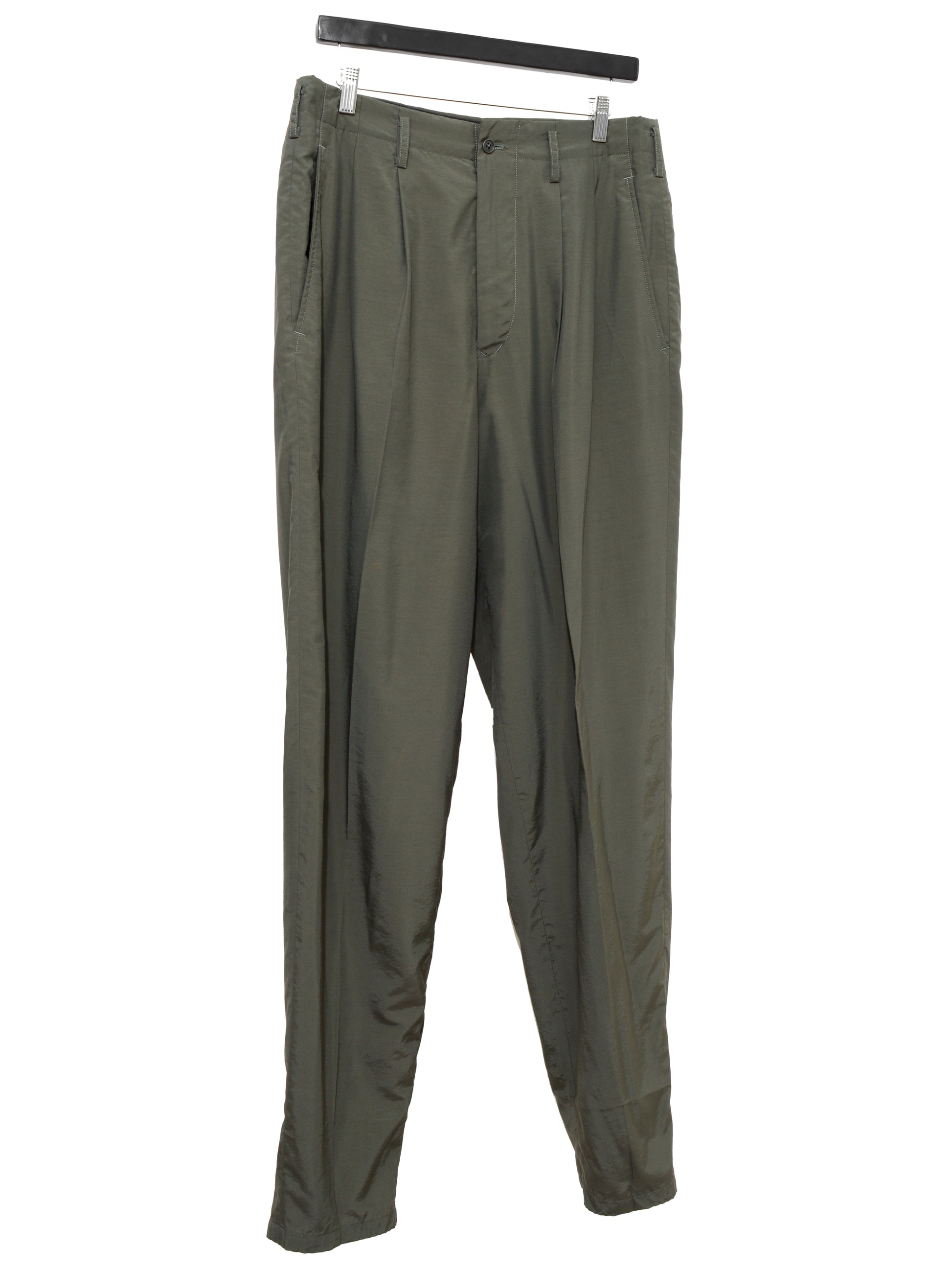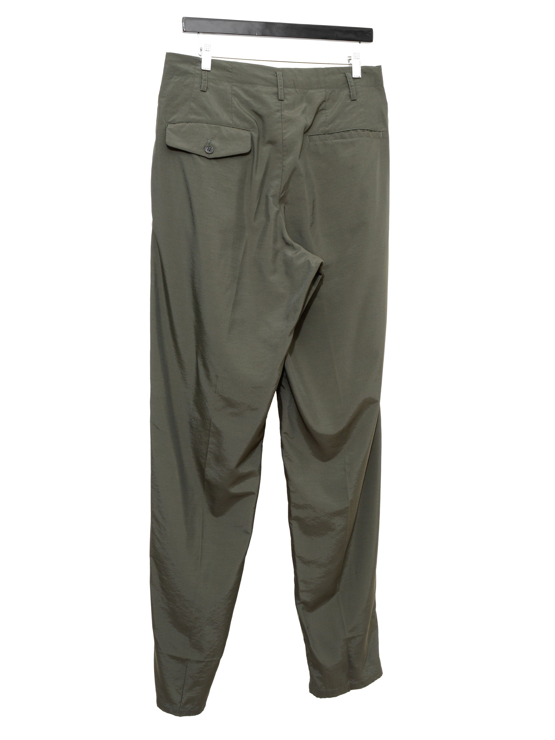 a relaxed pair of tailored trousers in mediumweight rayon nylon. constructed width a high rise, zip fly, double pleat front, cut away side pockets, welt and flap back pockets, quadruple darted back waist, and a voluminous tapered leg with a full length. partially lined with rayon. a classic men's archetype in a rare fabric with matte luster and excellent drape.