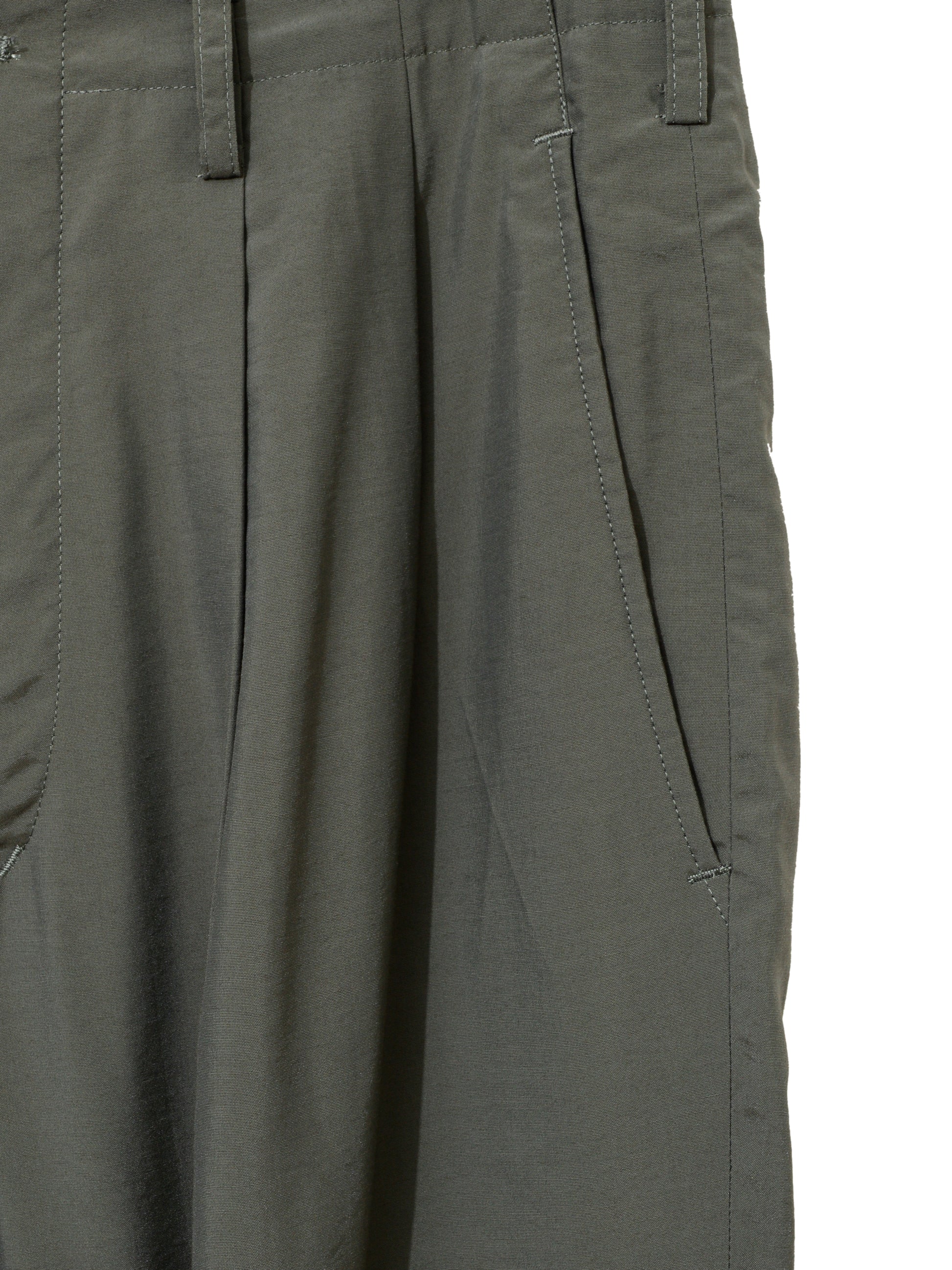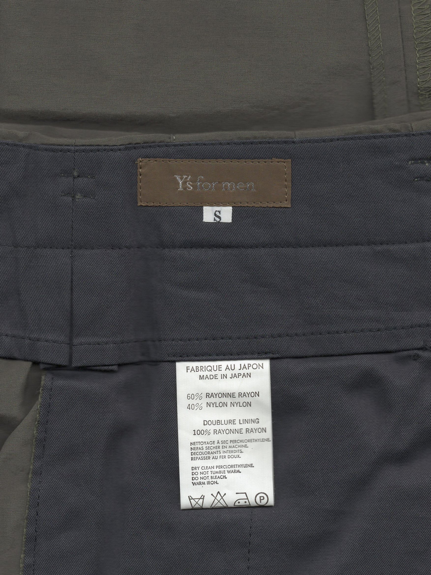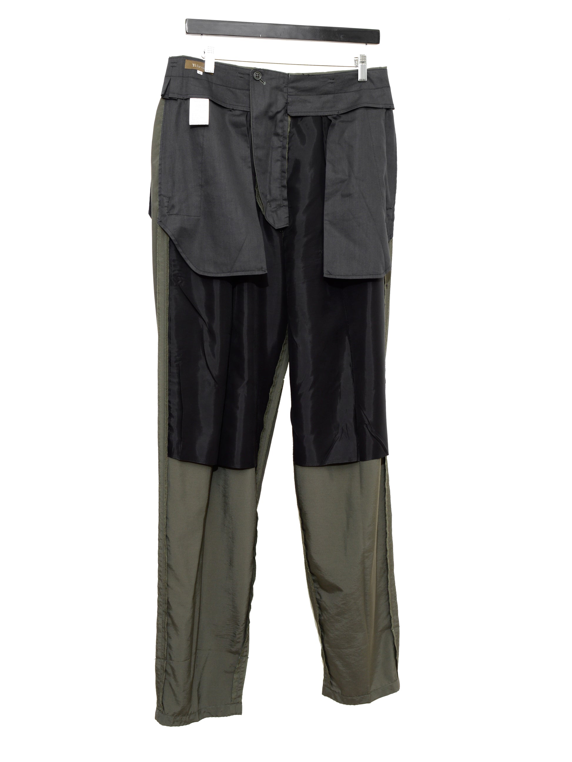 a relaxed pair of tailored trousers in mediumweight rayon nylon. constructed width a high rise, zip fly, double pleat front, cut away side pockets, welt and flap back pockets, quadruple darted back waist, and a voluminous tapered leg with a full length. partially lined with rayon. a classic men's archetype in a rare fabric with matte luster and excellent drape.