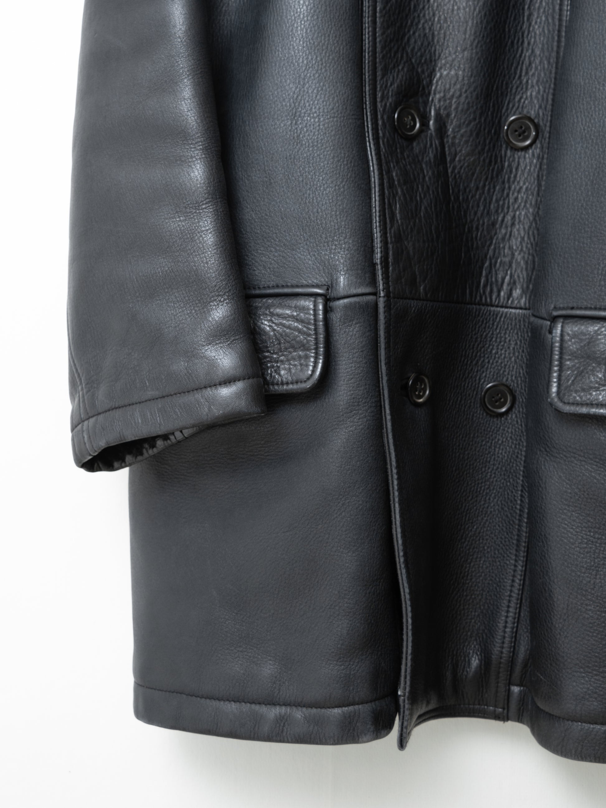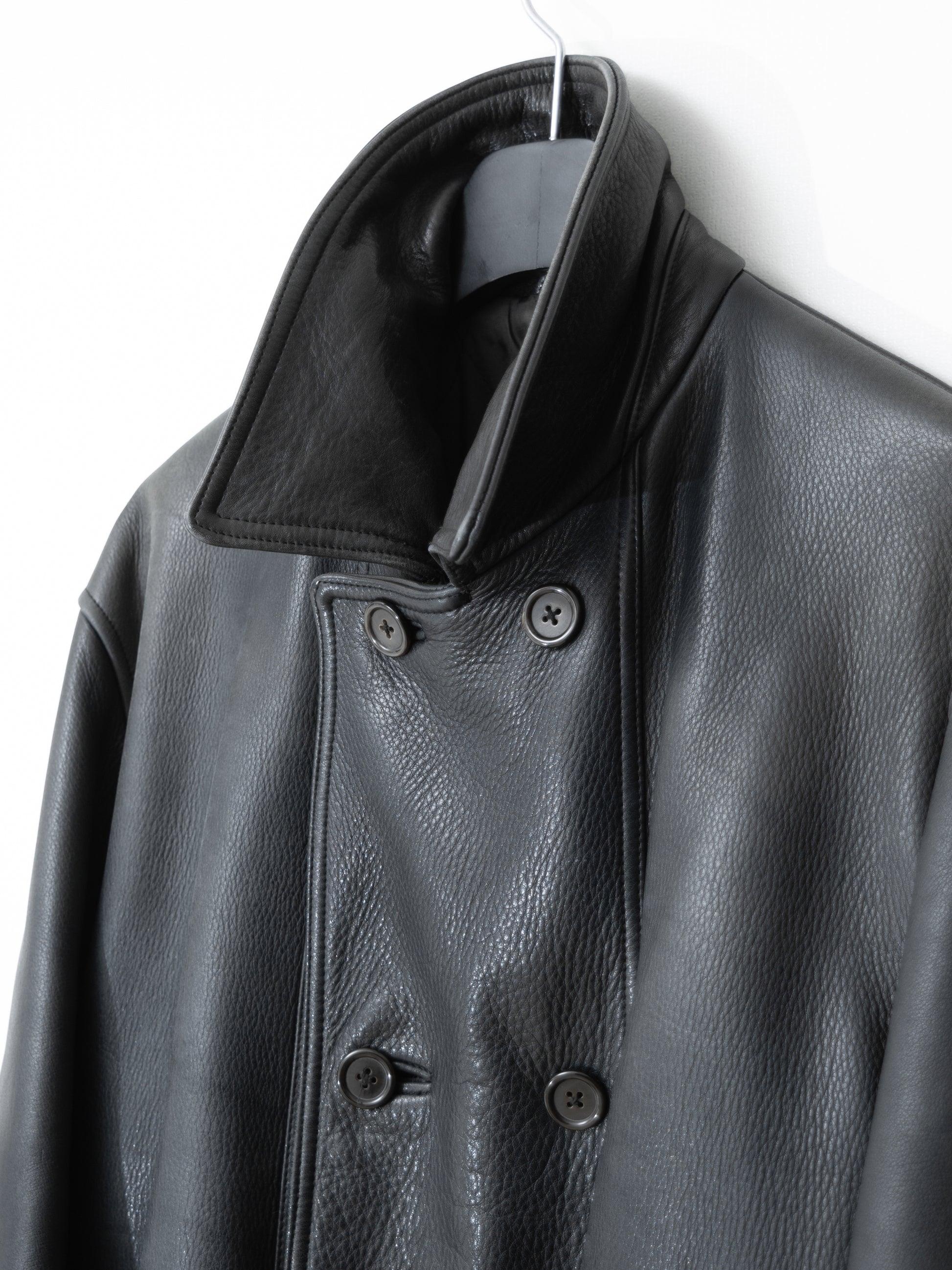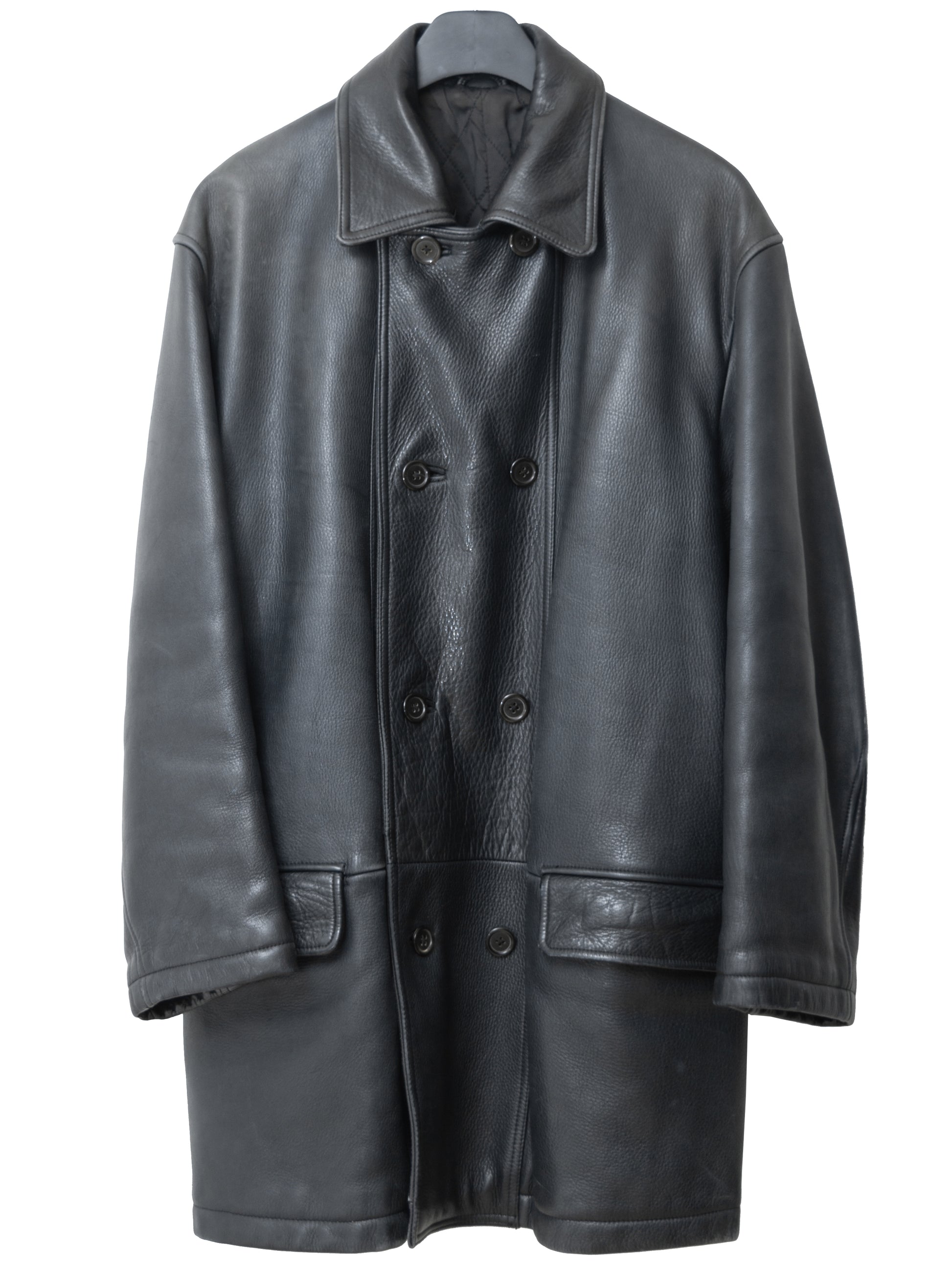 relaxed cut coat in super heavyweight cowhide. features a double breasted front, flap side pockets, and a quilted fill interior lining.