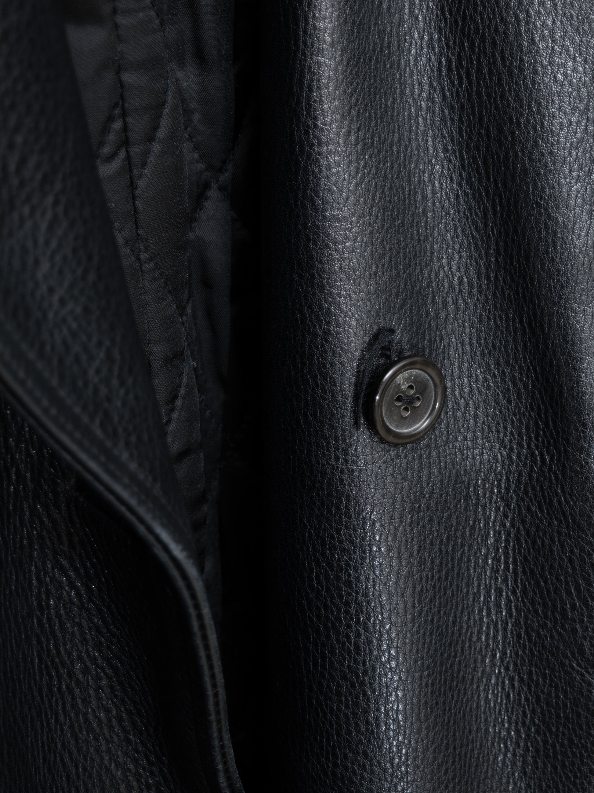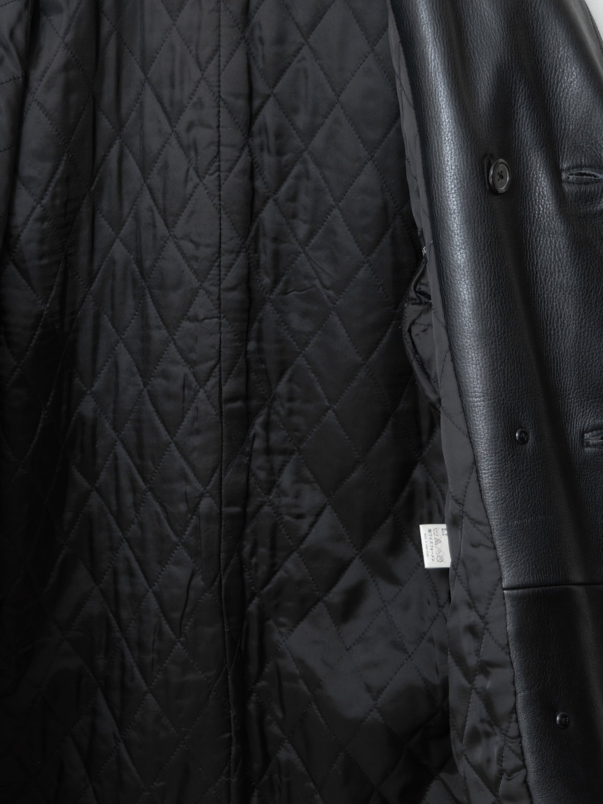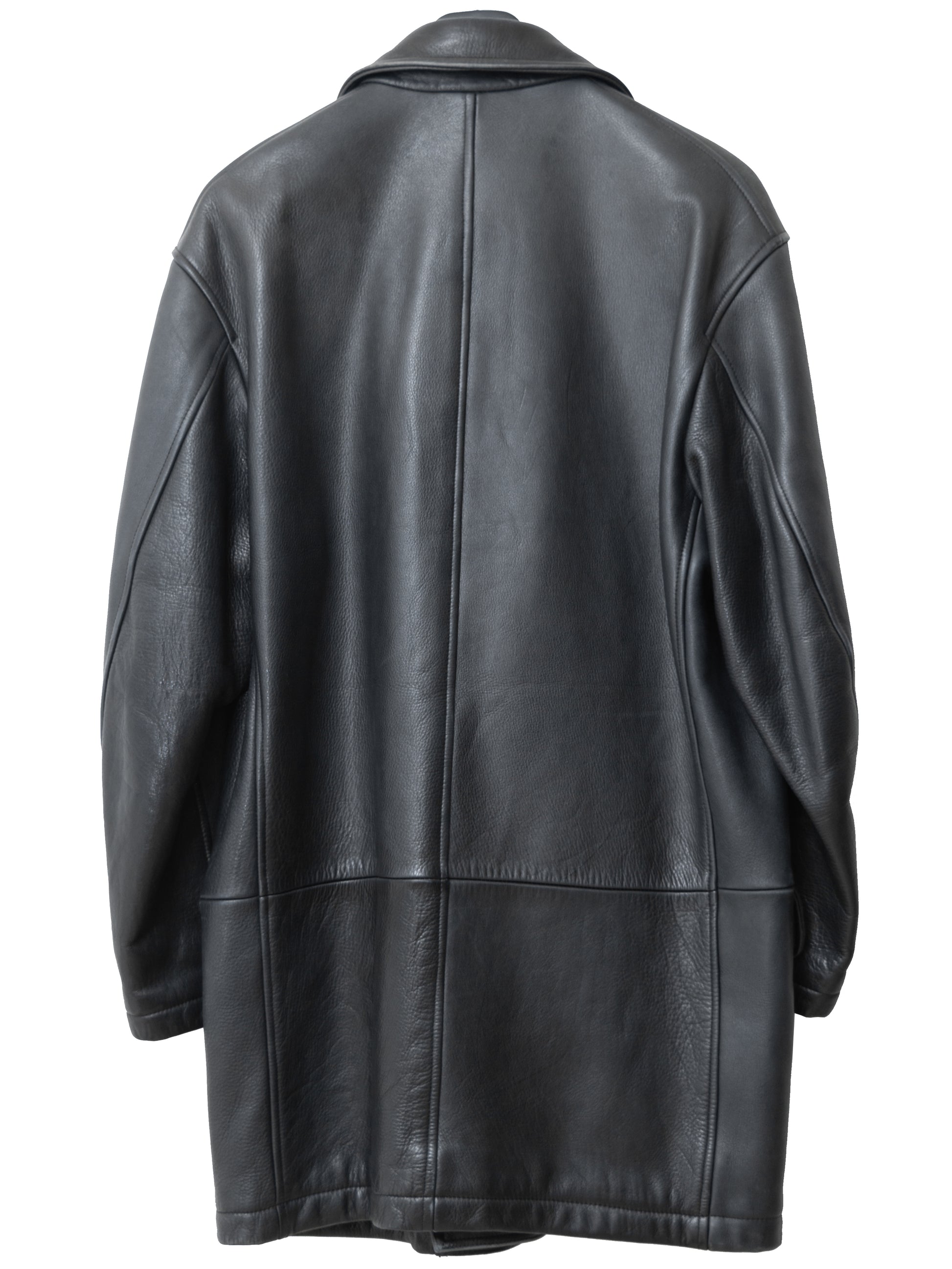 relaxed cut coat in super heavyweight cowhide. features a double breasted front, flap side pockets, and a quilted fill interior lining.