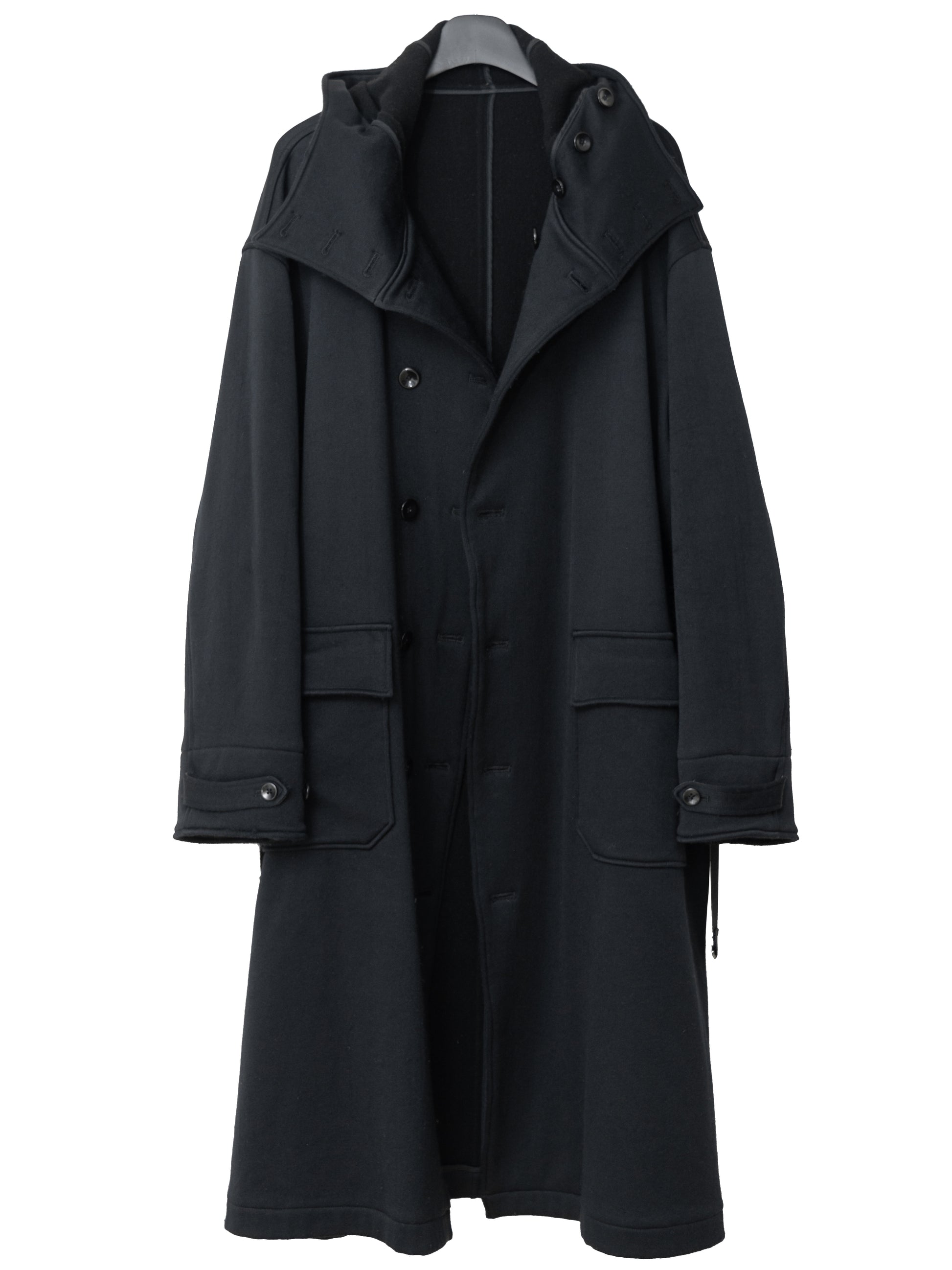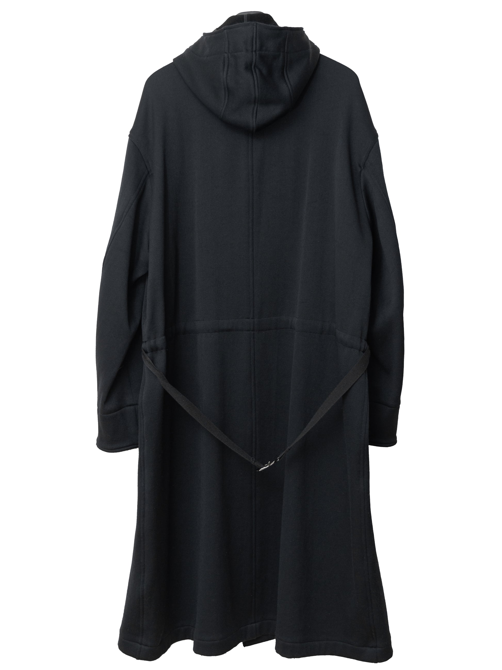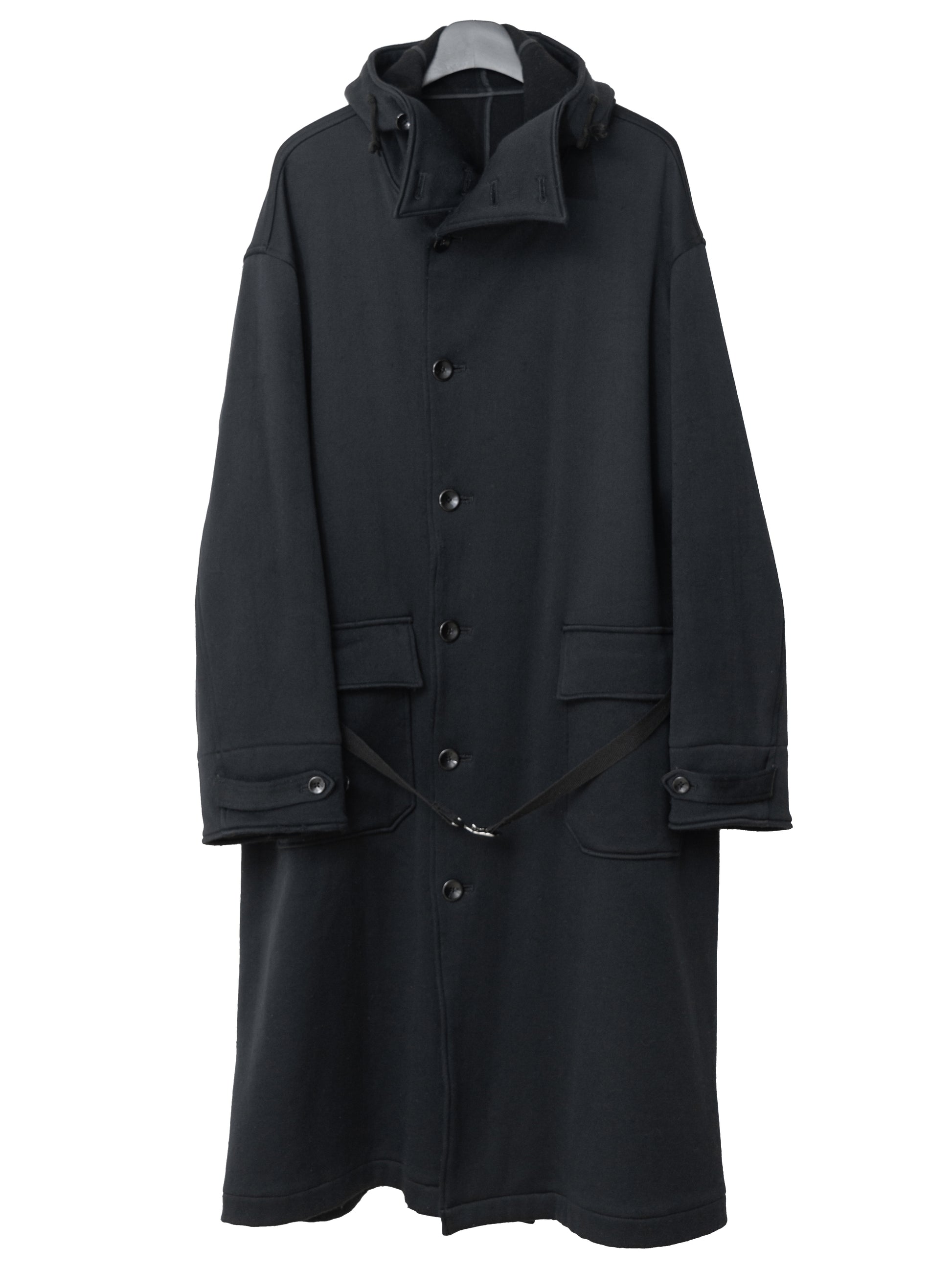 oversized military parka in heavyweight nylon wool. features a drawstring scuba hood, dropped shoulders, double breasted front with inner buttons, side pockets, cuff straps, and an adjustable clasp belt at back waist. unlined interior with fully finished bound seams.
