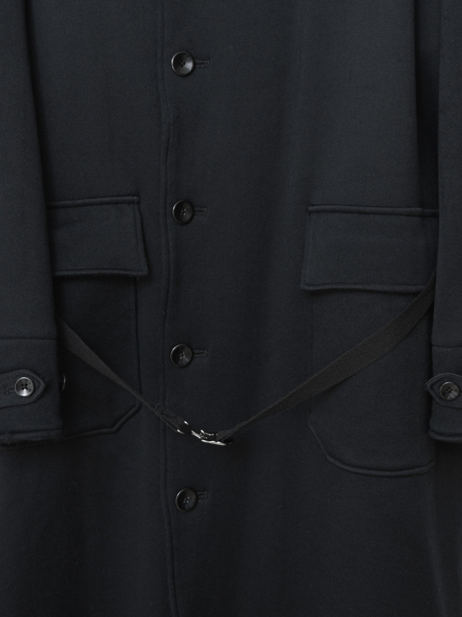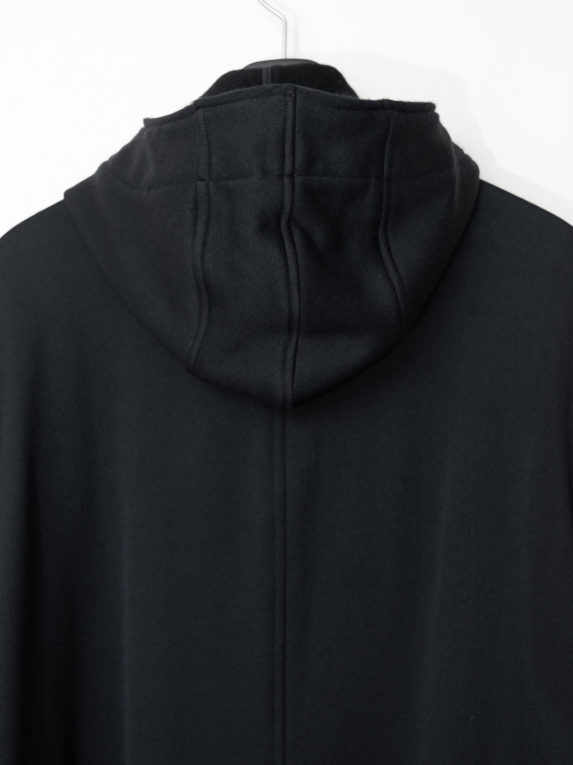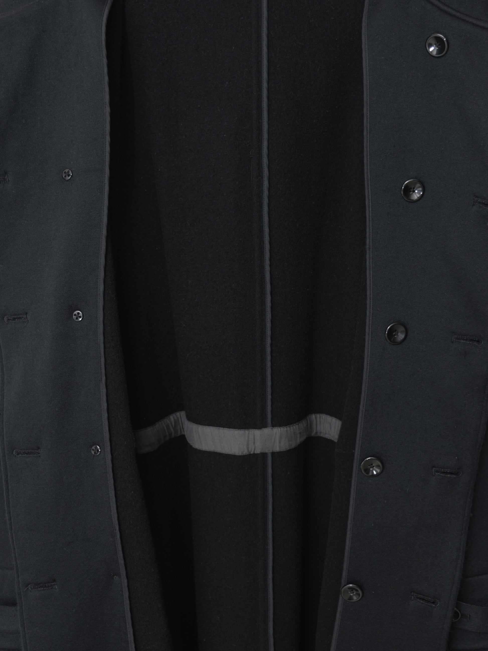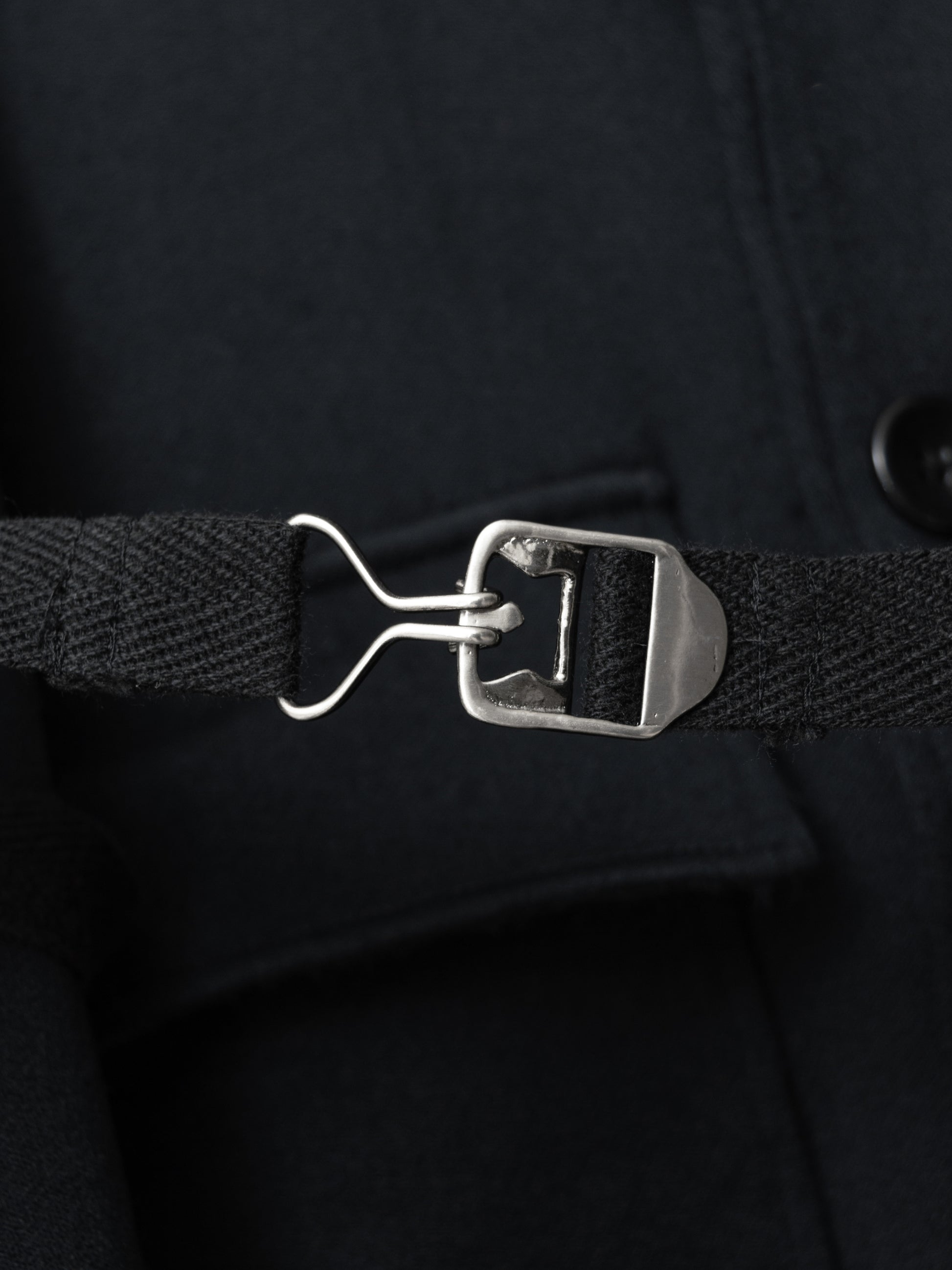 oversized military parka in heavyweight nylon wool. features a drawstring scuba hood, dropped shoulders, double breasted front with inner buttons, side pockets, cuff straps, and an adjustable clasp belt at back waist. unlined interior with fully finished bound seams.