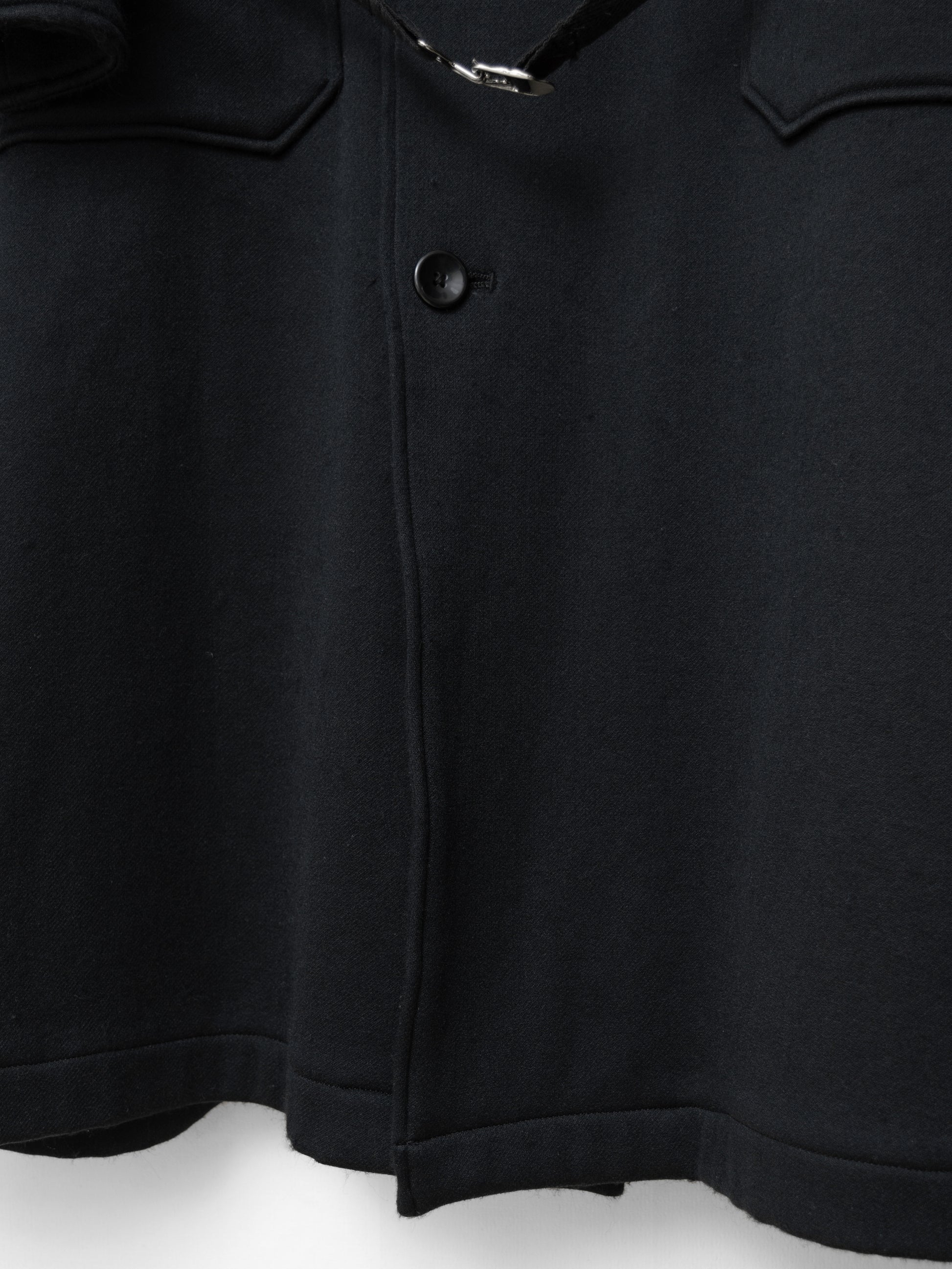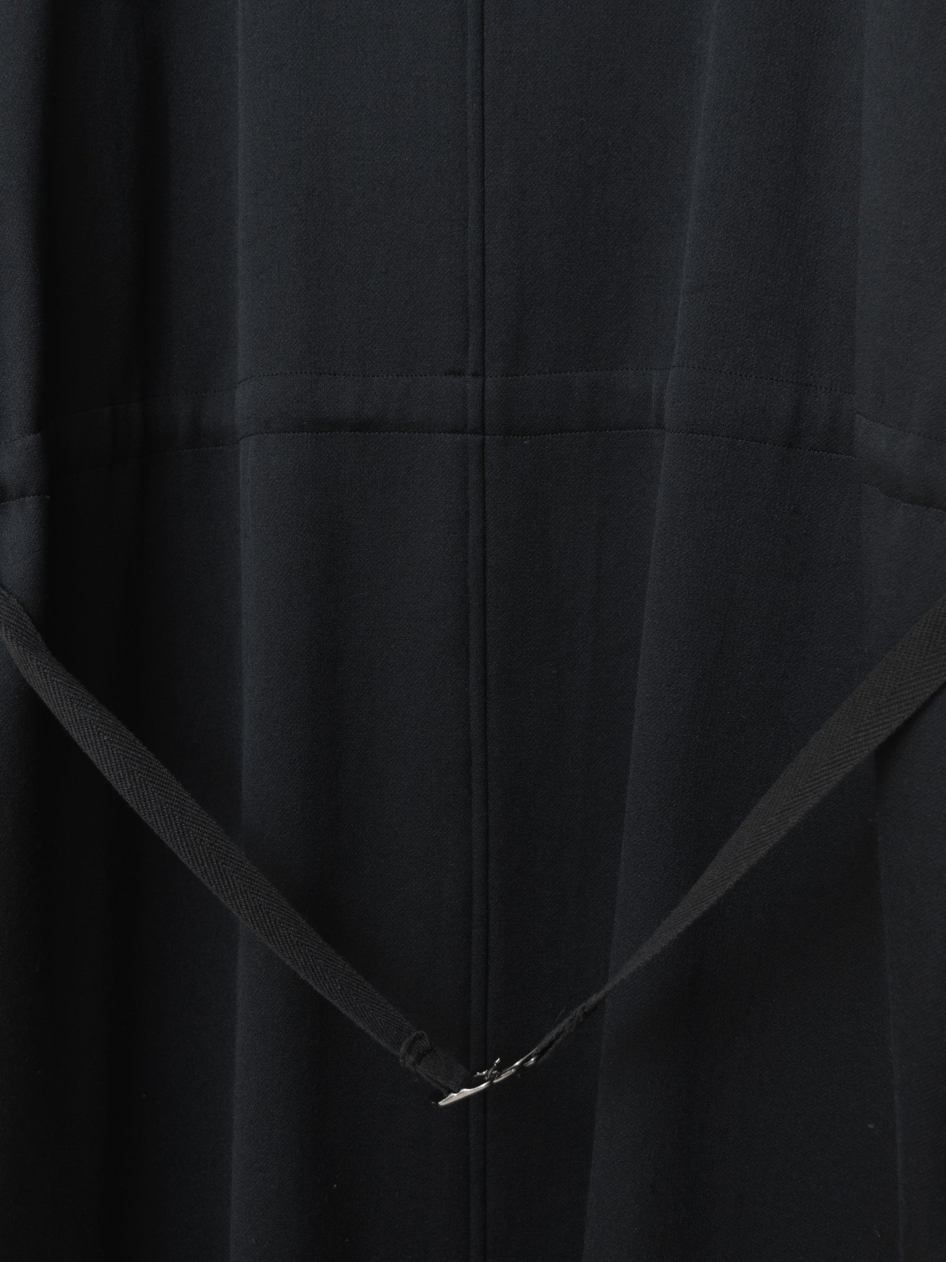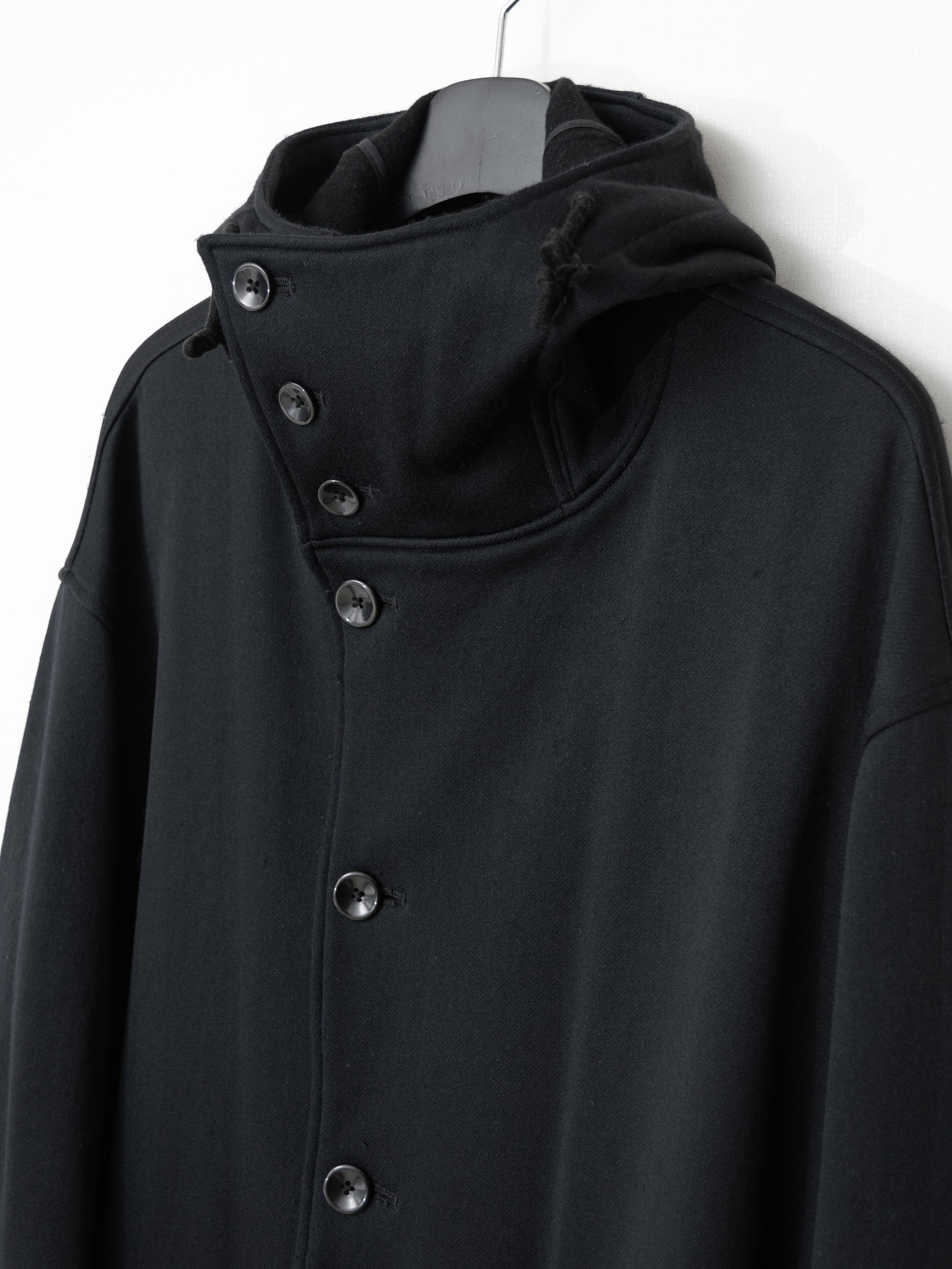 '90s masterpiece from y's for men based on the ww2 us army mountain corps parka. cut from a heavyweight double cloth fabric with a dense knit structure featuring a neoprene-like nylon face and a brushed wool backside for optimal interior warmth. impeccable cut with a voluminous a-line shape and sweeping lines that drop off the shoulder. the buttons at the hood allow for a variety of ways to style. the integrated herringbone tape clasp belt at waist can be worn at the front, back, or left hanging at the sides and also allows for change in silhouette. plenty of room to layer underneath, so much that other coats can be worn under it for extreme winter conditions. tagged size large, recommended for size medium and up.