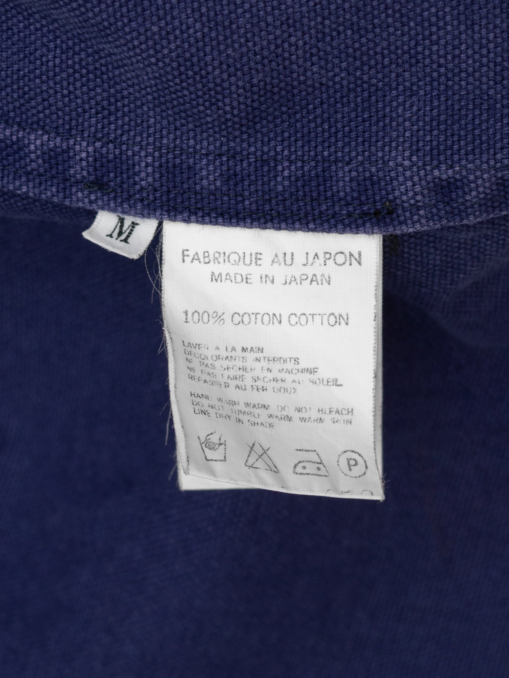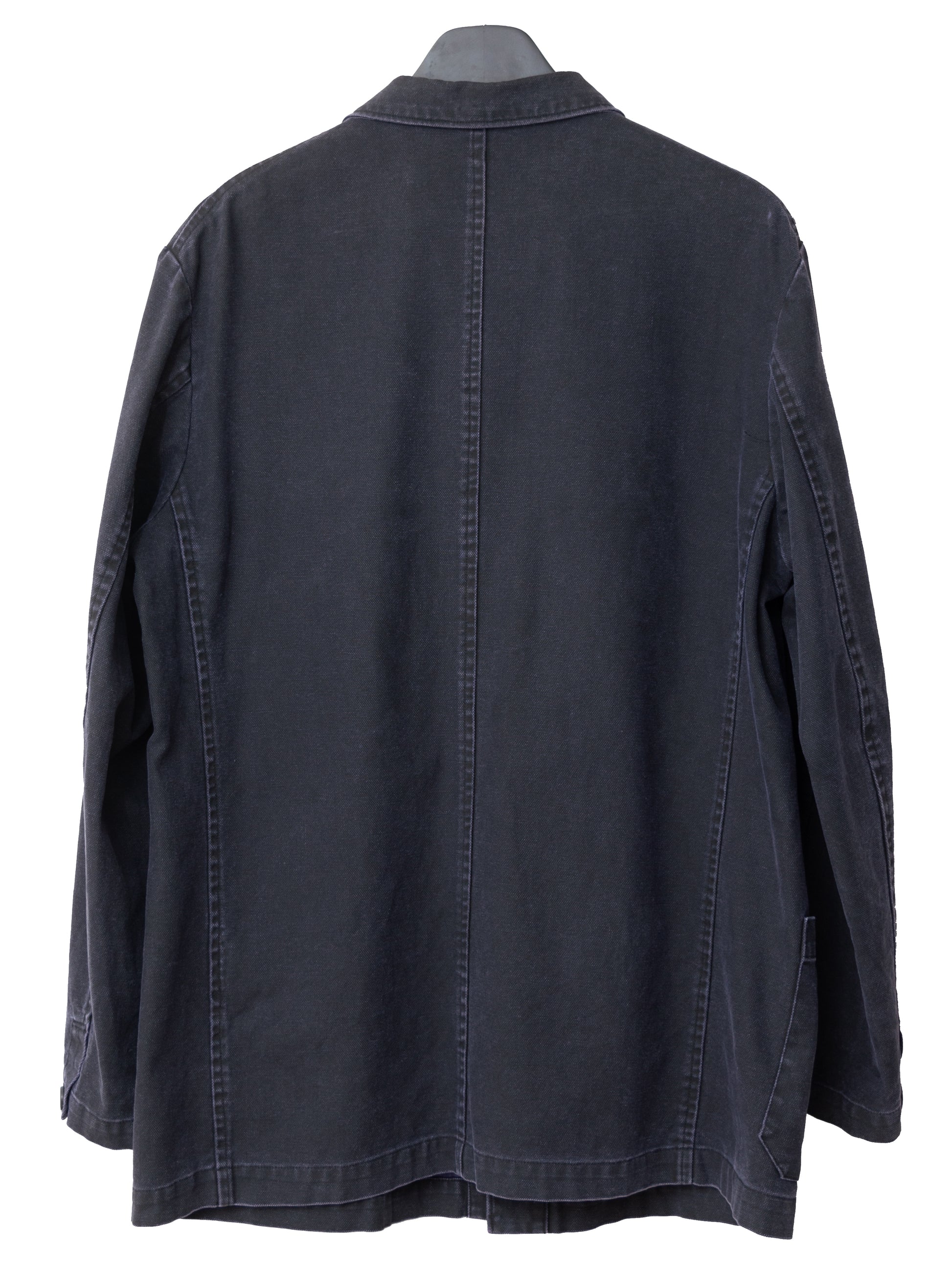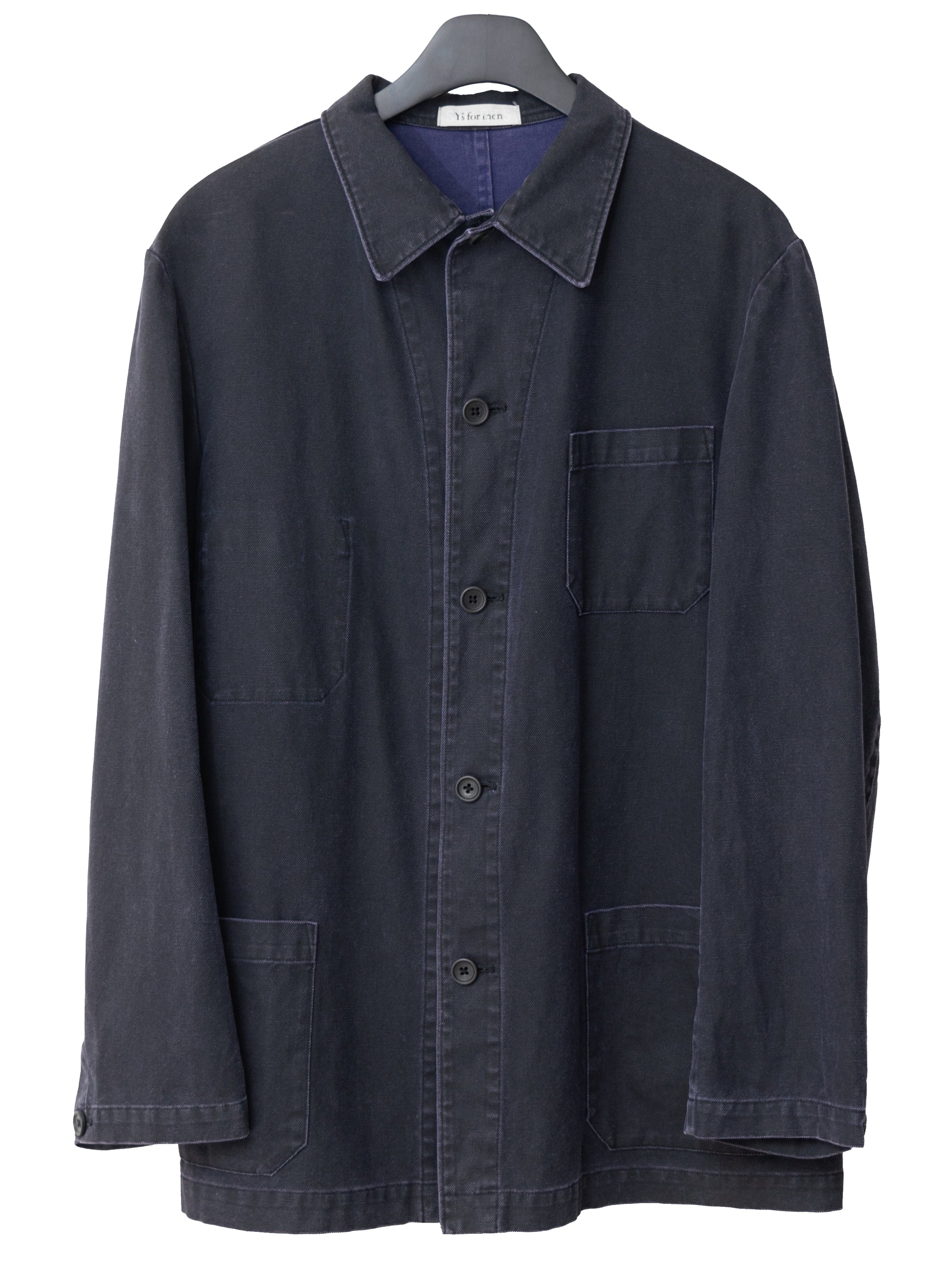 '90s piece from the elusive y's for men SHIRTS line with a european workwear sensibility. very special cotton duck canvas that has been pigment printed navy atop an eggplant colored base. it has then been whole garment stonewashed for a worn in appearance, and will further reveal the color underneath with repeated wear and wash like a pair of denim. beautiful, deep expression of color in a distinctive dry navy with a purple tint. excellent year-round wearability that layers well both under and over other collared garments. if you have one chore jacket in your wardrobe, make it this one. recommended for size medium or small.