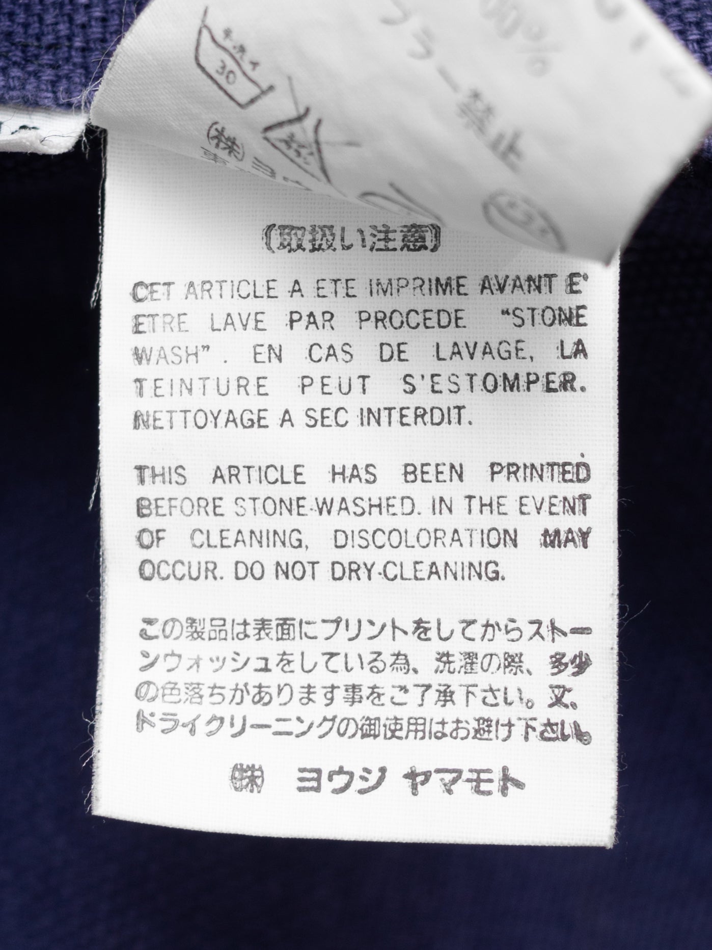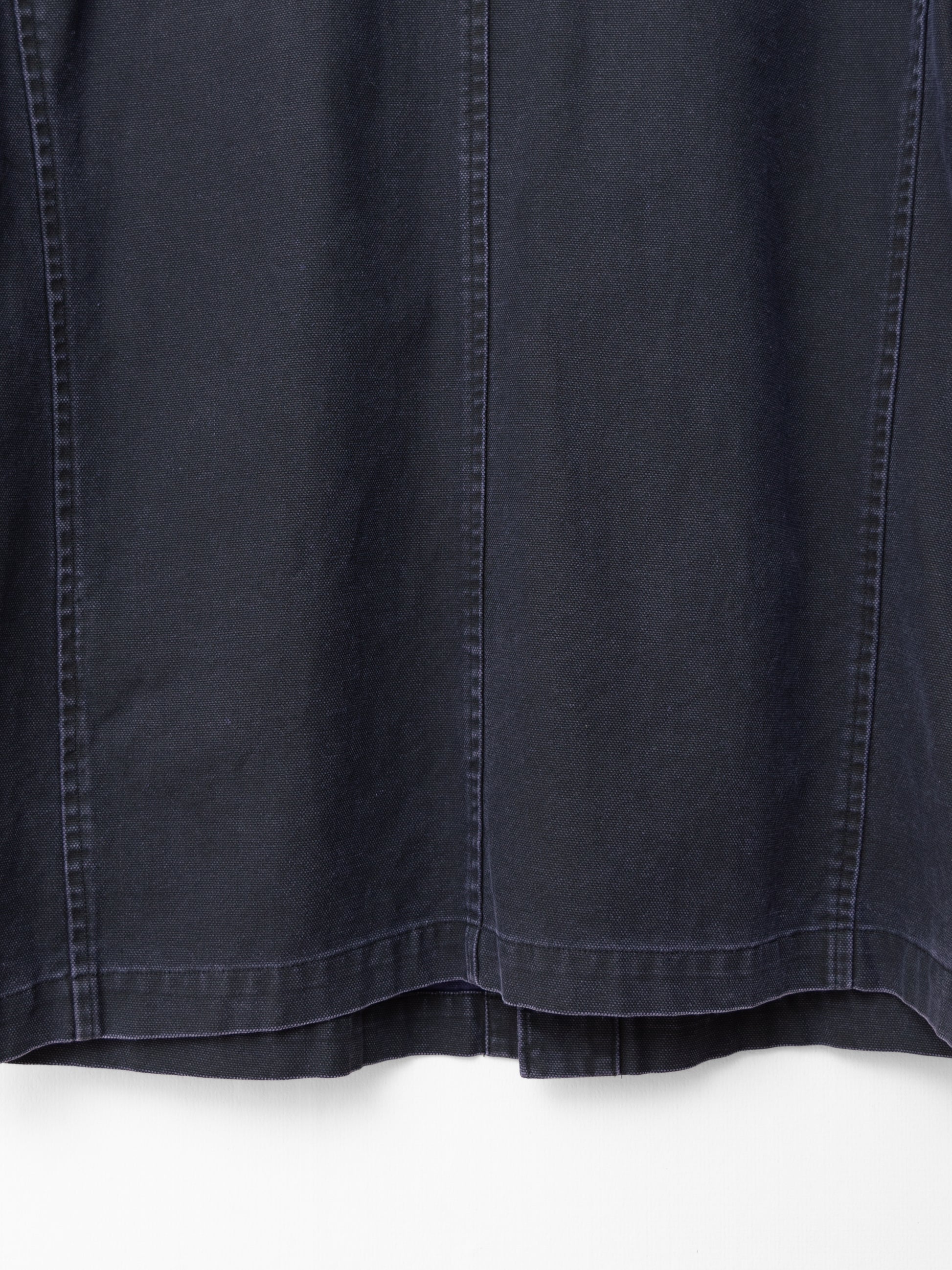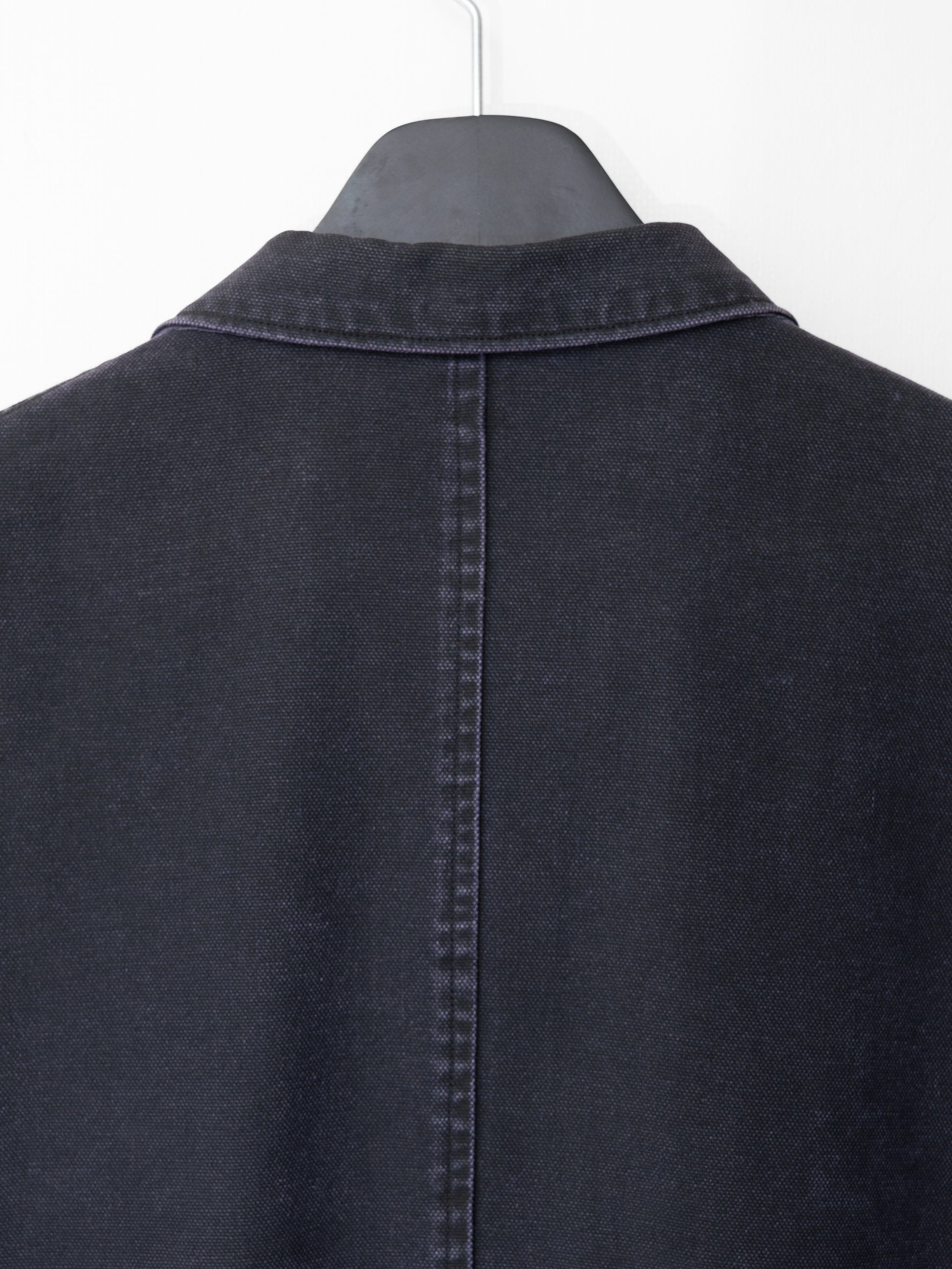 '90s piece from the elusive y's for men SHIRTS line with a european workwear sensibility. very special cotton duck canvas that has been pigment printed navy atop an eggplant colored base. it has then been whole garment stonewashed for a worn in appearance, and will further reveal the color underneath with repeated wear and wash like a pair of denim. beautiful, deep expression of color in a distinctive dry navy with a purple tint. excellent year-round wearability that layers well both under and over other collared garments. if you have one chore jacket in your wardrobe, make it this one. recommended for size medium or small.