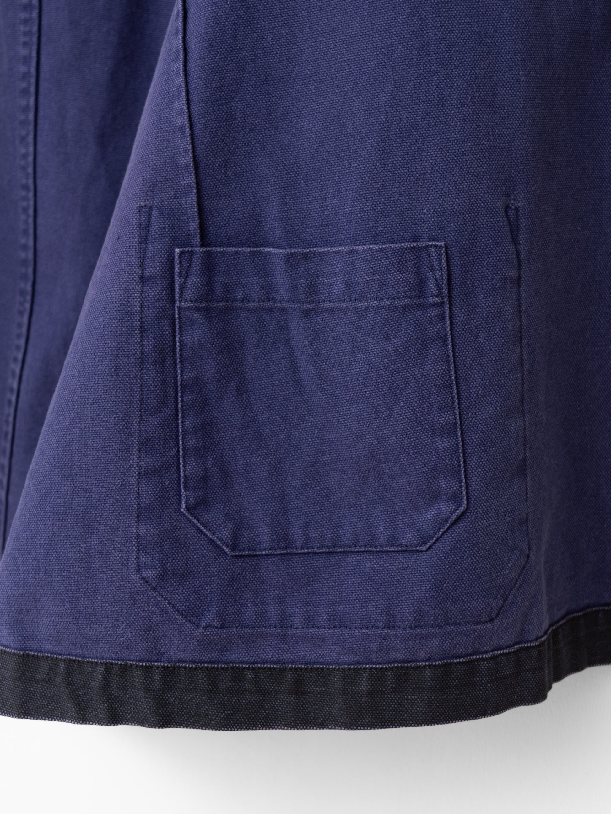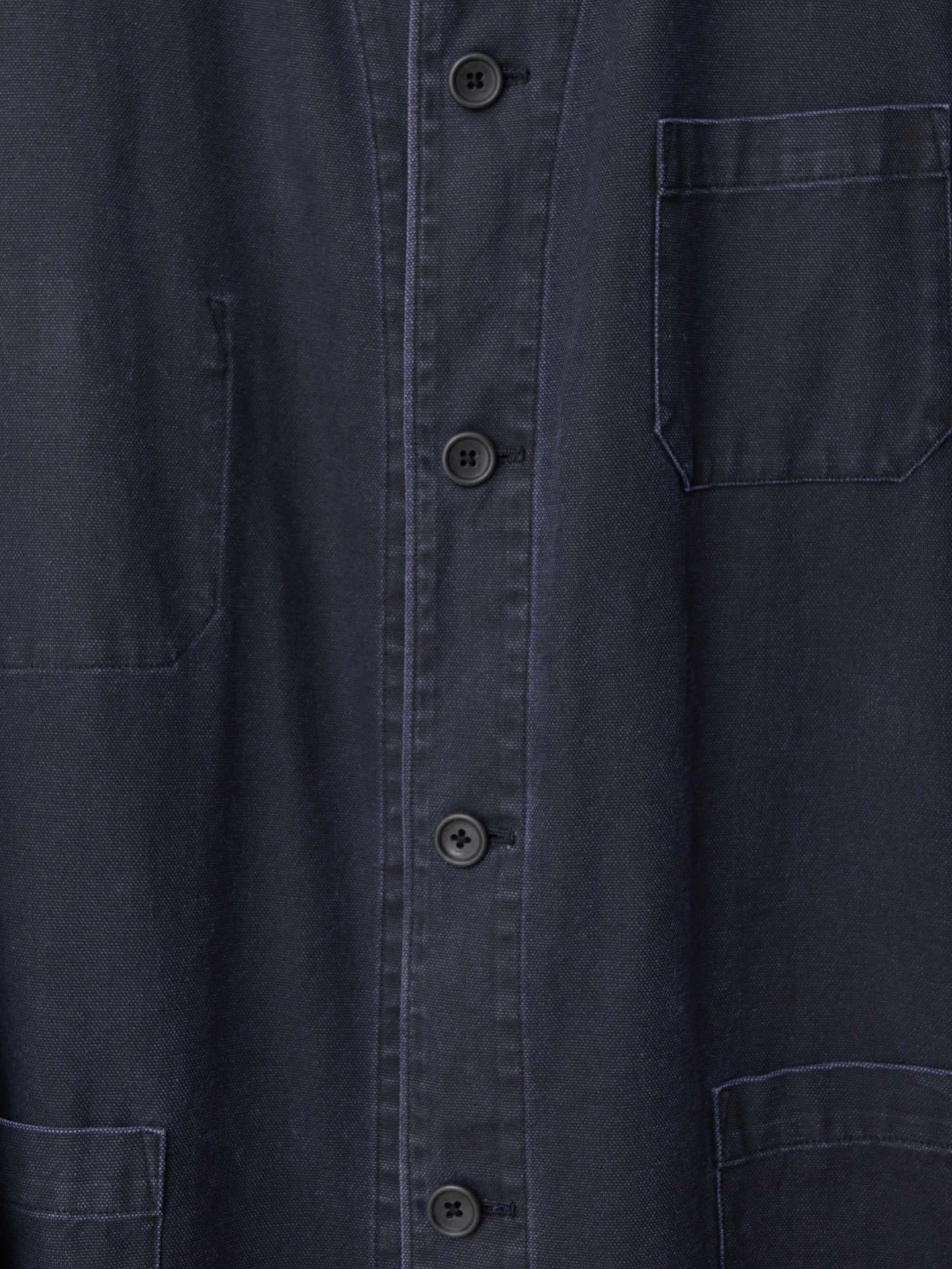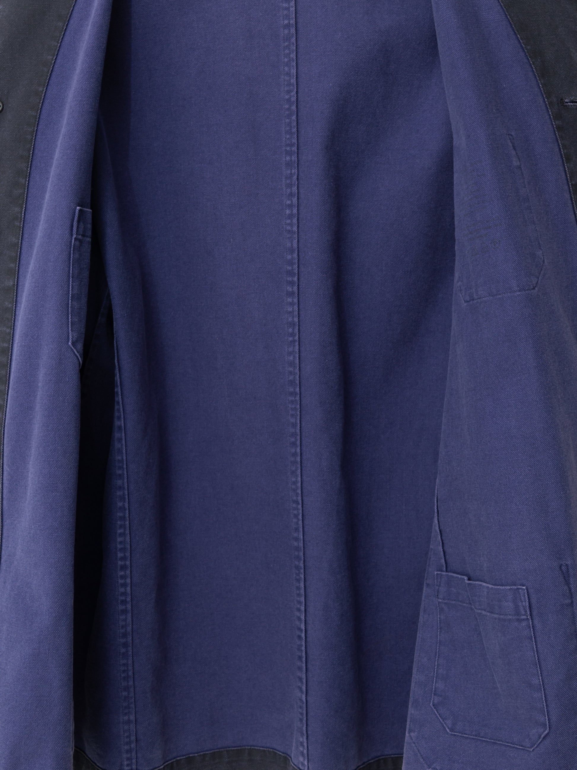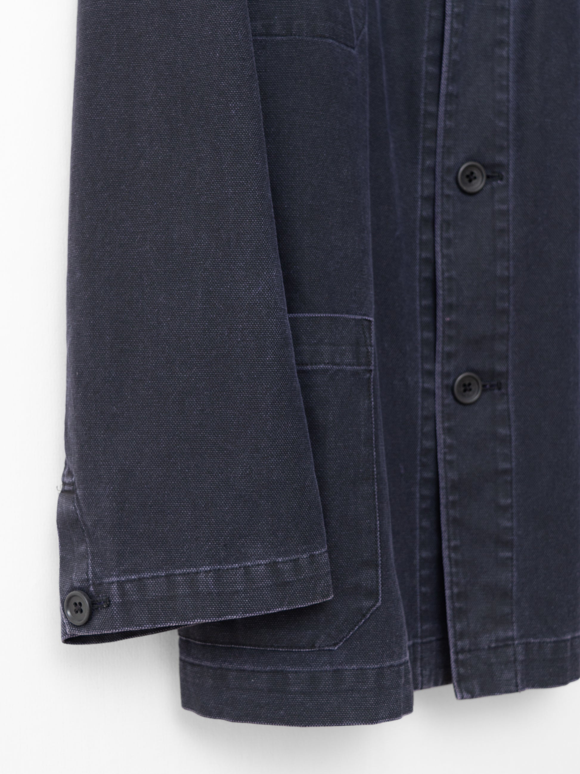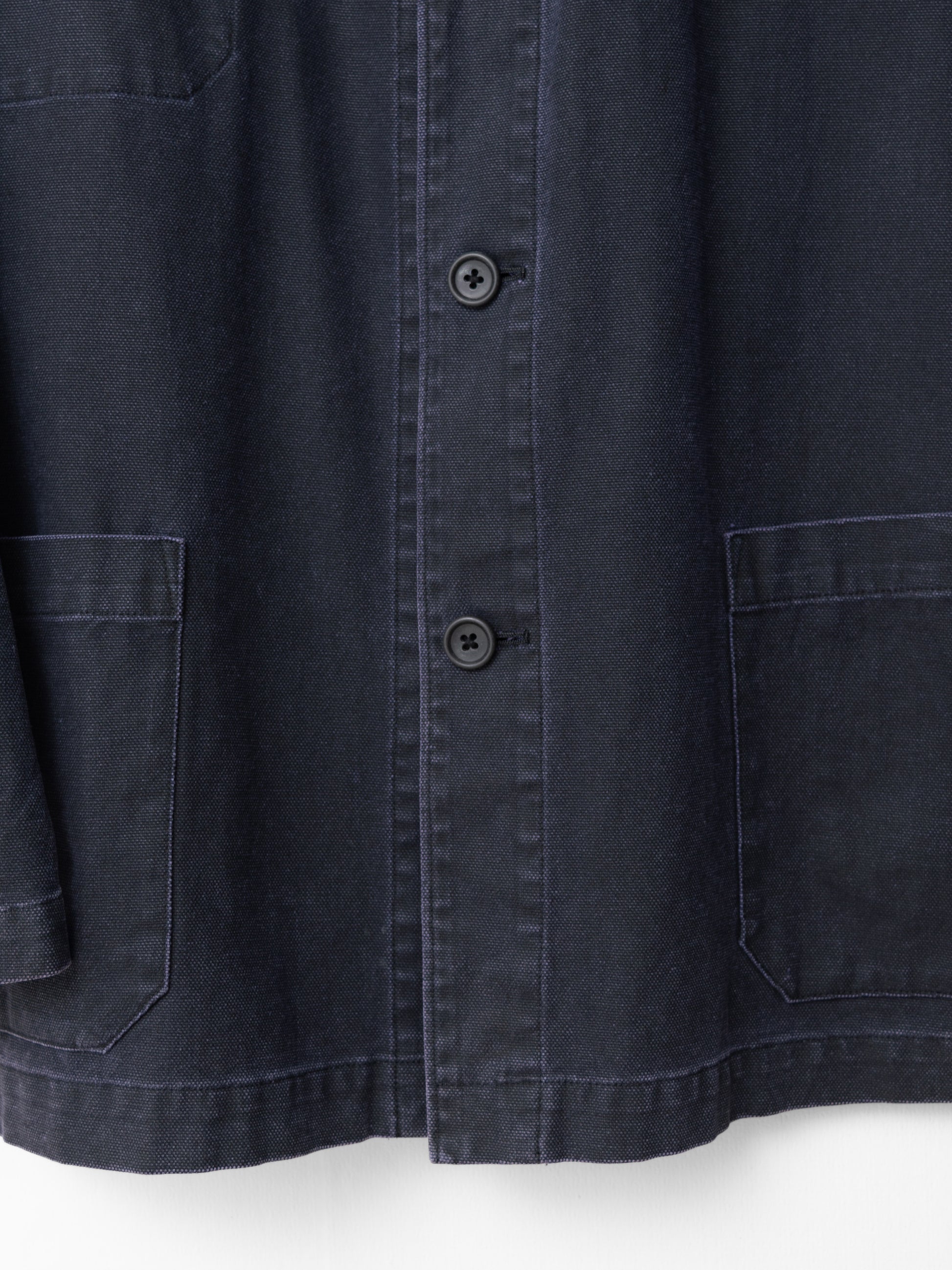 relaxed cut coverall jacket in heavyweight cotton canvas with pigment dye printed surface. features single buttoned cuffs and 3 outer / 3 inner patch pockets. unlined interior with fully finished seams and bias bound armholes.