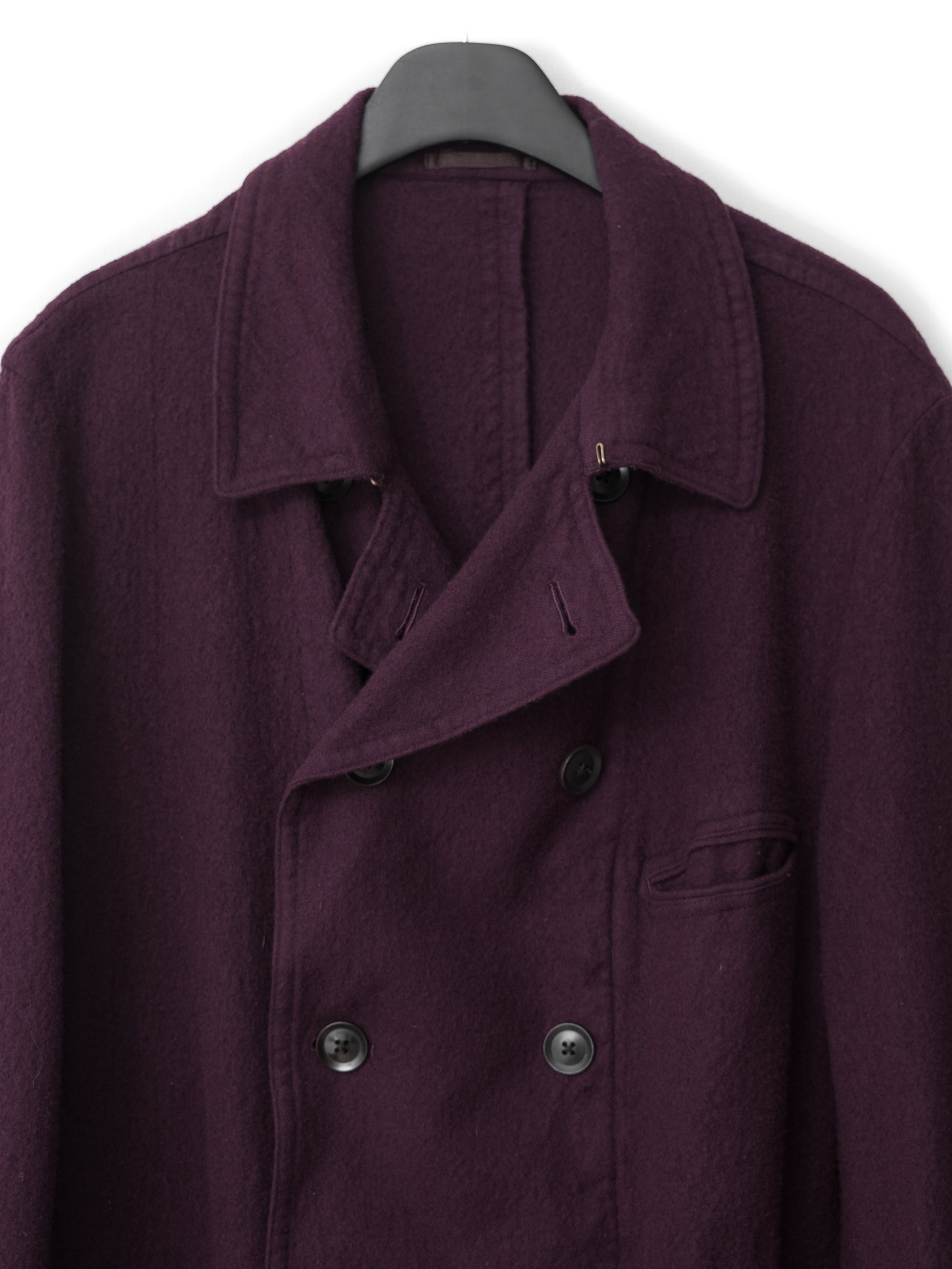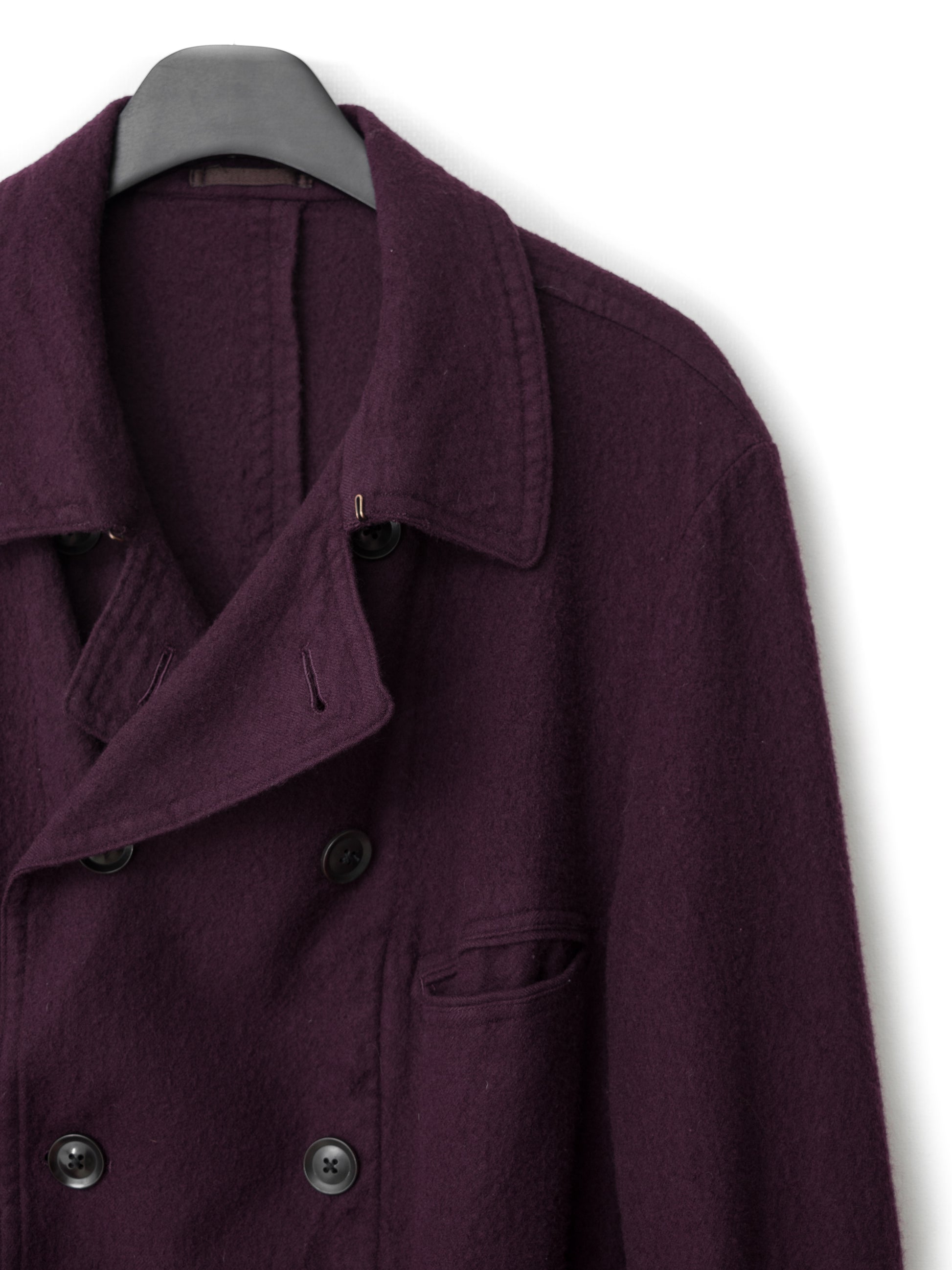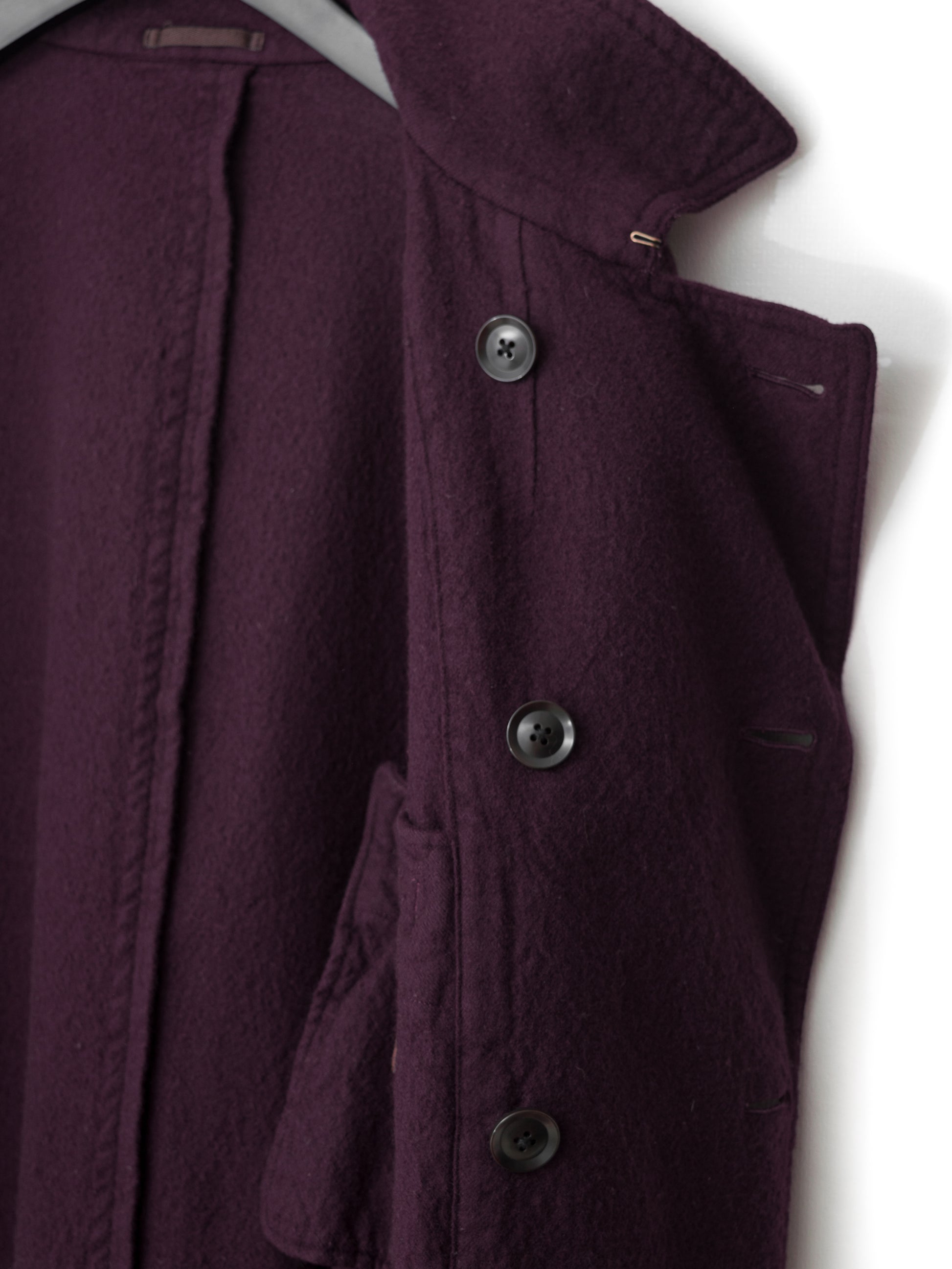 relaxed cut peacoat in heavyweight wool. processed with a fulling treatment to slightly shrink and compress the fabric and garment for a unique texture and silhouette. features a convertible double breasted front and a curved hem with a raised back for a beautiful profile shape. constructed with slight drop shoulders, a hook collar closure, and double welt chest and side pockets. finished with deep brown horn buttons. warm winterweight layer in a gorgeous tone of deep mulberry wine.