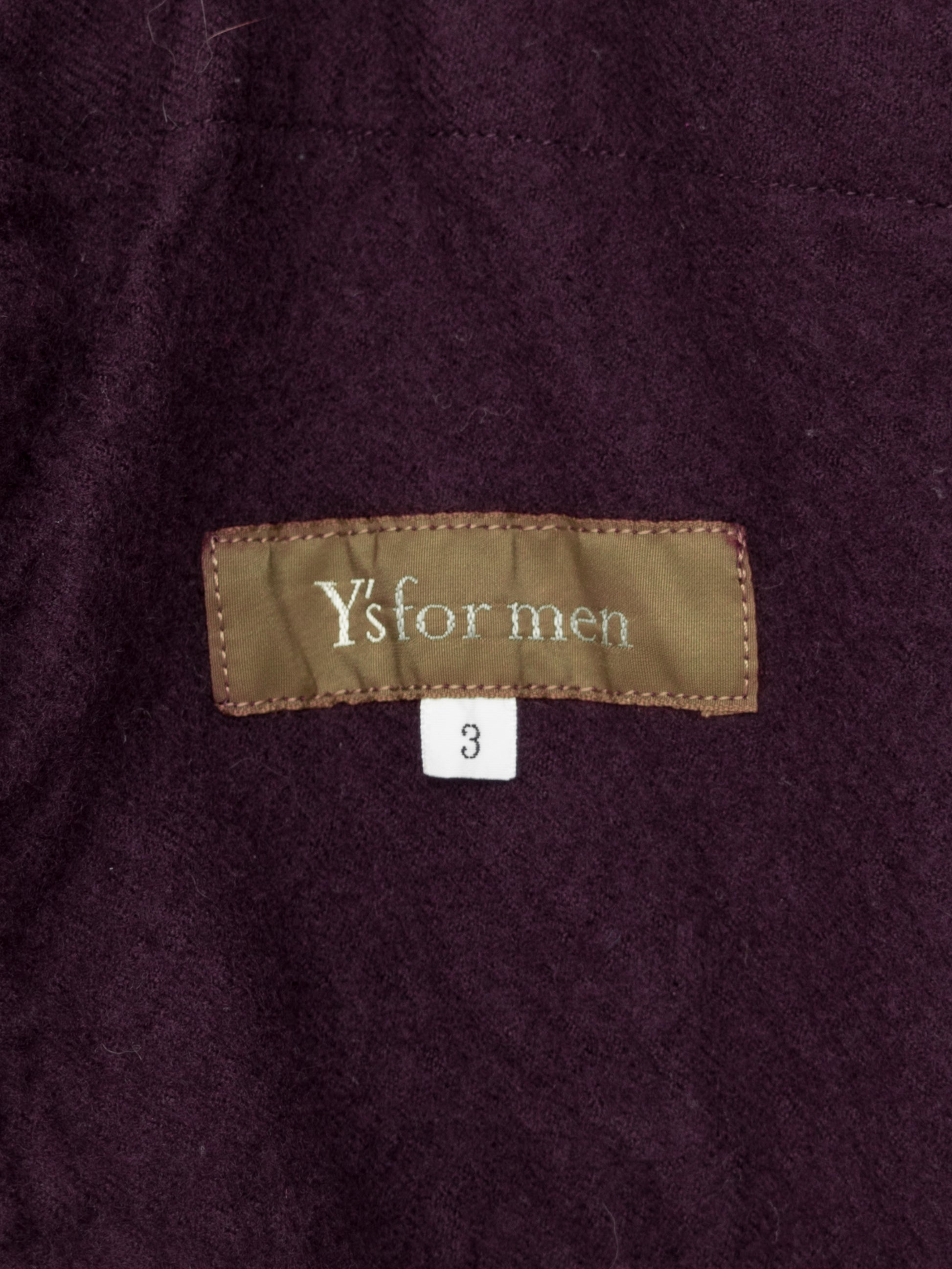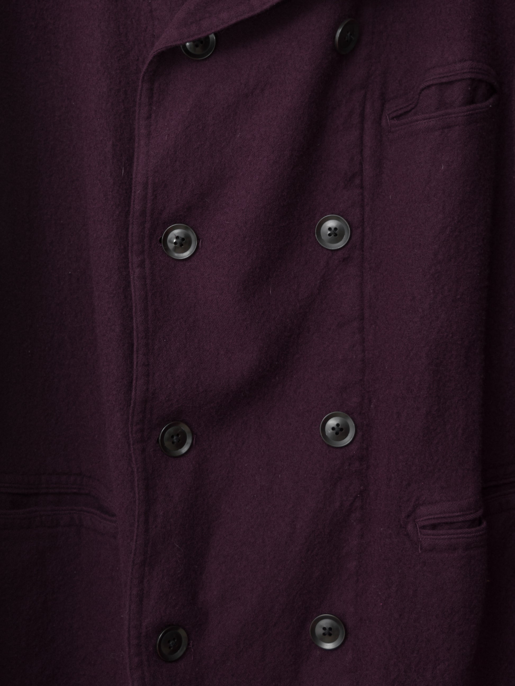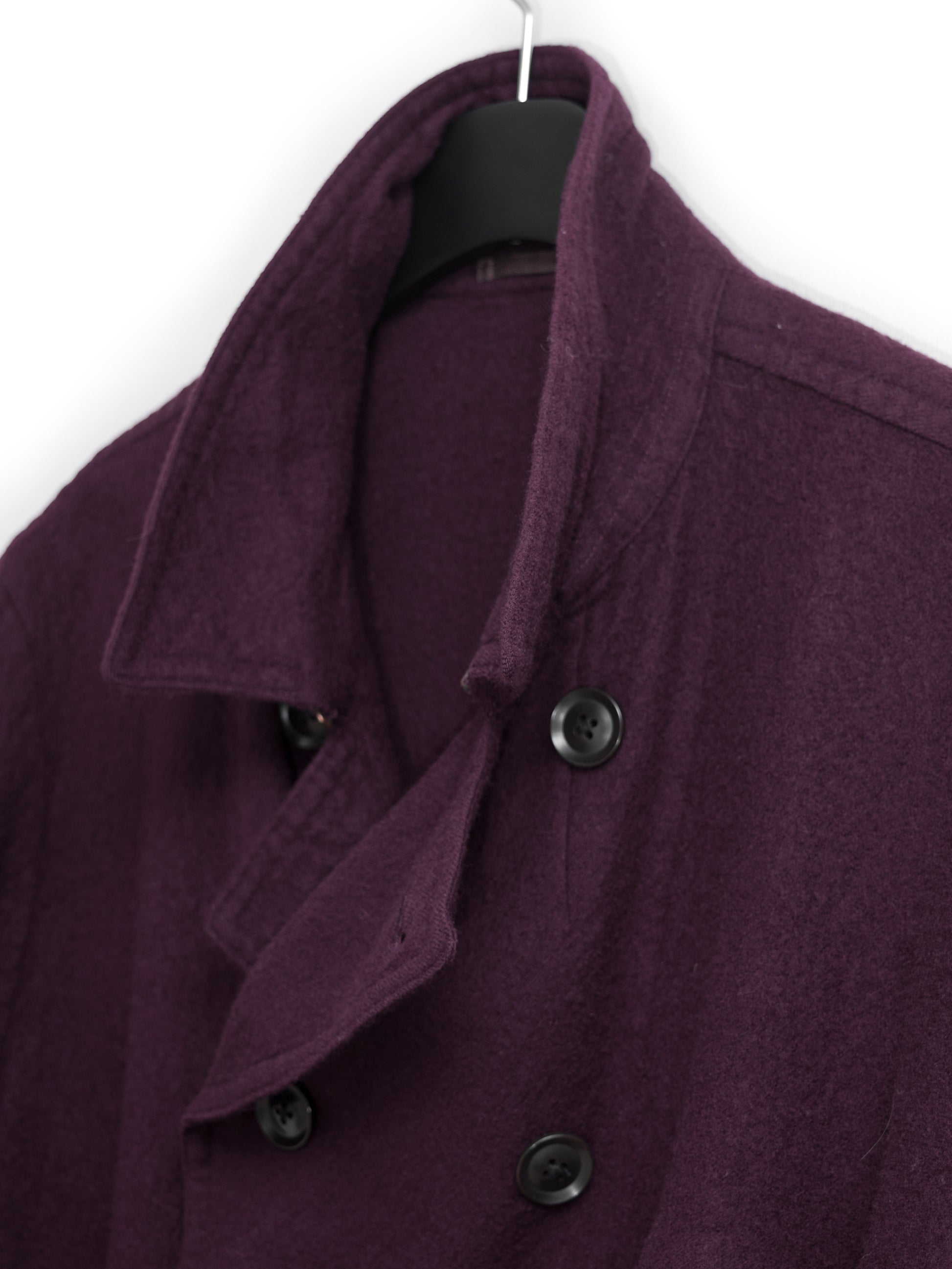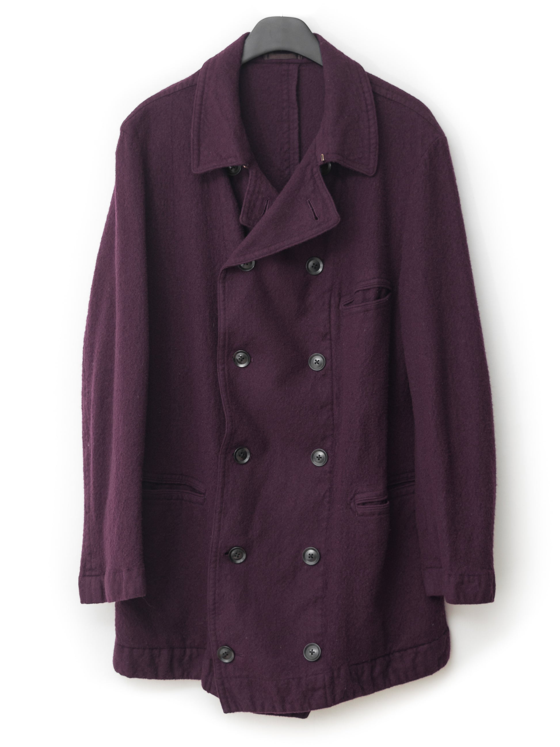 relaxed cut peacoat in heavyweight wool. processed with a fulling treatment to slightly shrink and compress the fabric and garment for a unique texture and silhouette. features a convertible double breasted front and a curved hem with a raised back for a beautiful profile shape. constructed with slight drop shoulders, a hook collar closure, and double welt chest and side pockets. finished with deep brown horn buttons. warm winterweight layer in a gorgeous tone of deep mulberry wine.