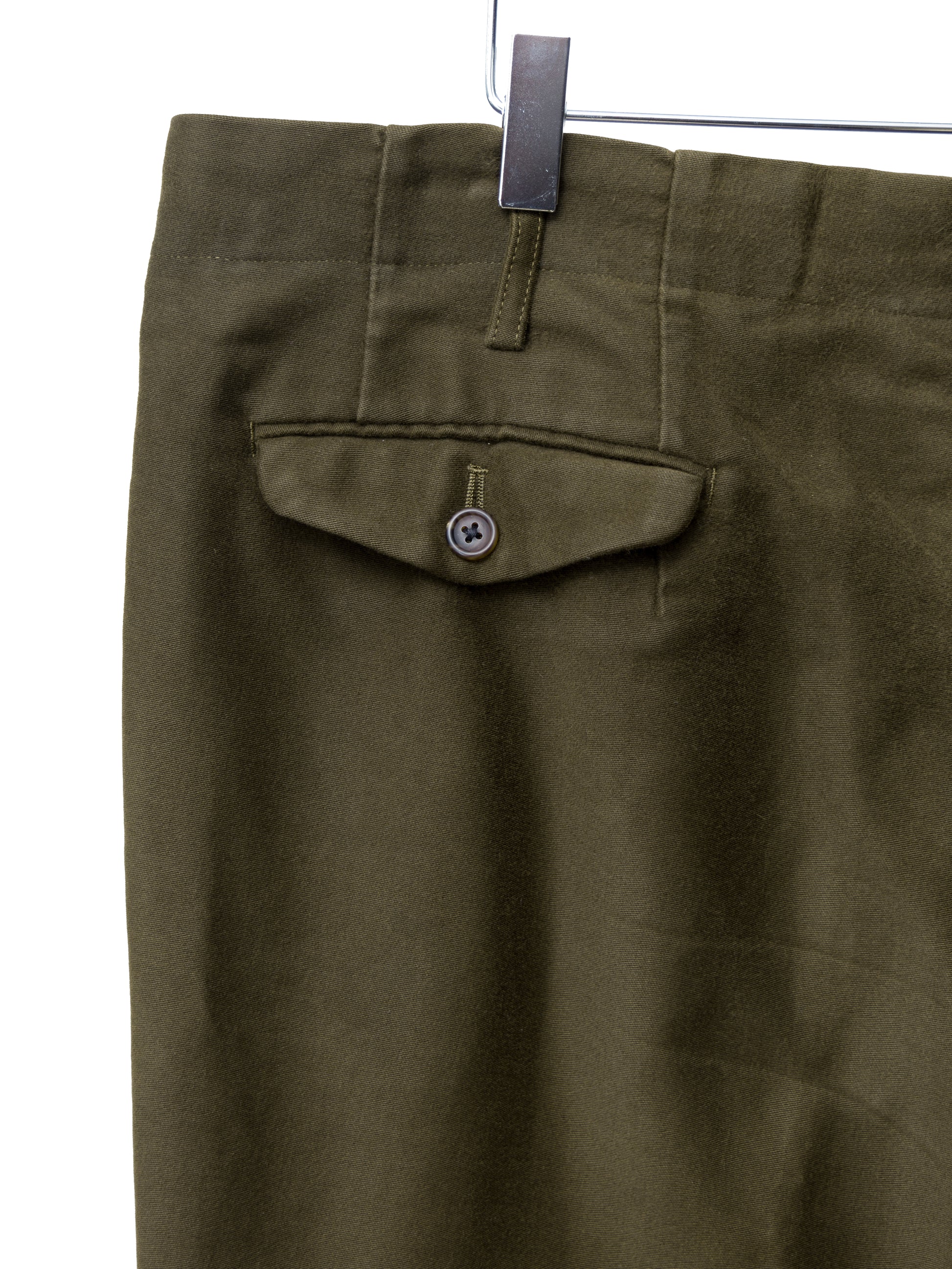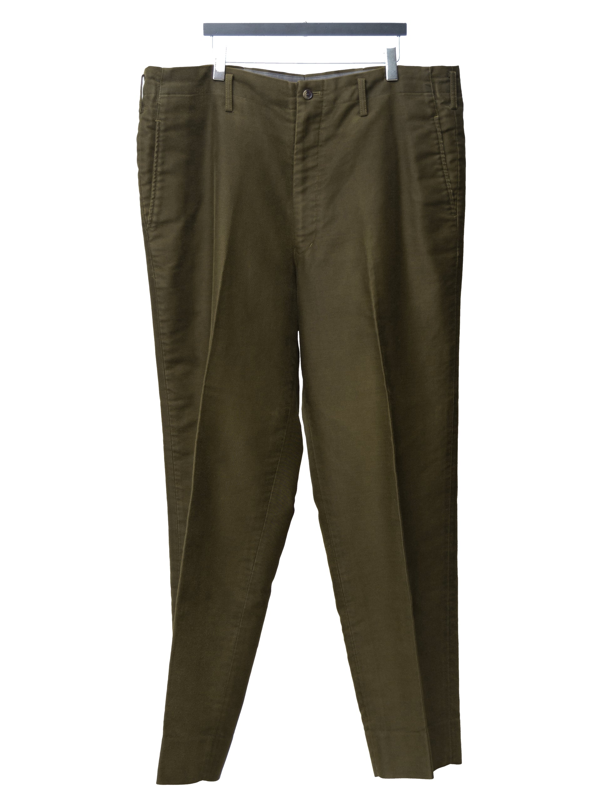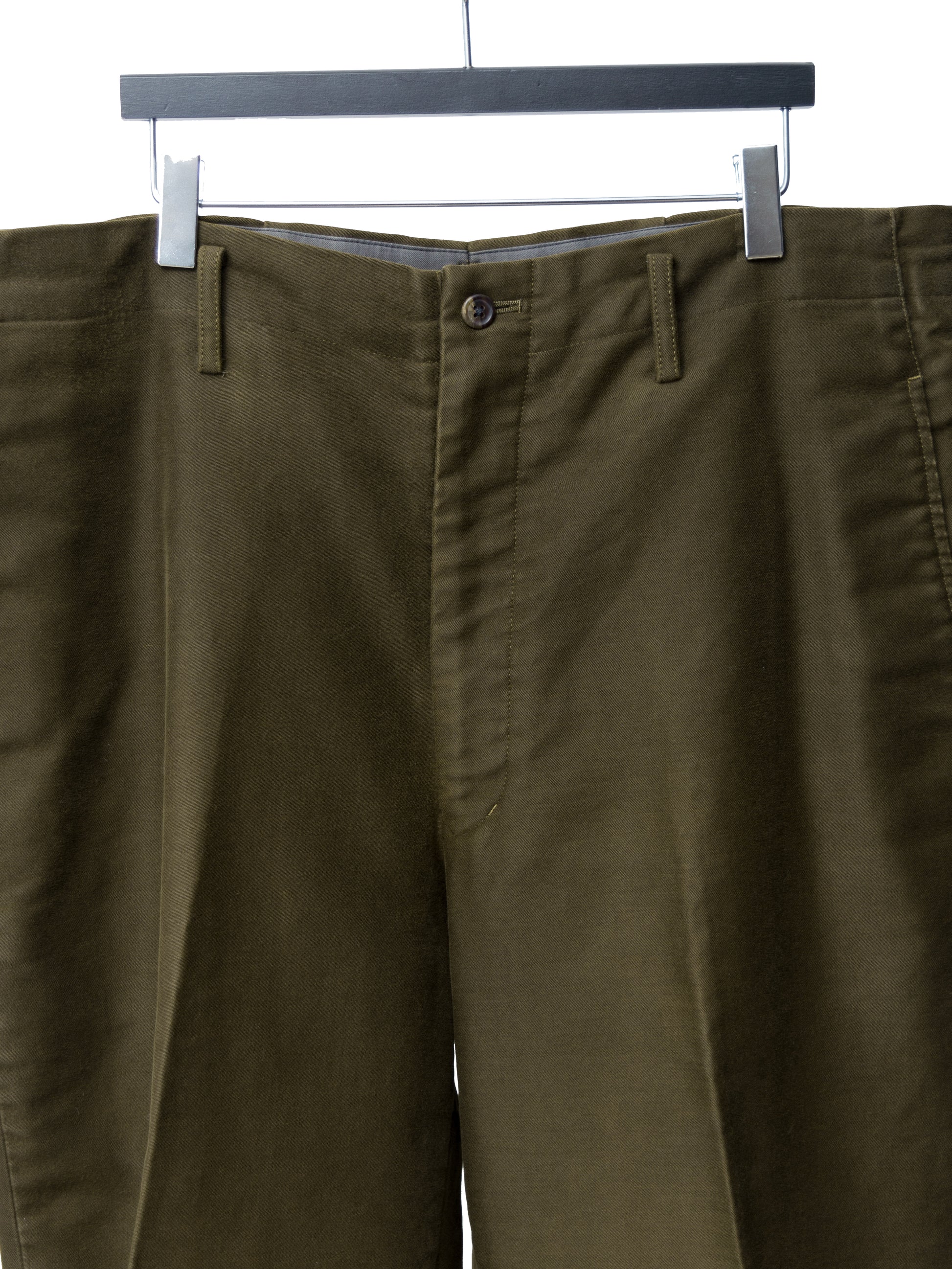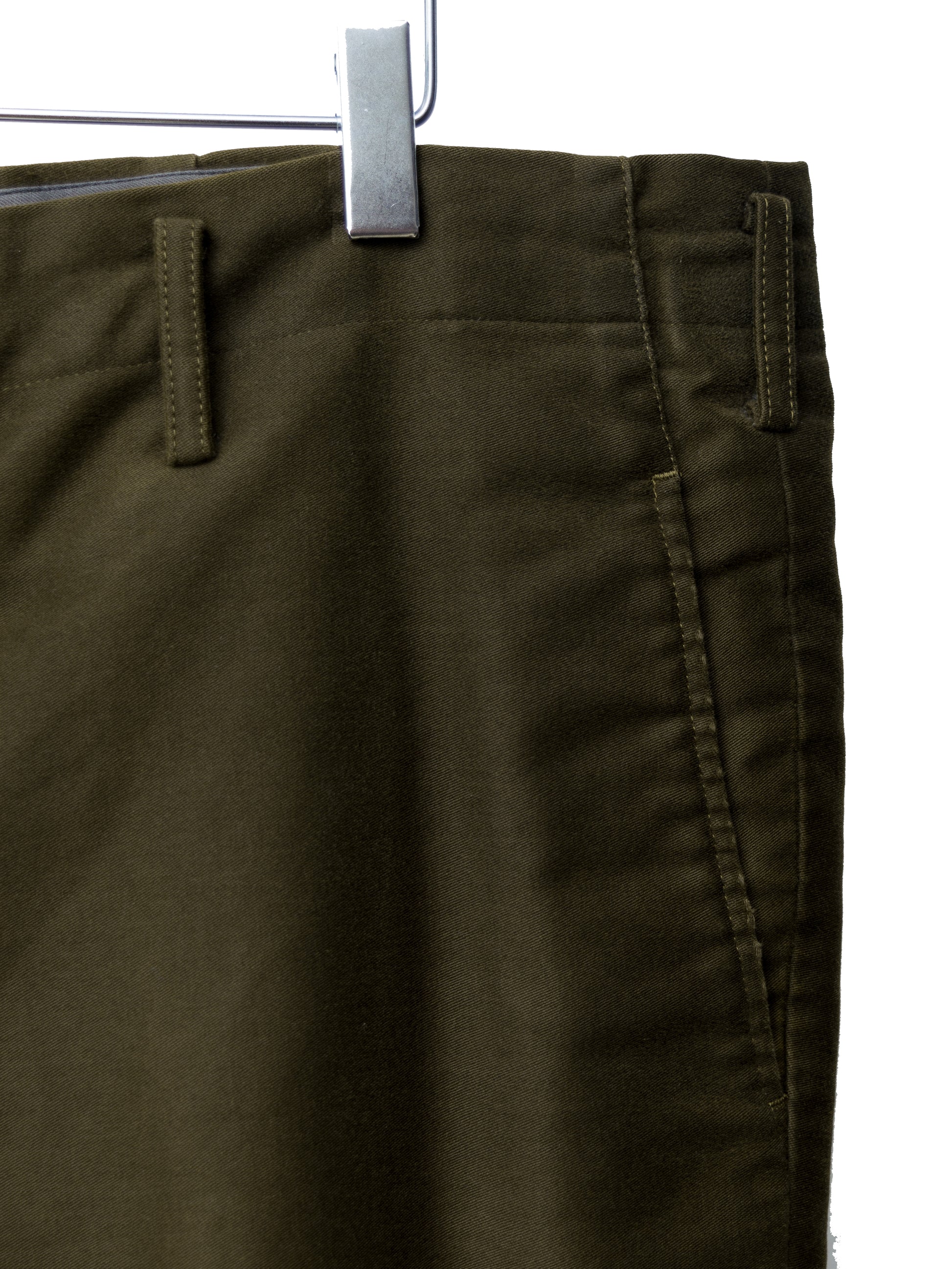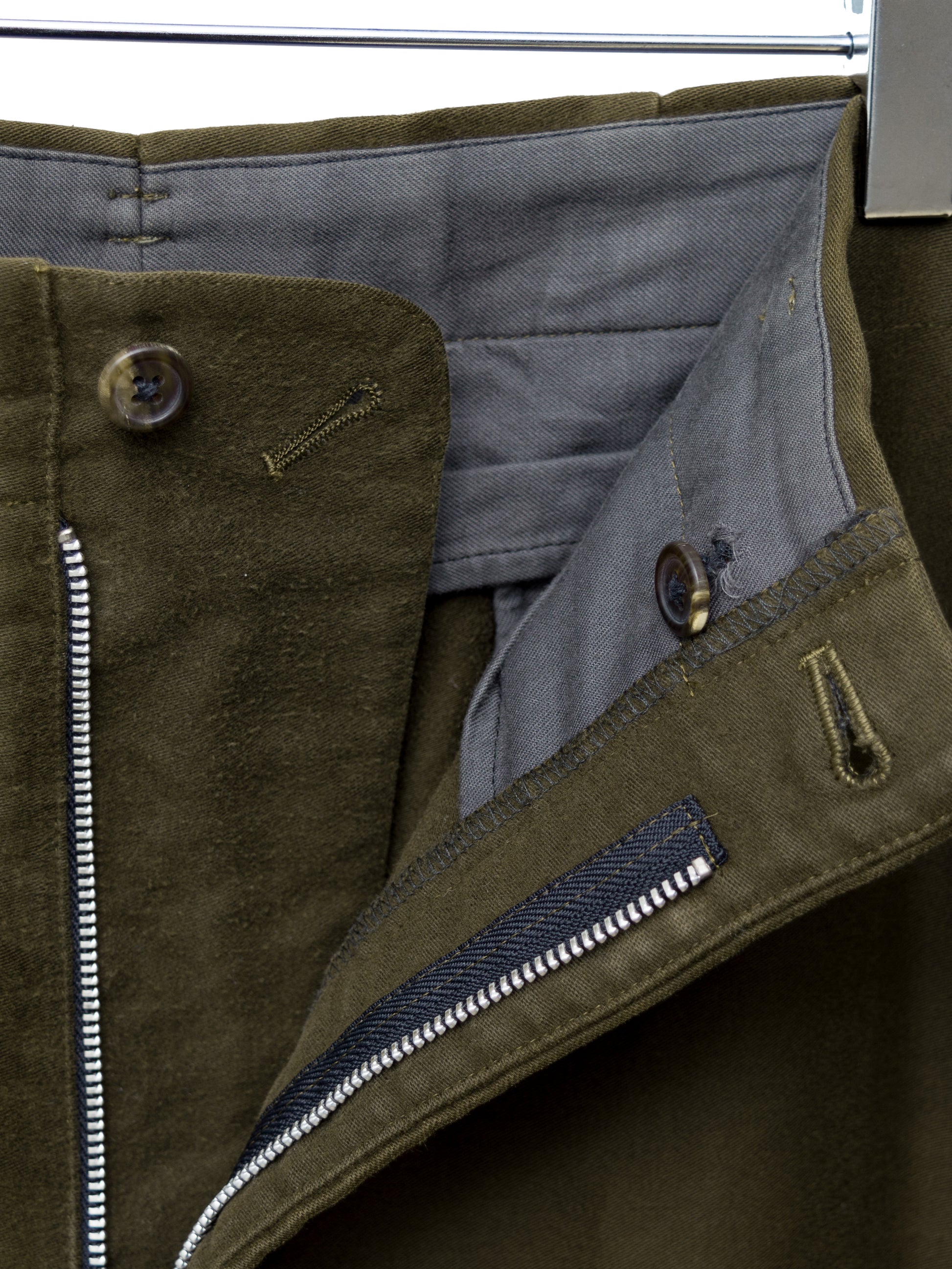 wide cut trousers in heavyweight cotton moleskin. densely woven, olive-tinged brown fabric with a heavily brushed, soft surface texture and a slightly lustrous appearance. cut with a wide paperbag waist (meant to fit to your desired size with a belt), a high rise, a loose, tapered leg with regular length. features 4 pocket configuration, zip fly, and horn buttons. 6 cm of the bottom hem can be let out if desired for a longer length.